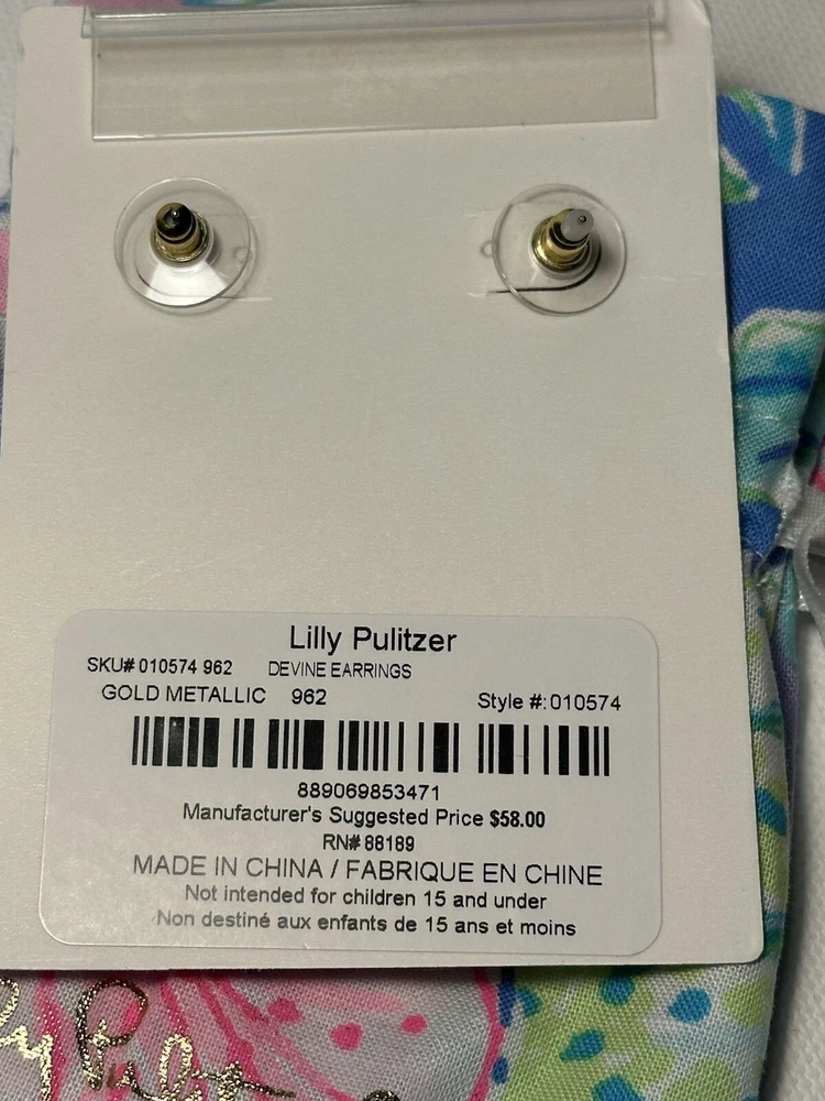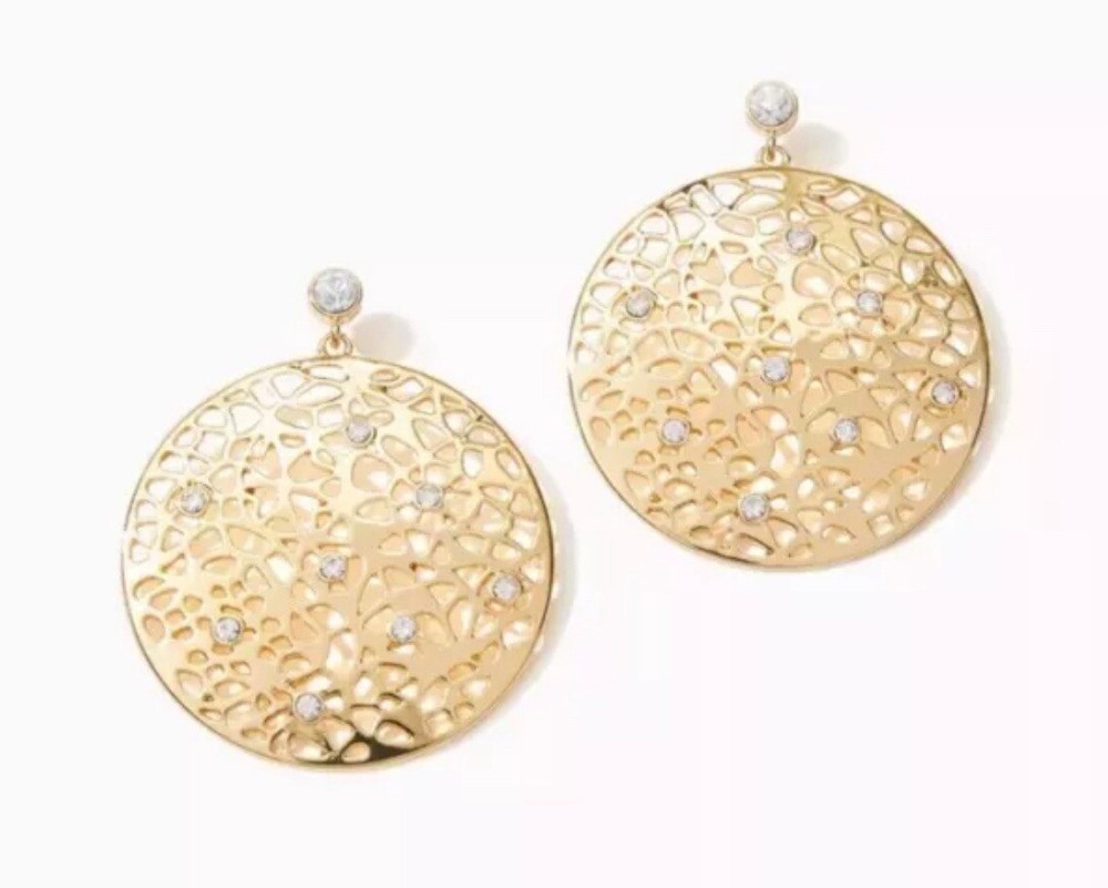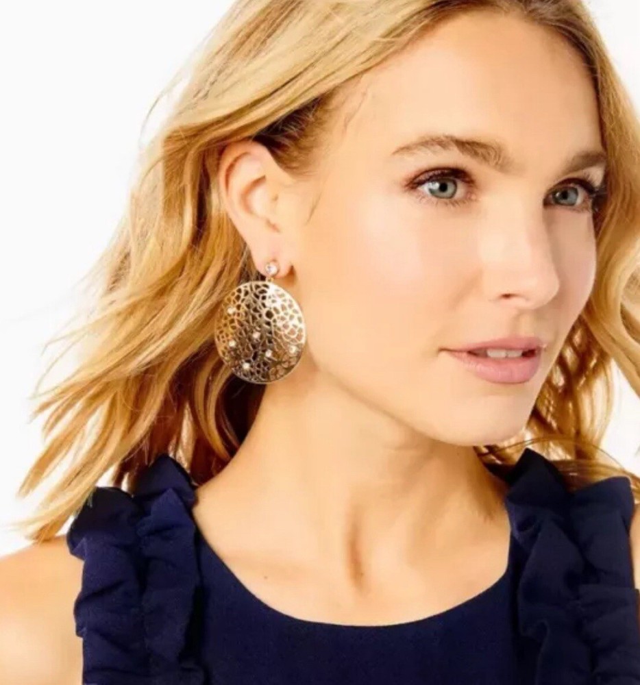 Elevate your style with these stunning Lilly Pulitzer Devine Gold Metallic Drop Earrings. The round white/colorless crystal stones are beautifully set in gold tone metal with intricate lace detailing. Includes a Lilly cloth pouch