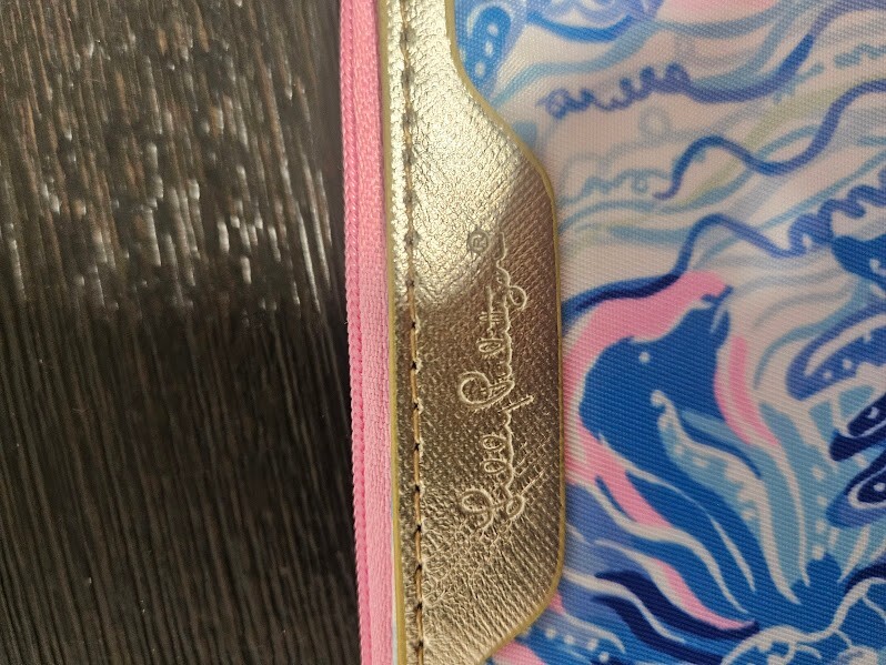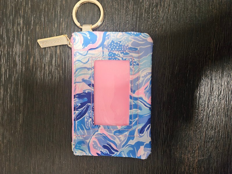 Crafted for the fashion-conscious individual, this Lilly Pulitzer Wallet embodies elegance and practicality. Encased in a lustrous gold tone, its zip-around style ensures your essentials are secure and organized. The wallet is designed to cater to everyday needs, featuring dedicated credit card slots for easy access.Accented with a chic blue character detail, this accessory is not just a wallet, but a statement piece.