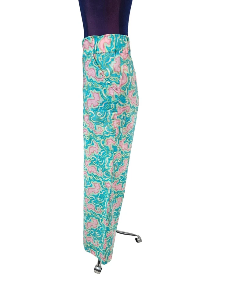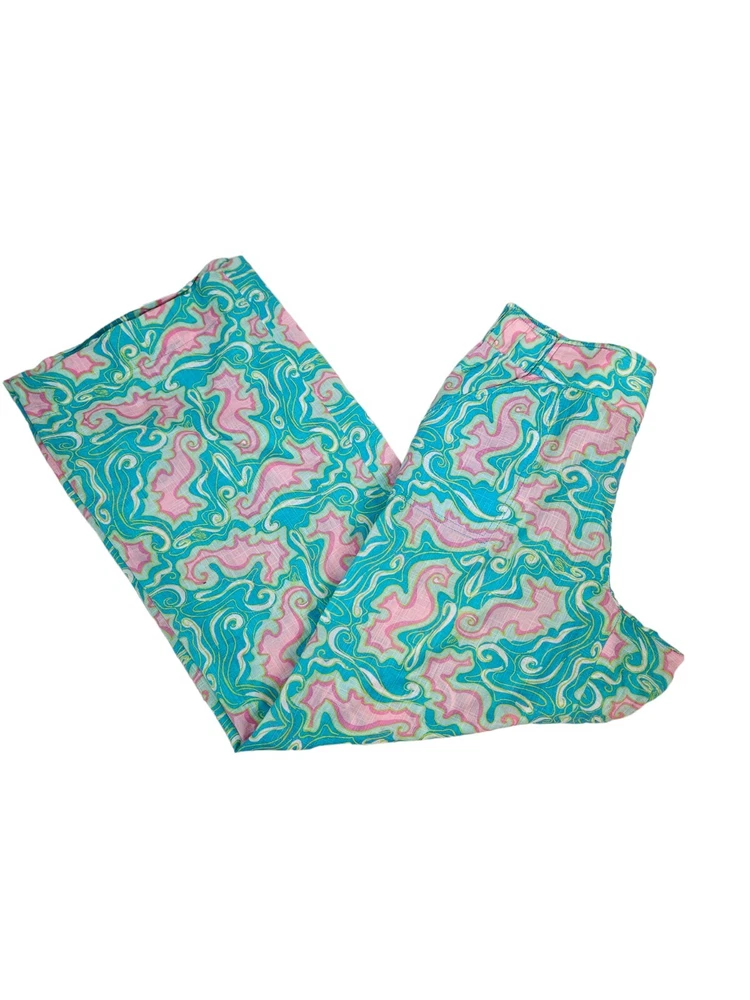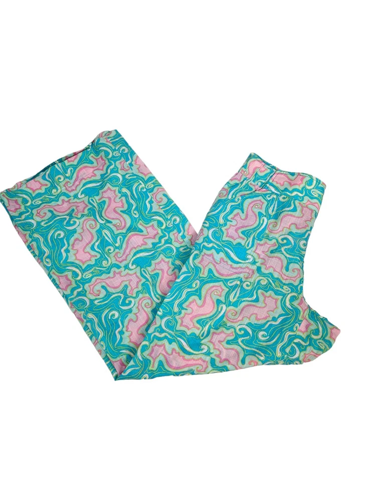 Lilly Pulitzer Resortwear Wide Leg Palazzo Pants Seahorse Print Size Medium K61 In excellent condition Lilly Pulitzer Resortwear Wide Leg Palazzo Pants Seahorse Print Size Medium Women's. Features classic bold and colorful Lilly Pulitzer linen-like wide leg palazzo pants in a fun resortwear print, teal with pink seahorses and neon green with hidden Lilly signature in pants, back elastic waistband, 2 front patch pockets, mid to high rise, wide leg, flowy and breathable, sorority style, resort vibes, Caribbean feel. Perfect comfy pants to dress up or down! Measurements laying flat waist 15.5" unstretched front rise 10.5" hips 20.5" inseam 30" leg opening 12.5" Fabric 100% cotton This is a pre-owned item that may show signs of wear. In excellent condition, no flaws.