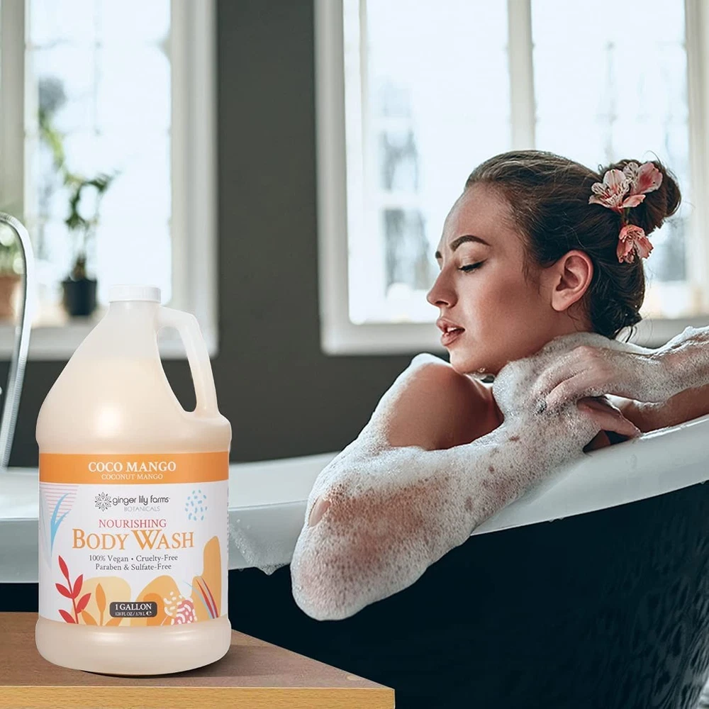 Nourishing Body Wash: Gently and effectively washes away dirt, oil and bacteria with a rich, creamy lather that leaves skin soft, smooth and free of harsh chemicals; Suitable for daily use; Tropical Coconut Mango Scent: The rich aroma of tropical mango swirled with juicy papaya over a creamy background of coconut milk and smooth vanilla bean will leave you feeling uplifted. Naturally Derived Ingredients: Enriched with our special blend of vitamins, pure essential oils and botanical extracts to deeply hydrate and soothe dry skin. Toxin-free formula is paraben, sulfate, phosphate and gluten-free. Cruelty-Free Body Wash: Ginger Lily Farms Botanicals is PETA-certified, 100% vegan and never tested on animals so you can feel good while using it. Economical & Eco-Friendly: Gallon refill size helps reduce plastic consumption and is perfect for refilling shower dispensers in locker rooms, health clubs, spas or at home. 1 Gallon (128 fl. oz.)