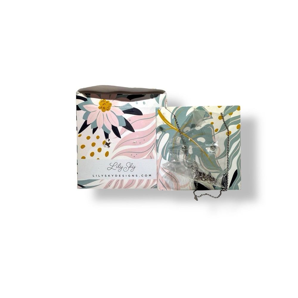 Product Lily Sky Karma Necklace Elephant Pendant with Mother of Pearl Clover Shaped Earrings The set includes a beautiful silver clover-shaped earrings and a stainless steel necklace with an intricately designed elephant pendant. Elephants are thought to represent good luck, prosperity and wisdom. This stylish set includes an adjustable silver necklace with a ‘lucky’ elephant charm and natural shell clover earrings. New and unused - Size - oz About Us: All items are new and authentic. Please message us with any questions you have! We are happy to help.