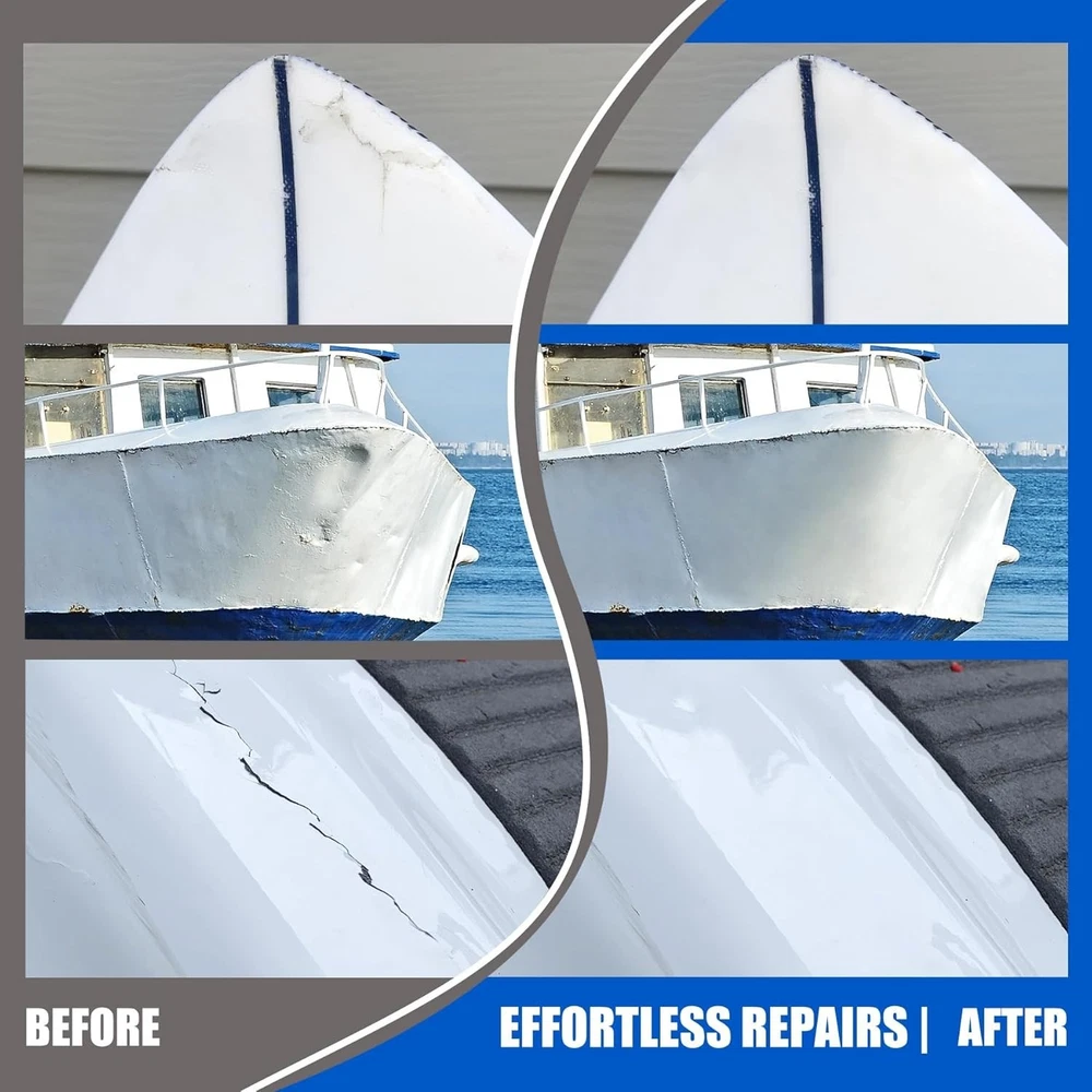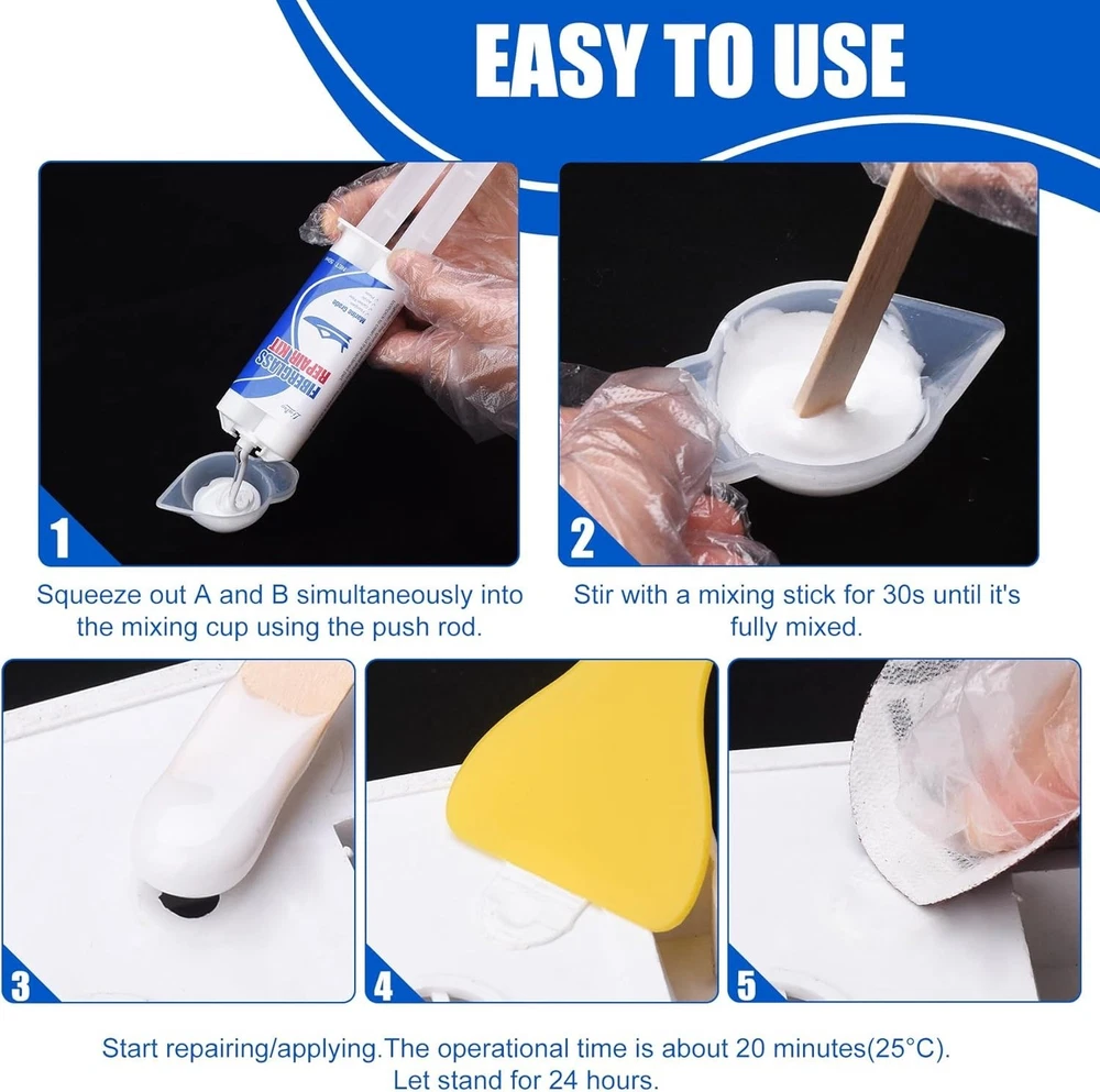 Limino Marine Fiberglass Repair Kit - 100ml Fiberglass Resin Filler for Fiberglass Bathtub Chips Cracks Holes Scratch Repair - Gel Coat Repair Kit for Boats, Jet Skis, Surf Boat, Kayak, UV-Resistant Product Description SPECIALIZED FIBERGRASS KIT - Our marine fiberglass repair kit has mega adhesion to effectively repair fiberglass boat damage on horizontal and vertical surfaces (Above The Waterline), perfectly repairing scratches, cracks and holes on the boat. Excellent UV resistance and waterproof protection, specially designed to cope with exposure to sunlight and humid environments, making it suitable for various types of boat repair tasks such as motorboats, surfing boats, kayaks, yachts, sailboats, canoes. VARIETY OF APPLICATIONS - The gelcoat repair kit has good compatibility with surface damage repair of fiberglass, carbon fiber, acrylic, plastic, porcelain, stainless steel, stone, aluminum and other materials. Not even for boat, if you encounter the above materials you need to repair in your life, use this product to started doing a bunch of small repairs around the house immediately. DURABLE AND LONG-LASTING QUALITY - We use two-component fiberglass filler for detachable open packaging, ensuring the activity of the product during storage and its reusability. With outstanding mega adhesion, it can ensure the perfect fit between the adhesive and the repaired wound, and maintain a steel like hardness and toughness for a long time. It is a perfect marine fiber glass simple repair kit. SIMPLY TO USE - The marine fiberglass repair kit equipped with complete accessories, we use the push rod to squeeze out A and B simultaneously into the silicone cup. After 30s mixing, start repairing and applying. The operational time is about 20 minutes (25℃). Fully curing time is 24 hours. When it solidifies, its hardness is as hard as steel. So we equipped sandpaper to polish the surface for better fusion effect. ECONOMICAL AND PRACTICAL - The same expenditure can achieve greater capacity without sacrificing quality. If you are not satisfied with your purchase or if it arrives damaged, don't hesitate to reach out to us. Click 'Add to Cart' now and enjoy the journey of perfect repair experience.