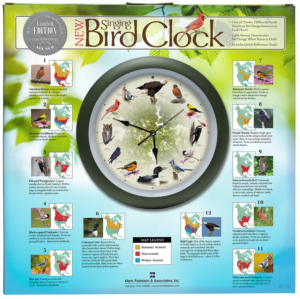 -Authentic - sold by the creator of the Original Singing Bird Clock -Our Limited Edition 20th Anniversary 13-inch Singing Bird Clock includes twelve beautiful birds and corresponding sounds from some of the most recognized Birds in North America, one at the top of each hour. -Framed in Green Matte, this clock features images and high end authentic bird recordings. -Detailed packaging provides bird habits and habitat information. -Light sensor deactivates songs when room is dark. -Birds featured include American Robin, American Goldfinch, Pileated Woodpecker, Black-capped Chickadee, Blue Jay, Common Loon, Baltimore Oriole, Purple Martin, Eastern Screech-Owl, Northern Cardinal, White-breasted Nuthatch and Bald Eagle.