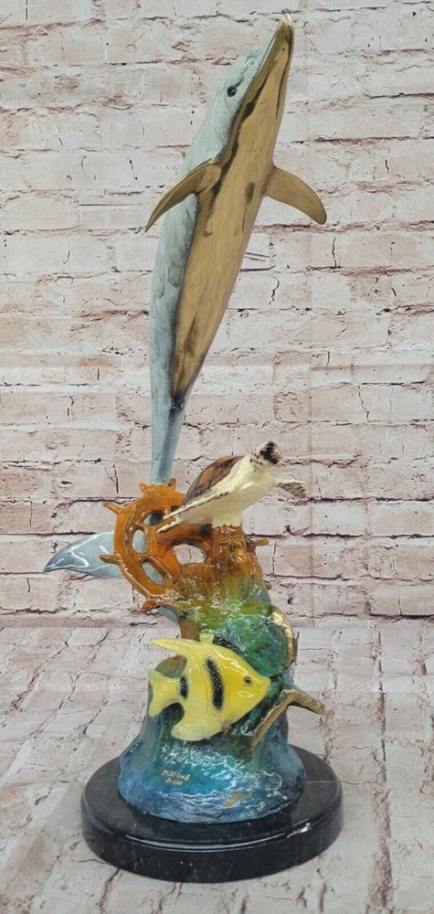 Limited Edition Bronze Marine Life Sculpture: Dolphin Fish Turtle Figurine Gift Limited Edition Bronze Marine Life Sculpture: Dolphin Fish Turtle Figurine Gift Condition : This sculpture is in perfect condition. Bronze Dimensions with Marble Base: Height 20.5" X Width 17" Marble Dimensions: Diameter 7" Height without base:19.5" Weight:13 LBS Inventory:1658720NC16061 This Limited Edition Original Artwork titled "Sea Harmony" by the renowned artist Marius is a captivating bronze sculpture that beautifully captures the essence of marine life. Handcrafted using the traditional lost wax method, this sculpture features a dynamic composition of a dolphin, fish, and turtle, symbolizing the harmony and interconnectedness of sea creatures. Marius's exceptional skill and attention to detail are evident in the lifelike rendering and intricate textures of each marine animal. The sculpture is finished with a special multi-colored patina, adding depth and vibrancy to the piece. This unique patina technique enhances the visual appeal, highlighting the distinct features of the dolphin, fish, and turtle while bringing out the rich bronze undertones. The interplay of colors creates a stunning visual effect that embodies the beauty and diversity of the ocean. Mounted on a round black marble base, the sculpture gains an added touch of elegance and stability. The polished marble contrasts beautifully with the multi-colored patina, creating a sophisticated and striking presentation. Each piece is signed and numbered by Marius, ensuring its authenticity and limited edition status, making it a valuable collectible. "Sea Harmony" is a perfect addition to any art collection, offering both aesthetic beauty and a poignant reminder of the importance of marine conservation. Ideal for collectors, marine enthusiasts, or anyone who appreciates fine art, this exquisite bronze sculpture is sure to inspire admiration and conversation in any setting. Limited Edition Original Artwork Dolphin Fish Turtle Bronze Sculpture Hand Made Artwork www.bronzhaus.com Video will open in a new window Using the eBay App? Paste link into a browser window: [isdntekvideo] Shipping Terms : Most of our items are shipped via USPS (United States Postal Service) mail or UPS. Most orders are shipped within 24-48 hours of purchase. Please be aware that not all items are available for USPS shipping due to size and weight. We do ship to Hawaii, Alaska, Canada, Puerto Rico, APO/AE, and U.S. Virgin Islands, however, an additional charge may be required. Please contact us before making any purchases in these areas. For Non-USA customers, you may be responsible for all duty, tax, brokerage fees that may be due upon delivery (shipping costs cover freight charges only). We also ship internationally. Please refer to the "Shipping and Handling" chart for the rates for each area. Payment : We accept just about any form of payment. PayPal, Master Card, Visa or American Express credit cards. Money orders, cashiers checks, and even personal or business checks. For governmental institutions, we will also accept a purchase order. Please understand that for personal or business checks we have to wait for the check to clear (usually 7 days) before shipping. Condition : New Detailed Hand Crafted Hot Cast Bronze Satisfaction Guaranteed. This is Stock Photo, Slight Color Variation!! Listing and template services provided by inkFrog