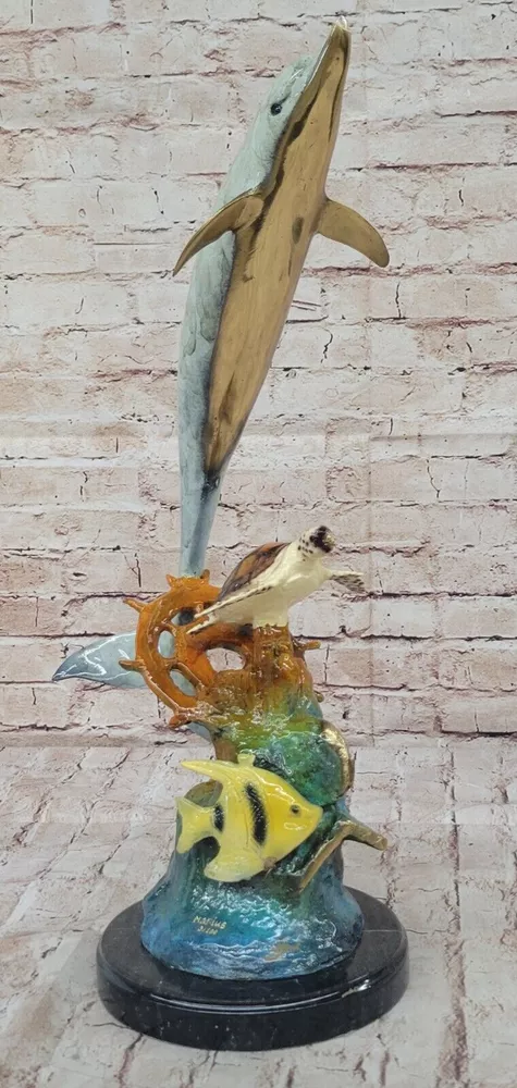 Limited Edition Bronze Marine Life Sculpture: Dolphin Fish Turtle Figurine Gift Limited Edition Bronze Marine Life Sculpture: Dolphin Fish Turtle Figurine Gift Condition : This sculpture is in perfect condition. Bronze Dimensions with Marble Base: Height 20.5" X Width 17" Marble Dimensions: Diameter 7" Height without base:19.5" Weight:13 LBS Inventory:1658720NC16061 This Limited Edition Original Artwork titled "Sea Harmony" by the renowned artist Marius is a captivating bronze sculpture that beautifully captures the essence of marine life. Handcrafted using the traditional lost wax method, this sculpture features a dynamic composition of a dolphin, fish, and turtle, symbolizing the harmony and interconnectedness of sea creatures. Marius's exceptional skill and attention to detail are evident in the lifelike rendering and intricate textures of each marine animal. The sculpture is finished with a special multi-colored patina, adding depth and vibrancy to the piece. This unique patina technique enhances the visual appeal, highlighting the distinct features of the dolphin, fish, and turtle while bringing out the rich bronze undertones. The interplay of colors creates a stunning visual effect that embodies the beauty and diversity of the ocean. Mounted on a round black marble base, the sculpture gains an added touch of elegance and stability. The polished marble contrasts beautifully with the multi-colored patina, creating a sophisticated and striking presentation. Each piece is signed and numbered by Marius, ensuring its authenticity and limited edition status, making it a valuable collectible. "Sea Harmony" is a perfect addition to any art collection, offering both aesthetic beauty and a poignant reminder of the importance of marine conservation. Ideal for collectors, marine enthusiasts, or anyone who appreciates fine art, this exquisite bronze sculpture is sure to inspire admiration and conversation in any setting. Limited Edition Original Artwork Dolphin Fish Turtle Bronze Sculpture Hand Made Artwork www.bronzhaus.com Video will open in a new window Using the eBay App? Paste link into a browser window: [isdntekvideo] Shipping Terms : Most of our items are shipped via USPS (United States Postal Service) mail or UPS. Most orders are shipped within 24-48 hours of purchase. Please be aware that not all items are available for USPS shipping due to size and weight. We do ship to Hawaii, Alaska, Canada, Puerto Rico, APO/AE, and U.S. Virgin Islands, however, an additional charge may be required. Please contact us before making any purchases in these areas. For Non-USA customers, you may be responsible for all duty, tax, brokerage fees that may be due upon delivery (shipping costs cover freight charges only). We also ship internationally. Please refer to the "Shipping and Handling" chart for the rates for each area. Payment : We accept just about any form of payment. PayPal, Master Card, Visa or American Express credit cards. Money orders, cashiers checks, and even personal or business checks. For governmental institutions, we will also accept a purchase order. Please understand that for personal or business checks we have to wait for the check to clear (usually 7 days) before shipping. Condition : New Detailed Hand Crafted Hot Cast Bronze Satisfaction Guaranteed. This is Stock Photo, Slight Color Variation!! Listing and template services provided by inkFrog