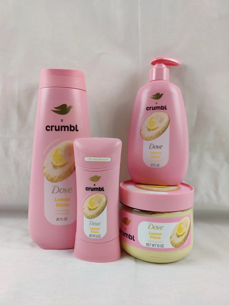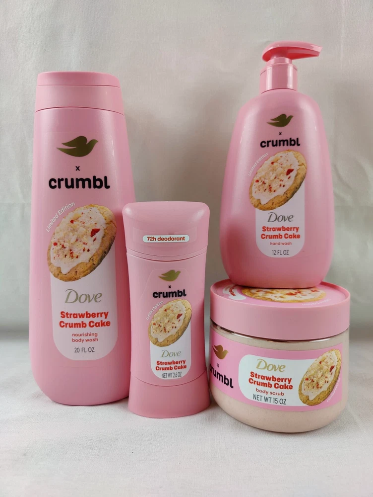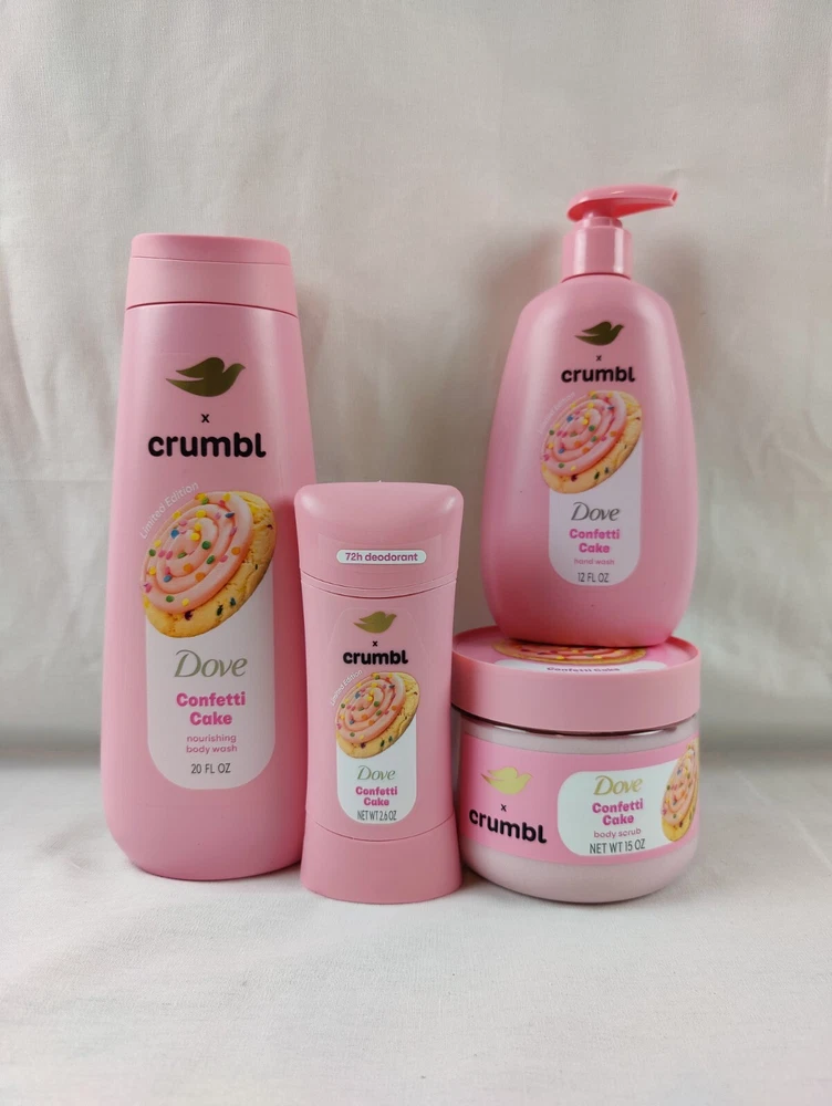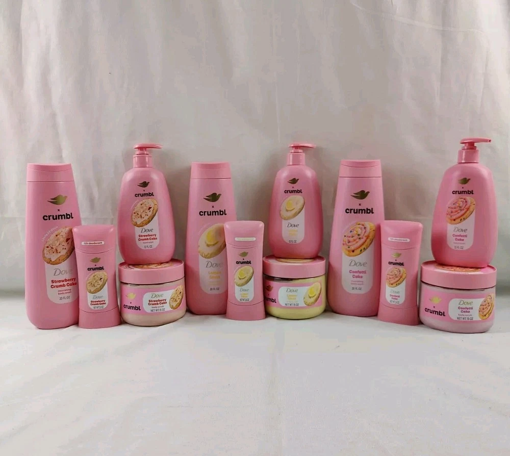 This listing showcases a limited-edition, highly coveted collection of 12 Dove x Crumbl collaboration items inspired by the signature cookies from Crumbl. Each product is beautifully packaged in pink, reflecting the delightful dessert-like fragrances they offer. This set is a rare treasure for collectors and enthusiasts of specialty body care. Here's what the set includes: Dove Strawberry Crumb Cake Body Wash (20 fl oz) - A luscious, creamy body wash infused with the comforting scent of strawberry crumb cake. Dove Lemon Glaze Body Wash (20 fl oz) - Bright and refreshing, this body wash captures the zesty and sweet aroma of lemon glaze. Dove Confetti Cake Body Wash (20 fl oz) - Celebrate every shower with the fun, sweet scent of confetti cake. Dove Strawberry Crumb Cake Hand Wash (13.5 fl oz) - A nourishing hand wash that leaves your hands soft with the warm scent of strawberry crumb cake. Dove Lemon Glaze Hand Wash (13.5 fl oz) - A citrus-scented hand wash that refreshes and invigorates your senses. Dove Confetti Cake Hand Wash (13.5 fl oz) - Indulge in the festive sweetness of confetti cake with this moisturizing hand wash. Dove Strawberry Crumb Cake Deodorant (2.6 oz) - Long-lasting odor protection with a hint of strawberry crumb cake sweetness. Dove Lemon Glaze Deodorant (2.6 oz) - Stay fresh all day with the zesty aroma of lemon glaze. Dove Confetti Cake Deodorant (2.6 oz) - A unique deodorant with the playful and comforting scent of confetti cake. Dove Strawberry Crumb Cake Body Butter (10.5 oz) - A rich, creamy body butter perfect for deep hydration and a long-lasting strawberry crumb cake scent. Dove Lemon Glaze Body Butter (10.5 oz) - Moisturize with the cheerful citrus scent of lemon glaze. Dove Confetti Cake Body Butter (10.5 oz) - A luxurious body butter with the delectable scent of confetti cake to leave your skin soft and glowing. Why this listing is exceptional: One-Time Production : These Dove x Crumbl products were released as a limited-edition collaboration and will never return . Once they’re gone, they’re gone forever. Complete Set : This listing includes all 12 products in the collection, making it the ultimate bundle for anyone who missed out during the original release. Best Price : At this price point, this is the cheapest full set you’ll find, offering unbeatable value for these highly sought-after items. Don’t miss this opportunity to own a piece of this exclusive collection. Whether you’re a Dove fan, a Crumbl cookie lover, or both, this set is the perfect way to indulge your senses while enjoying premium body care. Act fast—this deal won’t last long!
