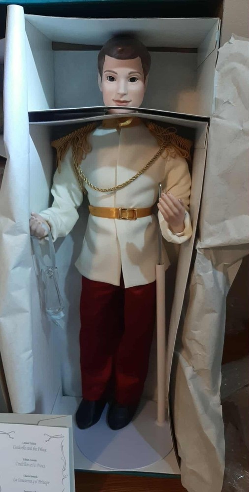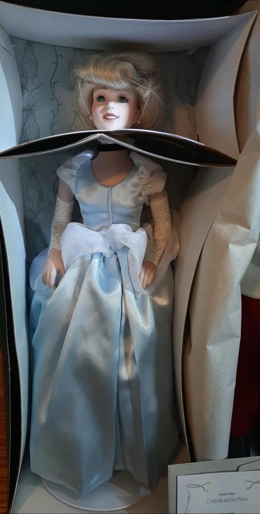 The product is a vintage limited edition porcelain figurine of Disney's Cinderella and Prince Charming, with a production number of 2518 out of 5000. Made in Thailand, this collectible item features the beloved characters from the Disney franchise, perfect for fans of the Cinderella story. The figurine captures the magic and charm of the classic tale, making it a special and sought-after piece for Disney collectors. The figures are approximately 18" tall and have stands.