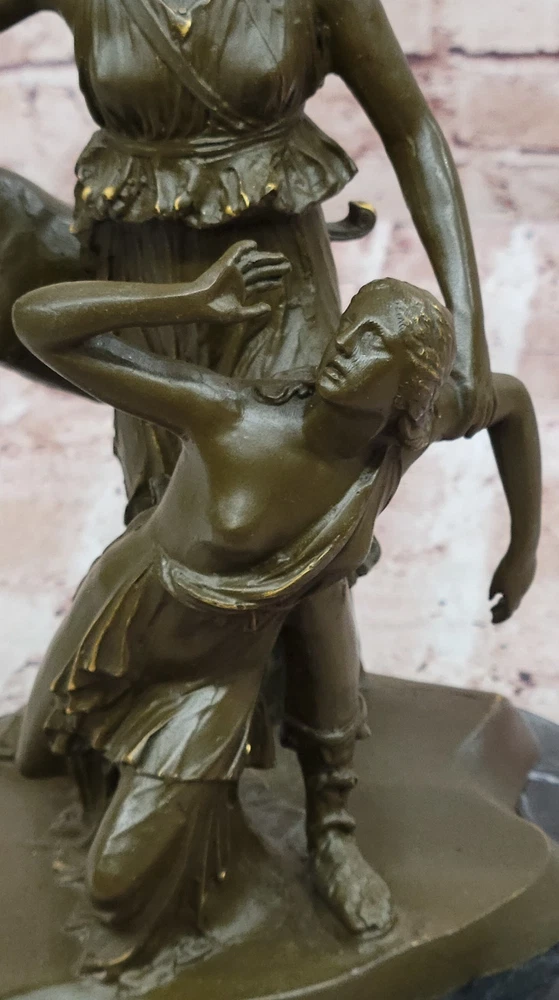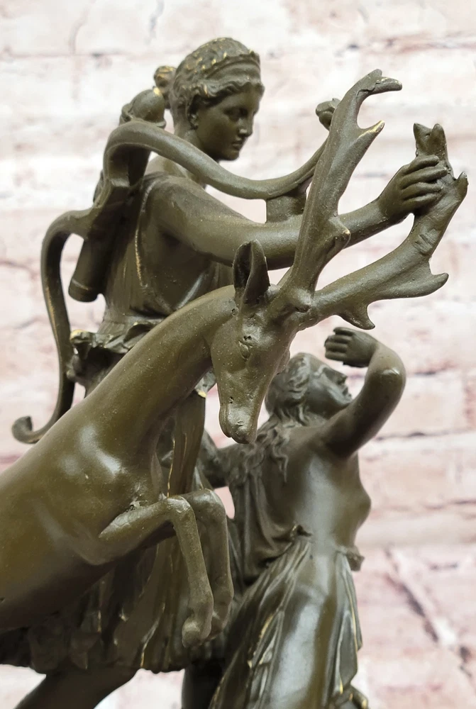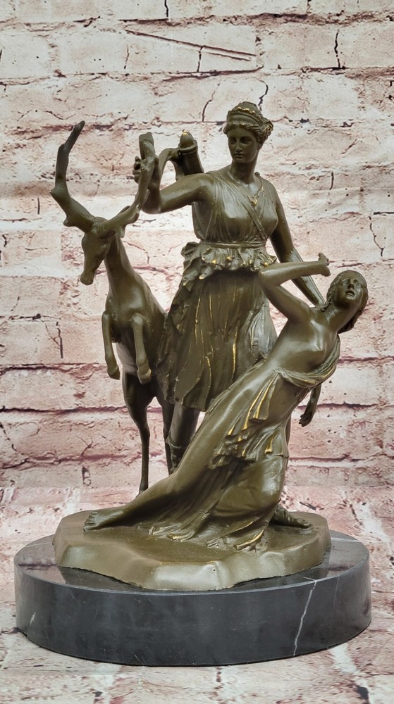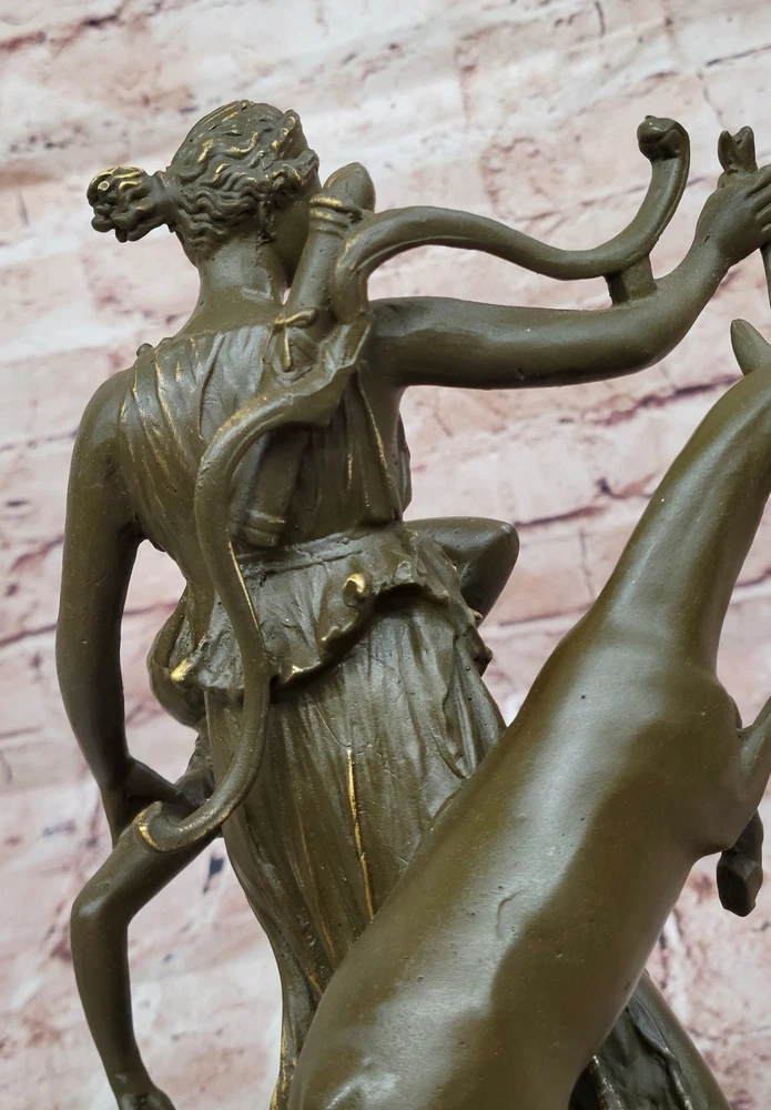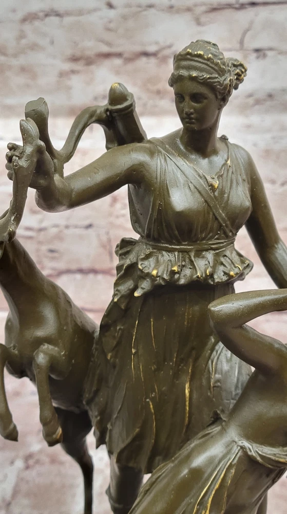 Limited Edition Greek Huntress Bronze Statue – Diana/Artemis Figurine Limited Edition Greek Huntress Bronze Statue – Diana/Artemis Figurine Condition : This sculpture is in perfect condition. Bronze Dimensions with Marble Base: Height 11.5" X Width 8" Marble Dimensions: Diameter 8" Height without base:10.5" Weight:13 LBS Inventory:35GTS8318853 Step into the world of classical mythology with this magnificent limited edition bronze sculpture of Diana, the ancient Greek goddess revered for her command over the hunt, the moon, wild animals, and the natural world. This captivating work of art depicts Diana in a moment of serene grace, walking with her loyal deer companion, a symbol of purity, protection, and her deep spiritual connection with nature. Masterfully handmade using the traditional lost wax method, this sculpture is cast in pure bronze with a warm brown patina finish that enhances its rich detailing and texture. Diana’s flowing garments and poised movement are sculpted with remarkable craftsmanship, reflecting both elegance and strength, while the deer walks at her side with quiet loyalty. The classical styling evokes timeless beauty and pays tribute to one of the most iconic deities of ancient mythology. Signed and individually numbered by the artist Anderson, this piece is part of a limited edition series, ensuring its uniqueness and collectible value. Mounted on a polished black marble base for added sophistication, this sculpture makes a powerful centerpiece for any collection. It is an ideal choice for art lovers, mythology enthusiasts, or anyone who appreciates the divine harmony between feminine strength and the natural world. Shipping Terms : Most of our items are shipped via USPS (United States Postal Service) mail or UPS. Most orders are shipped within 24-48 hours of purchase. Please be aware that not all items are available for USPS shipping due to size and weight. We do ship to Hawaii, Alaska, Canada, Puerto Rico, APO/AE, and U.S. Virgin Islands, however, an additional charge may be required. Please contact us before making any purchases in these areas. For Non-USA customers, you may be responsible for all duty, tax, brokerage fees that may be due upon delivery (shipping costs cover freight charges only). We also ship internationally. Please refer to the "Shipping and Handling" chart for the rates for each area. Payment : We accept just about any form of payment. PayPal, Master Card, Visa or American Express credit cards. Money orders, cashiers checks, and even personal or business checks. For governmental institutions, we will also accept a purchase order. Please understand that for personal or business checks we have to wait for the check to clear (usually 7 days) before shipping. Condition : New Detailed Hand Crafted Hot Cast Bronze Satisfaction Guaranteed. This is Stock Photo, Slight Color Variation!! Listing and template services provided by inkFrog