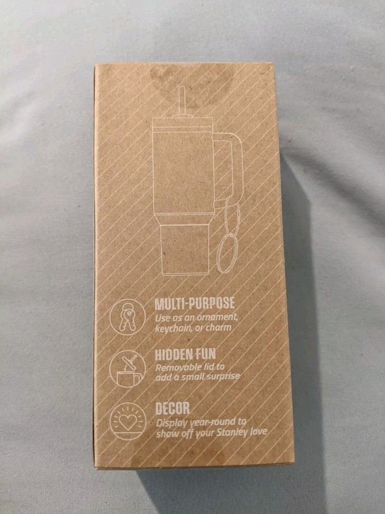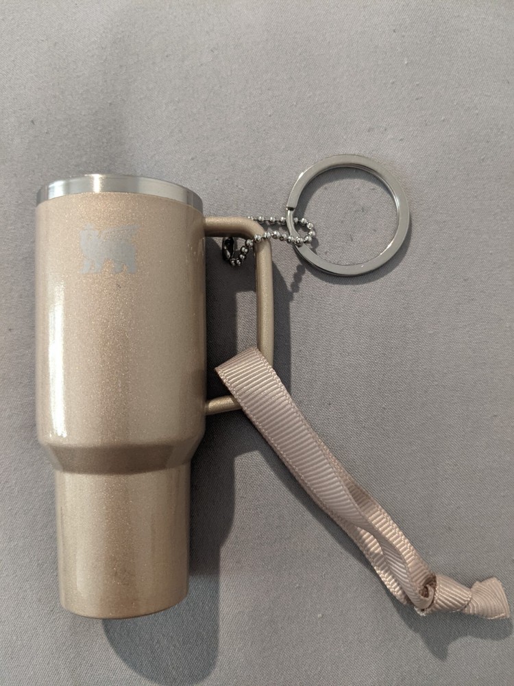 Limited Edition Stanley Mini Quencher Ornament Keychain in Honey color. Made of plastic, this keychain features a charming design suitable for collectors. It is a modern piece from the Modern era featuring a keychain attachment.