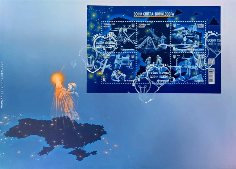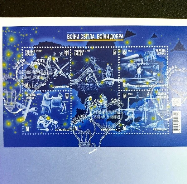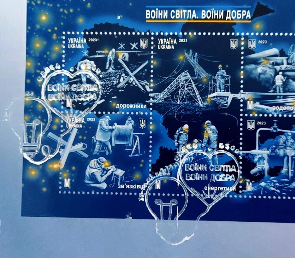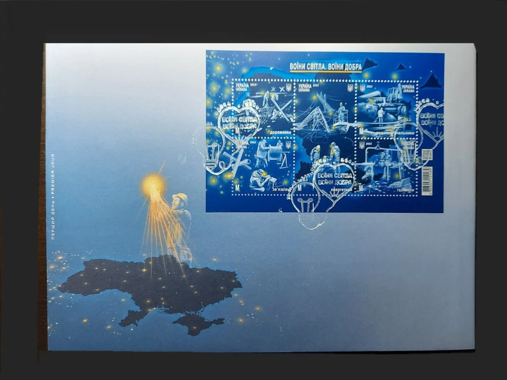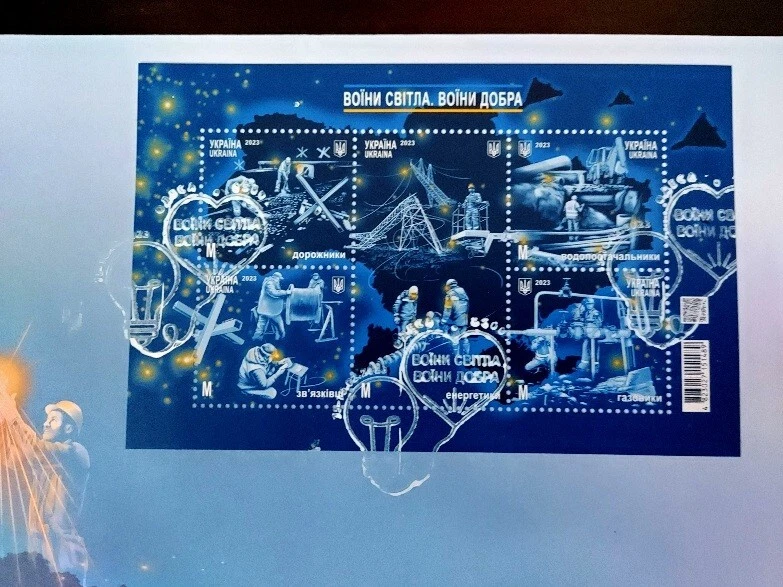 Limited edition! CFD Марки военного времени Украина 2023г Спецгашение The stamp is made with white ink Серия "Warriors of Light Warriors of Good" Спецгашение конверт первого дня форматом С5, лист марок из 6 шт марок Special payment 15.02.2023 Postal envelope of the first day, which will be a worthy addition to any collection of postage stamps of the wartime 100% оригінальний товар Укрпошти Sheet of stamps The number of stamps in a sheet is 5 Ukrposhta catalog number — 198 (2023-2027) put into circulation on February 15, 2023 Ukrainians are deeply grateful to the specialists of the special services, who, after enemy rocket fire, selflessly restore the road surface and communications 24/7 and return light, heat and gas to the homes of Ukrainians The size of the stamp sheet is 128x83 mm