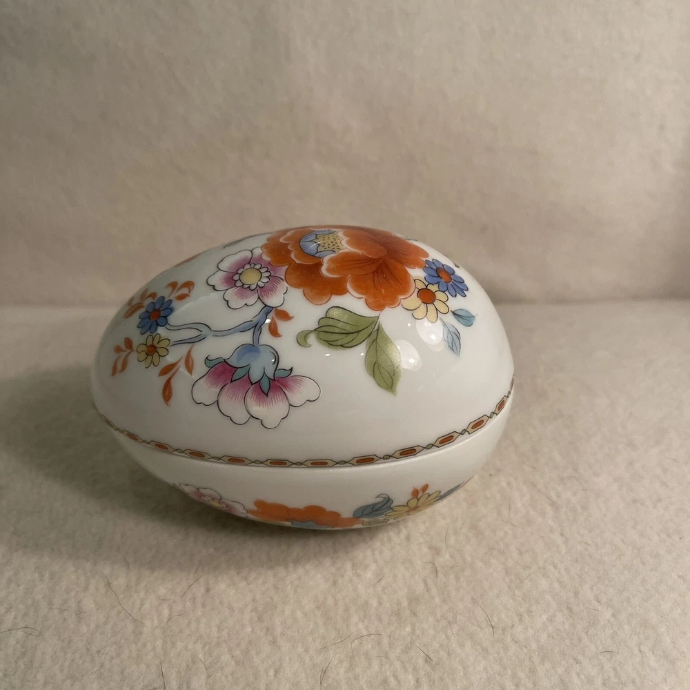 This Limoges France Porcelain Egg Shaped Trinket Box features a beautiful hand-painted floral design, making it a charming decorative piece for all occasions. The oval-shaped box is crafted from high-quality porcelain with a glossy finish, showcasing intricate French style. Measuring 4.5 inches in length, 3 inches in height, and 3 inches in width, this original 1980s piece from France is a unique collectible item that weighs 6.5 ounces. Excellent condition. No chips or cracks.