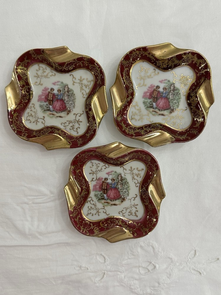 The Limoges Trinket Vintage Dish/Ashtray of a Courting Couple Fragonard Gold Gilt is a beautifully crafted piece. Featuring a multi-color design, this original collectible captures the essence of a courting couple in a whimsical and elegant Fragonard scene. Perfect for adding a touch of vintage charm to any decor, this Limoges dish is a unique and exquisite addition to any collection. Please see pictures for condition and any imperfections.