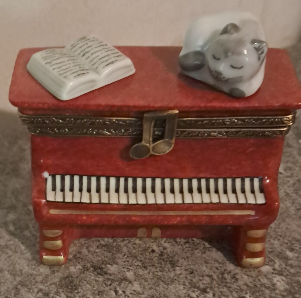 The Limoges trinket box piano with cat and book is a charming and whimsical collectible item featuring intricate details and a unique design. The trinket box takes the shape of a book, making it a creative and playful addition to any collection. With a piano and cat as the main subjects, this collectible is sure to stand out and bring joy to its new owner. The boxed packaging adds a touch of luxury to this decorative piece, making it a perfect gift for any cat lover or avid collector.