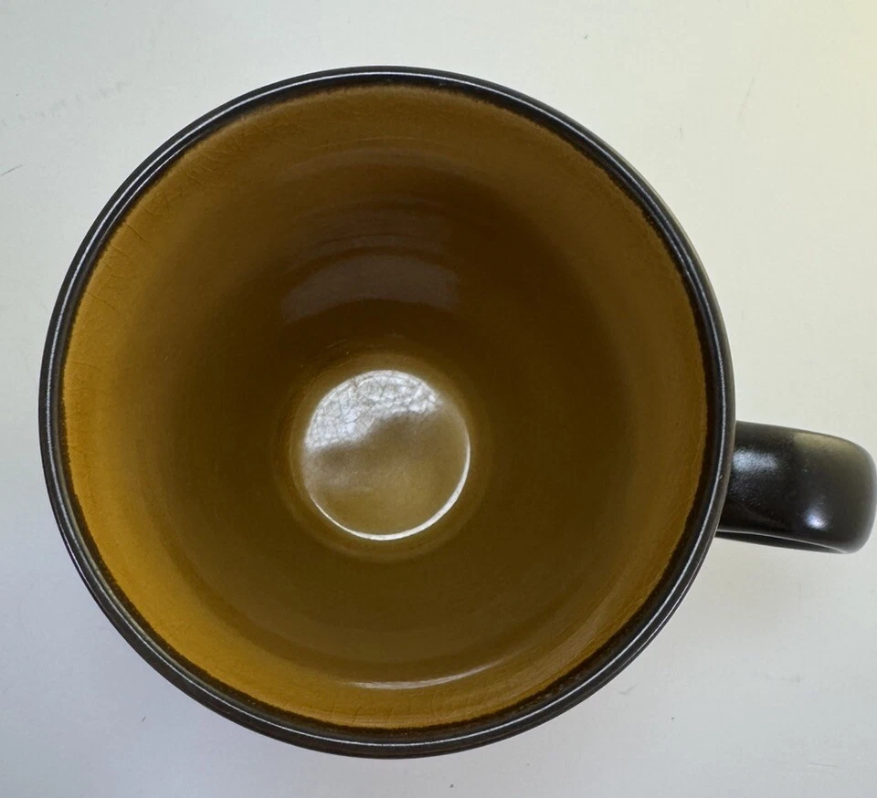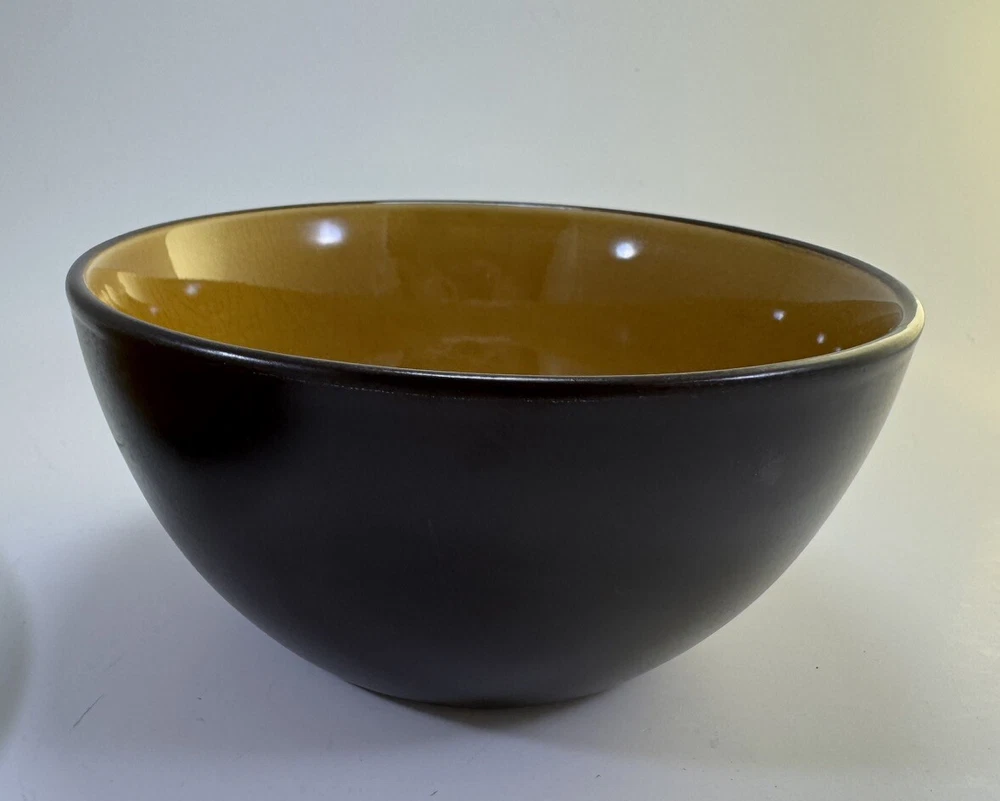 Place setting of Linden Street Hearthridge Honey dinnerware. Set includes 1- 11” dinner plate, 1- 8” salad plate, 1 bowl and 1 mug. Dishes are dark brown on the outside and a nice honey color on the tops/inside. Condition note: there is crazing on all the dishes.