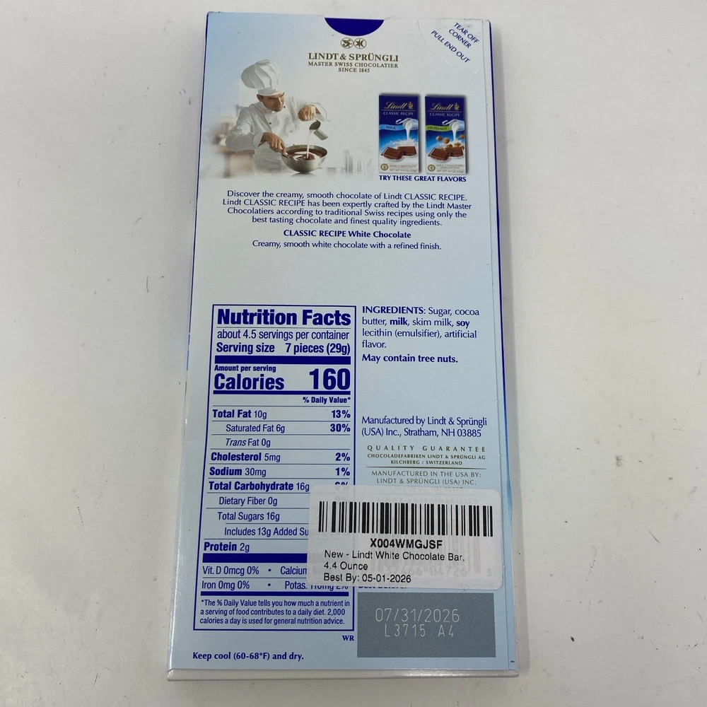 Condition: New See photos for full visual reference Model: Lindt Classic Recipe White Chocolate Bar 4.4 oz At Unturned, we were shocked to discover how many perfectly functional returns were being wasted. That's why we made it our mission to offer these e-commerce returns—often overlooked and discarded—at unbeatable prices. We carefully inspect and test all our products to ensure quality and accurately describe their condition. However, if you receive an item that does not match the description or meet expectations, please reach out, and we will make it right!