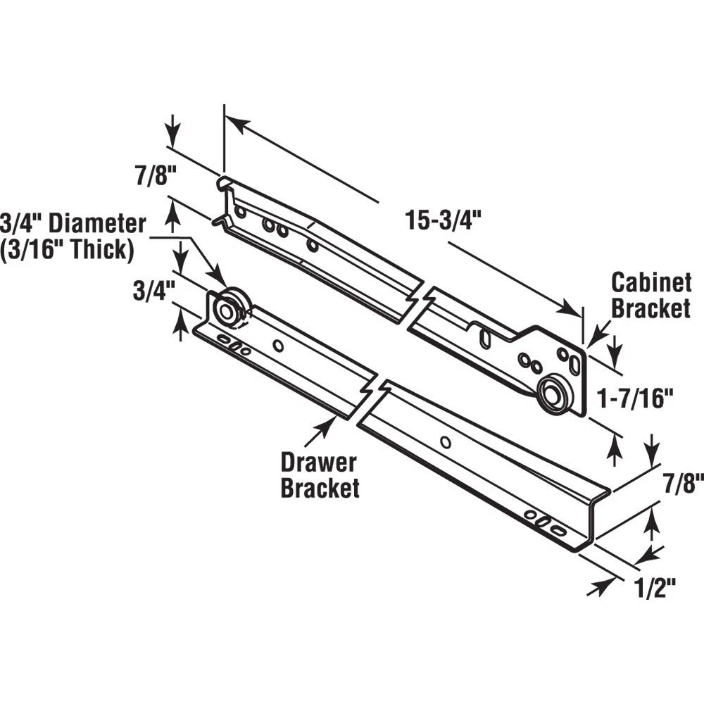 Why struggle with a drawer that won’t open or close properly when you can simply replace the slides? Whether you need to replace damaged or missing slides or are installing them new for the first time, the -Line MP7210 Drawer Slide Kit fits most bottom/side-mounted drawer systems and is for use in 16 inch deep drawer cabinets. These bottom mount drawer slides can be installed in drawer cabinets with face frames and without. The drawer slide kit is constructed of steel tracks with a white coated finish, self-lubricating plastic rollers and a self-closing design that commences at the final 2-1/2 inch from the end of the 15-3/4 inch long tracks when closing. With a maximum load capacity of 75 lbs., the drawer slide set is sturdy and can hold up to years of repeated use. It features a positive stop in the closed position and a double stop in the extended position that locks your drawer open, so it cannot be pulled too far out and fall off the tracks. Installation is quick and easy, and the kit contains all necessary fasteners. Installation instructions are included and also available on -Line’s .Installation Tip: The clearance required between the drawer and the drawer opening for these slides is: 1/2 Inchon left and right sides, 1/4 inch at the bottom and 5/8 inch at the topNote: This kit cannot be cut down to fit smaller drawer depths as it is designed with a positive stop at the ends of the fixed tracks, and because the rear rollers (11/16 inch diameter wheels) on the sliding tracks are fastened to the ends of the drawer-mounted track pieces. Used to replace damaged or missing drawer track hardware For use in 16 inch deep drawer cabinets White coated finish Steel tracks with flat plastic wheels 1 Set includes hardware for complete drawer