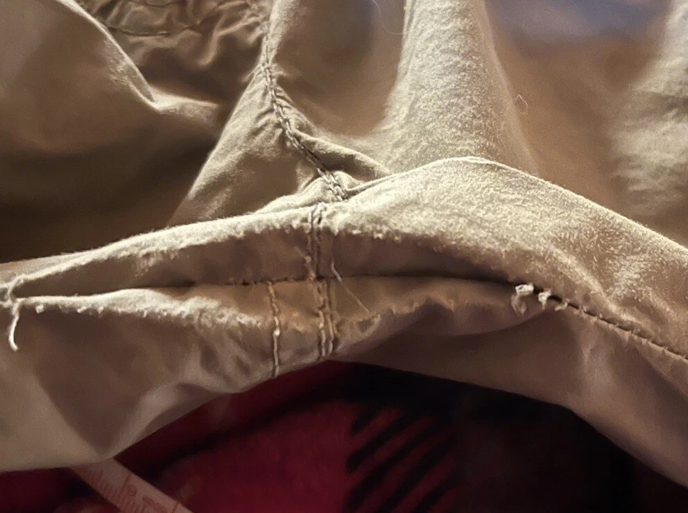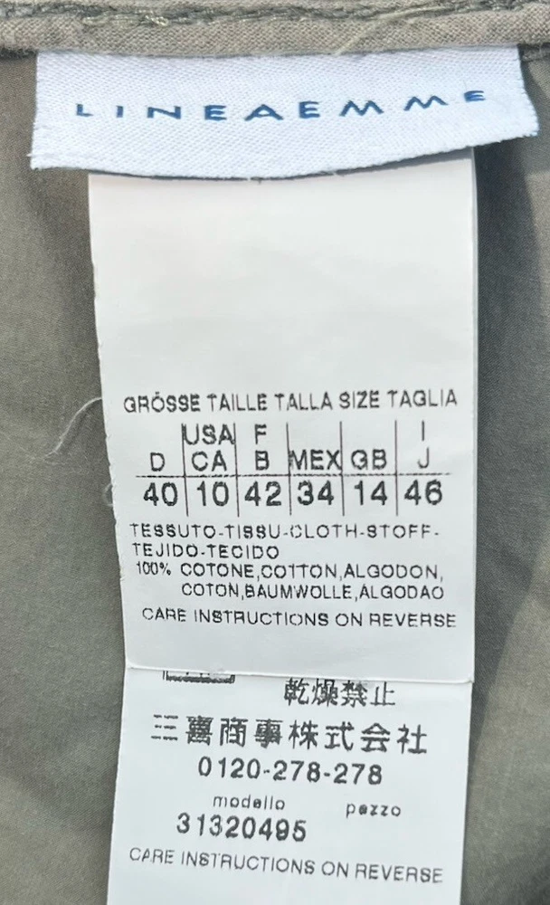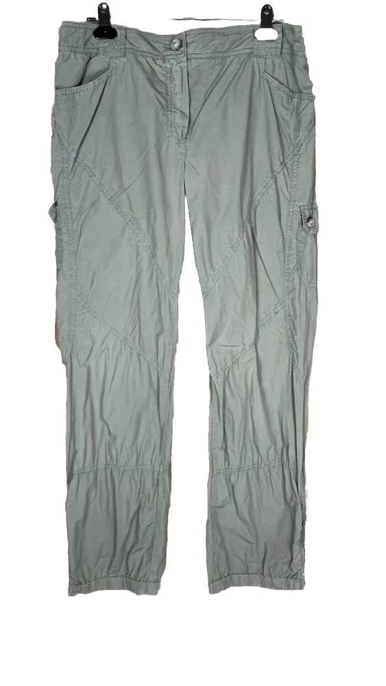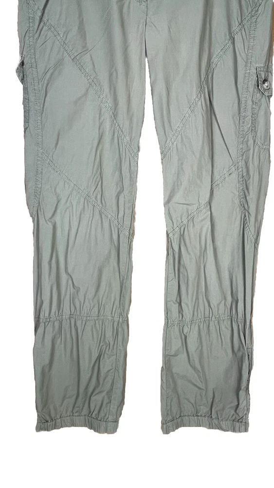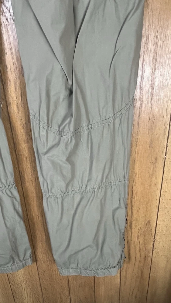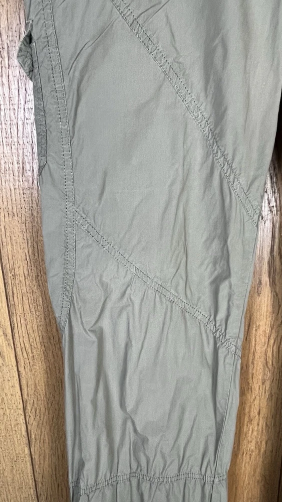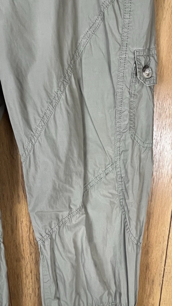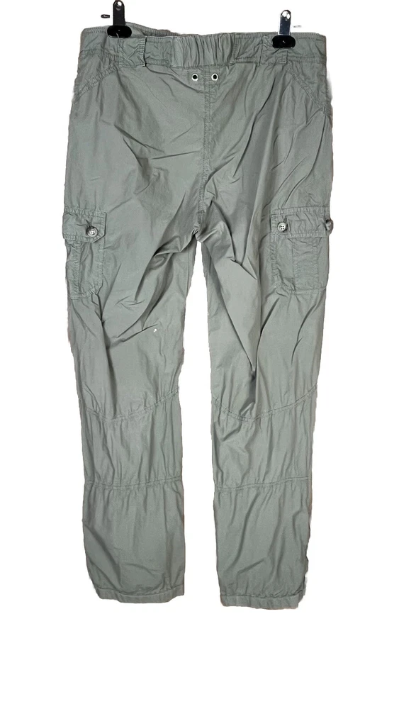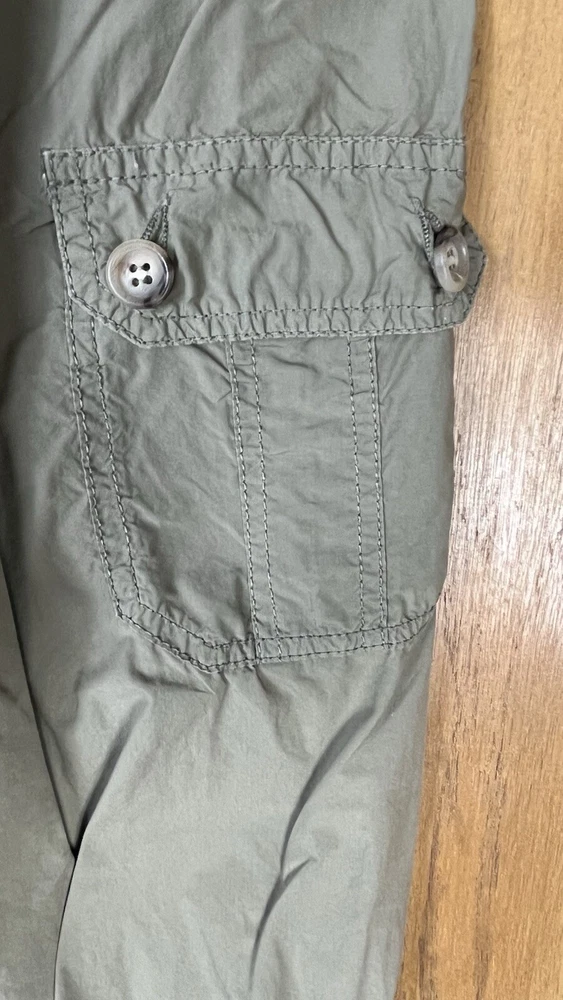 Flaw - there are 2 small bleach spots on the left back thigh, crotch needs a few stitches on the sewing machine These Lineaemme jogger leg pants in size 10 feature a solid green color and are made of 100% cotton canvas fabric. They have a 34" waist size and an 11" rise, with a comfortable regular fit and elastic ankles. The pants are designed with cargo pockets for added convenience while hiking or exploring the outdoors, enhanced by button and zipper accents. The nature, rock, outdoors, and retro theme combined with machine washable care instructions make these pants a versatile choice for all seasons.