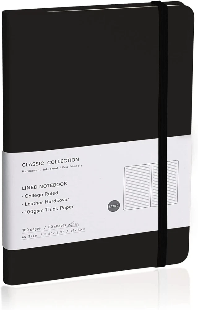 Lined Journal Notebook Medium 5.7x8 160 Pages Hardcover 100gsm Black