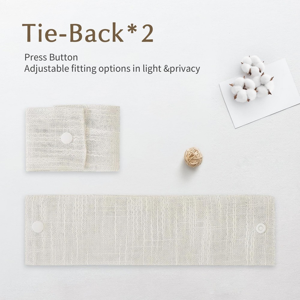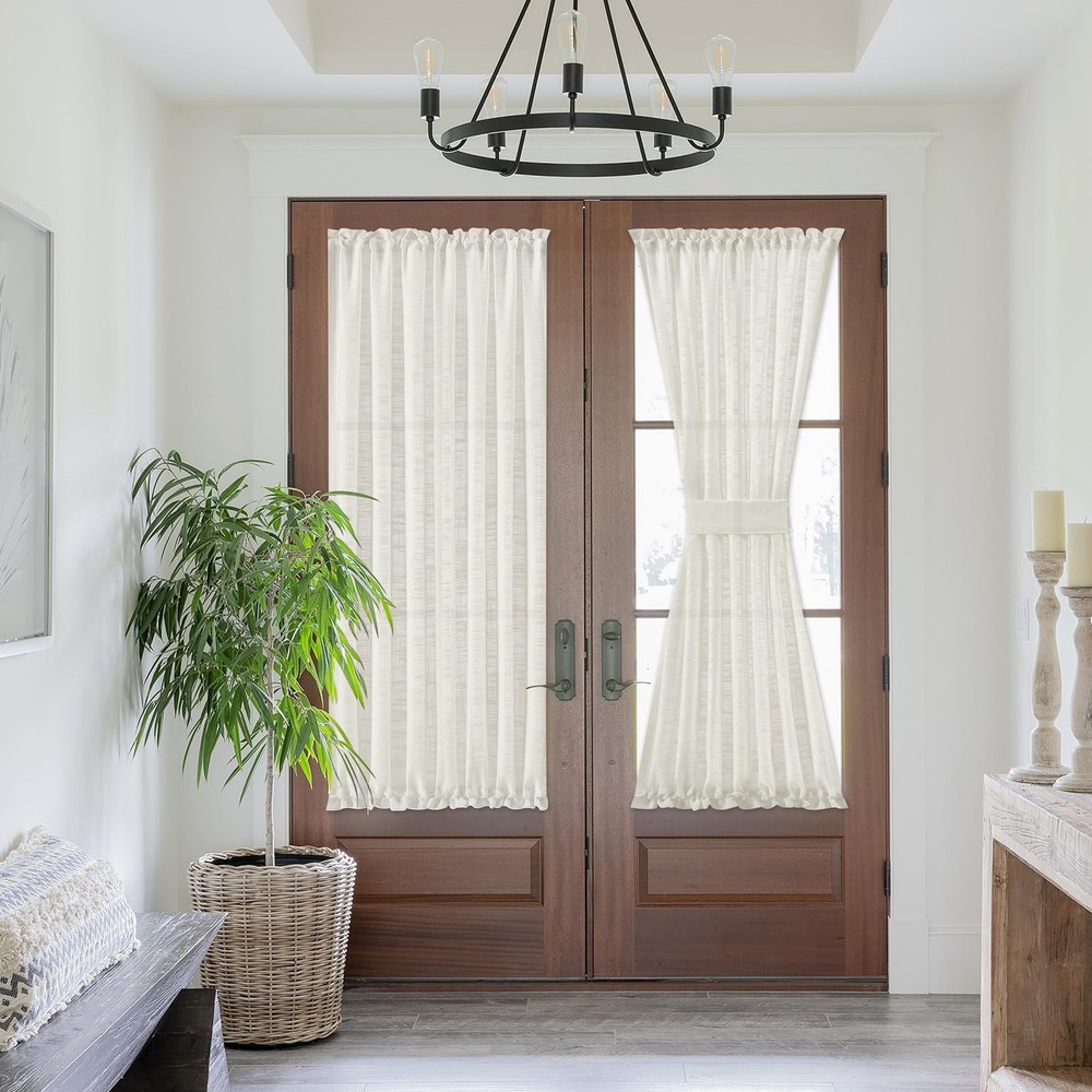 Bring linen texture and classic style to your window, let subtle filtered light into your room for an uplifting ambiance. Offering a quality semi sheer french door curtains with rich linen-textured look that will go well with any home decor. LINEN TEXTURED LOOK Cross weave textured adds dimension and style to any room of your home The airy weave textured semi-sheer fabric gently filters light while enhancing privacy Much thicker than ordinary sheer curtains, Linen textured door curtains look modern and expensive. These semi sheer french door panels are perfect for glass doors, Entry Door, Back Door, Front Door. Foyer Privacy PERFORMANCE: Liven up your place with solid natural linen semi sheer door curtains Control the amount of light in your space with an adjustable tieback, 3 press studs (adjustable length) to make it firm all the time and decorative appeal. 2-inch rod to make this french door panels perfect for large French doors or windows. Long-lasting durability. Machine washable front door panels for easy care. PACKAGE DETAIL: Color: White, Grey, Natural, Blue, Pink Size: 52”x40", 52"x72". Comes in 1 Panel Measured from top of the upper rod pocket to the bottom of the lower rod pocket, exclusive of headers. CARE INSTRUCTIONS: Crafted from 100% Polyester Wash separately Machine washable Tumble dry on Low TIPS: These linen curtains can be used as usual sheer curtains for general windows in the living room, kitchen, bedroom, office Matching regular window curtains and extra wide sliding door curtains are also available in store Due to the different screen display, the color of the actual item may vary slightly from the above images. NATURAL FRENCH DOOR CURTAINS: 50"W x 72"L /panel, Durable linen texture light filtering semi sheer door panels add subtle Texture to Any Room. 1 pc french door panel RICH LINEN TEXTURE CURTAINS: These thick semi-sheer front curtains add a luxurious textured Look, let enough ligh in while maintaining perfect privacy. With duo rod pocket design on top and bottom for easy installation. Gathered scalloped headers make it an elegant and nicer decoration. BONUS TIE-BACKS ATTACHED: 1 tie back attached with press button to wrap around the center. 3 adjustable options to softly filter light in and get just the right amount of sunlight. WRINKLE FREE: All the glass door panels are thread trimmed and pre-ironed. You can easily install them right out of the package with your own sash rods. EASY MAINTENANCE: The curtains offer great durability. Machine washable in cold water. Tumble dry low. Quick iron or steam clean at low temperature settings.
