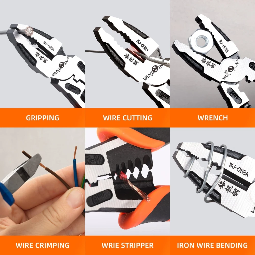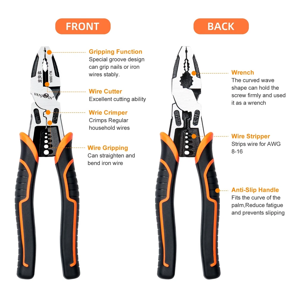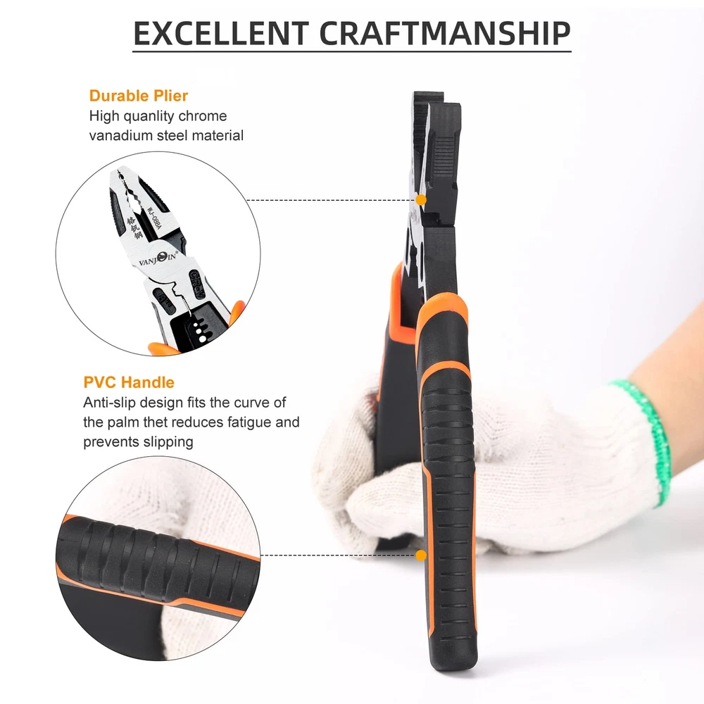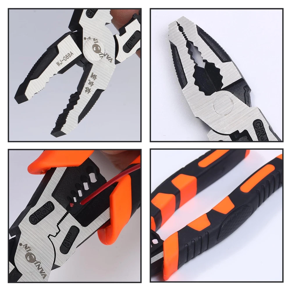 DURABLE CR-V STEEL -- The linesman plier is forged with chrome vanadium steel through high temperature. Overall hardness is between HRC 44-48, and the hardness of blades is up to HRC 60-62 6-IN-1 LINEMANS COMBINATION PLIERS -- The inside of the pliers are cast with different shapes and sizes of serrated grooves for gripping small items, loosing and tightening screws, cutting steel wires, crimping wires, pulling straightly iron wires, stripping solid wires HIGH LEVERAGE CUTTING PLIERS -- The casting of crimping and stripping areas extends the length of the handle, the power handle is more than 70% of the overall length, which allows for more force saving when cutting HUMANIZED DESIGN -- The handle of the linesman pliers is made of soft TPR material. The streamlined handle fits more closely to the curve of the palm. The thickness of the handle increases the force area between the palm and the hand, reducing the pressure on the palm SERVICE -- If you have any questions, please tell us without hesitation, and we will reply to you within 24 hours