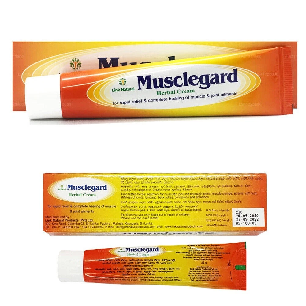 Link Musclegard Herbal Cream Rapid Relief for Backache & Muscular Pain 25G Items size - 25g Link Natural Musclegard Herbal cream for rapid relief & complete healing of muscle and joint ailments Link Musclegard is a herbal cream, manifactured from proven. time tested ayurvedic herbal ingredients for ailments in joints and muscles. It is specially formulated using modern science and technology to maximize its effectiveness. The special advantage of Link Musclegard is that it nourishes & strengthens the muscles, rapidly bringing them back to normalcy. The synergistic action of the herbal ingredients in Link Musclegard gives rapid relief & complete healing for: muscular ailments sprains lumbago abrasions joint and neuralgic pains stiff neck back aches knee pains muscle cramps stiffness of joints contusions This combination of extracts from twenty five main plant species has rubefacient and mild local anaesthetic activity. The plants used in Link Musclegard have been recognised in the traditional pharmacopoeias as effective in reducing stiffness in joints, arthritic and rheumatic conditions and lumbago. Modern scientific studies have shown some of them to have smooth muscle relaxant, anti – inflammatory and analgesic activity. Main herbal Ingredients: Acorus calamus L.(Araceae) Aegle marmelos L.(Rutaceae) Alipinia galanga Hance.(Rubiaceae) Alysicarpus vaginalis (L.)DC(Leguminosae) Cedrus deodara (Roxb.)Loudon. (Pinaceae) Glycyrrhiza glabra L.(Fabaceae) Gmelina arborea L.(Verbenaceae) Hemidesmus indicus R.Br.(Asclepiadaceae) Mucuna prurens (Hook) D.C.(Leguminosae) Oroxylum indicum Linn.(Bignoniaceae) Vigna mungo L.(Fabaceae) Piper chaba Hunter.(Piperaceae) Piper longum L.(Piperaceae) Piper nigrum L.(Piperaceae) Plumbago indica L.(Plumbaginaceae) Premna integrifolia L.(Verbenaceae) Ricinus communis L.(Euphorbiaceae) Rubia cordifolia L.(Rubiaceae) Stereospermum suaveolens (Roxb.) Syzygium aromaticum L. (Myrtaceae) Saussurea lappa Clark.(Asteraceae) Tinospora cordifolia(Willd),Hook.(Menispermaceae) Tribulus terrestris L.(Zygophyllaceae) Withania somnifera (L.)Dunal.(Solanaceae) Zingiber officinale Rosc.(Zingiberaceae) Shipping Information: Shipping by Sri Lankan Register Post air mail. Free Shipping Worldwide. Your purchased item will be shipped to the address listed in your eBay account. Ensure that your shipping address and zip code are accurate and current. The package will be dispatched directly from Sri Lanka. Orders will be processed within 5 days of cleared payment. Expect delivery within 15-45 days, varying based on the destination country, customs clearance procedures, and holidays. Rest assured, all items will undergo thorough inspection and secure packaging before being sent out. Import duties, taxes, and charges are not integrated into the item price or shipping fees. Buyers are responsible for these additional costs. Prior to bidding or buying, we recommend checking with your country's customs office to determine the potential extra expenses. ***************************************************** FEEDBACK We deeply value your satisfaction and strive to provide you with the best shopping experience. Your feedback is incredibly important to us as it helps us understand your needs better and improve our services . CONTACT US "Got questions or concerns? We're here to help! Our dedicated customer support team is ready to assist you with anything related to your purchase. Whether you're seeking product information, tracking details, or assistance with returns, feel free to reach out. Your satisfaction is our priority, and we're committed to providing a seamless shopping experience. Contact us with confidence, and let us enhance your eBay shopping journey!"