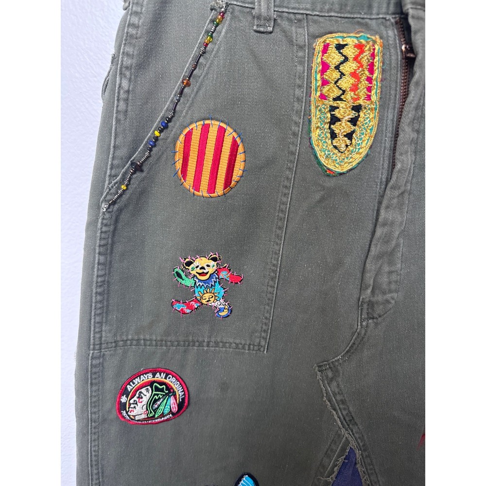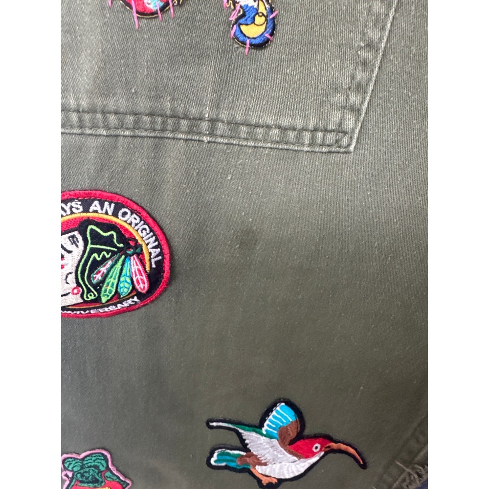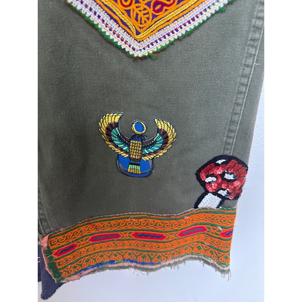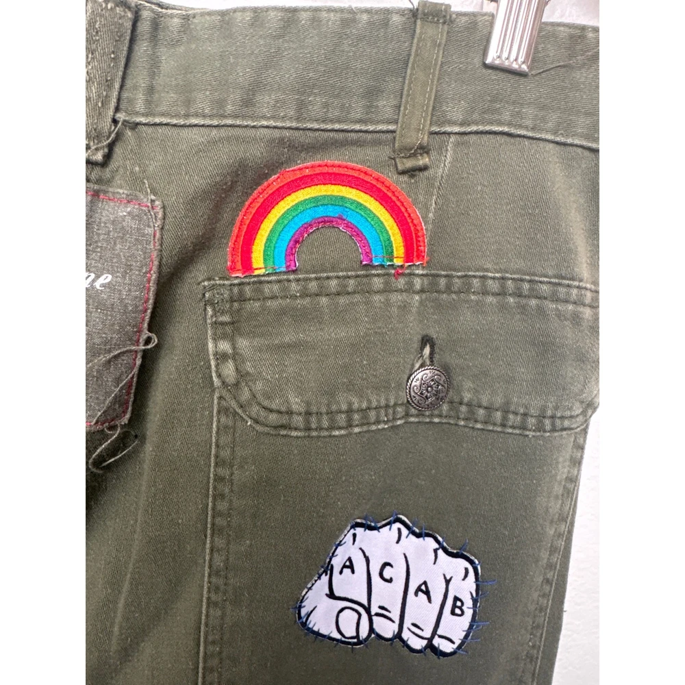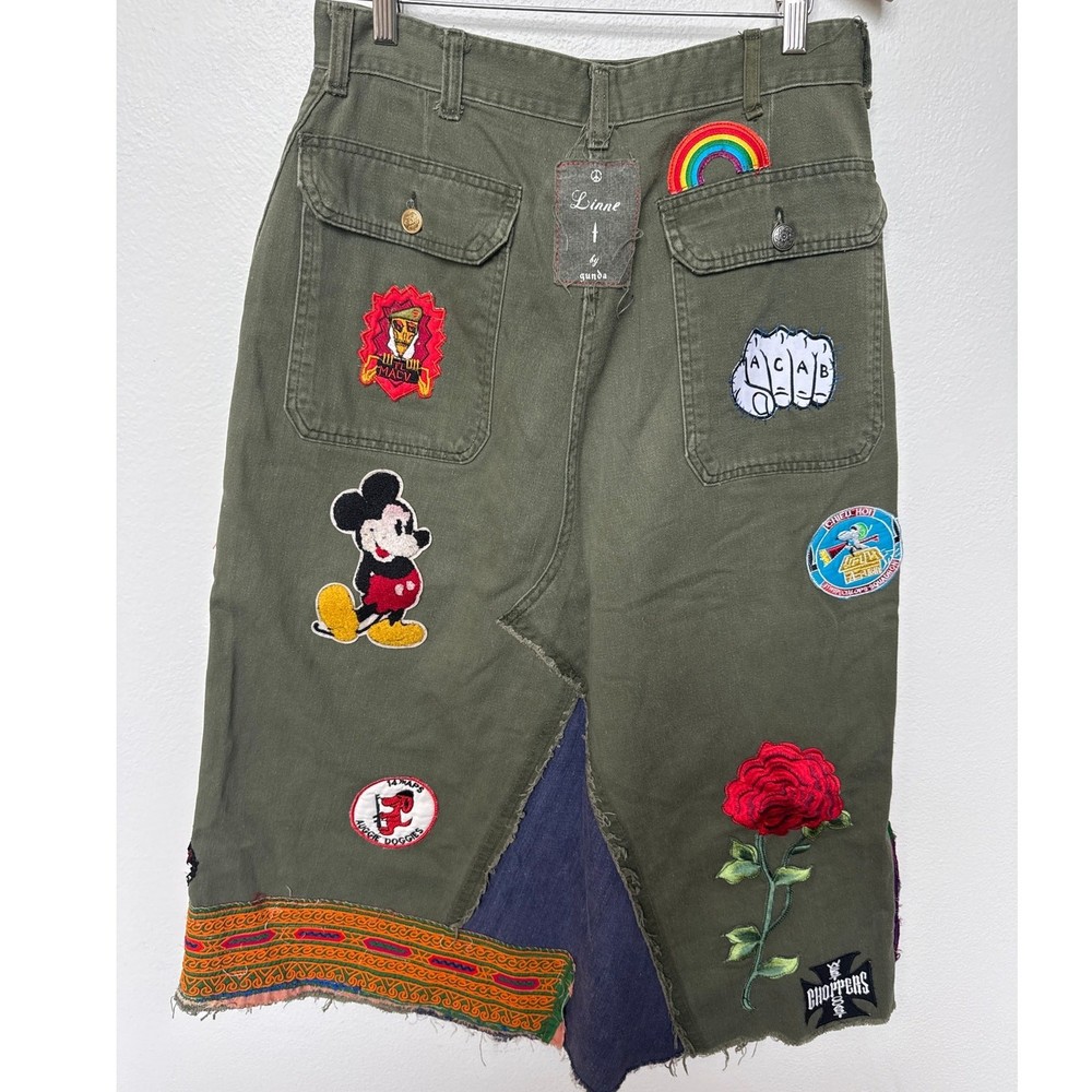 Linne by Gunda Japanese Denim Army Green Midi Skirt Upcycled vibe Goth, Grunge, Whimsy goth Numerous patches including Mickey Mouse, Rainbow, Mushroom - see photos Size tag is missing - check measurements Waist approx 15-15.5" Length 33.5" Perfect for Disney lovers or anyone who enjoys a quirky, artsy twist in their style, this skirt pairs effortlessly with sneakers, boots, or sandals for a cool, street-style-inspired look. Button and zip closure Side pocket Patch design Midi length Raw hem Cargo style flap pockets at the back Good preowned condition - minor signs of wear, no major holes or stains, a grease spot shown in photos, some wash wear casual, classic, minimalist, aesthetic, y2k, preppy, streetwear, running errands, chic, urban style, festive, concert, glam, grunge, hippie, hipster