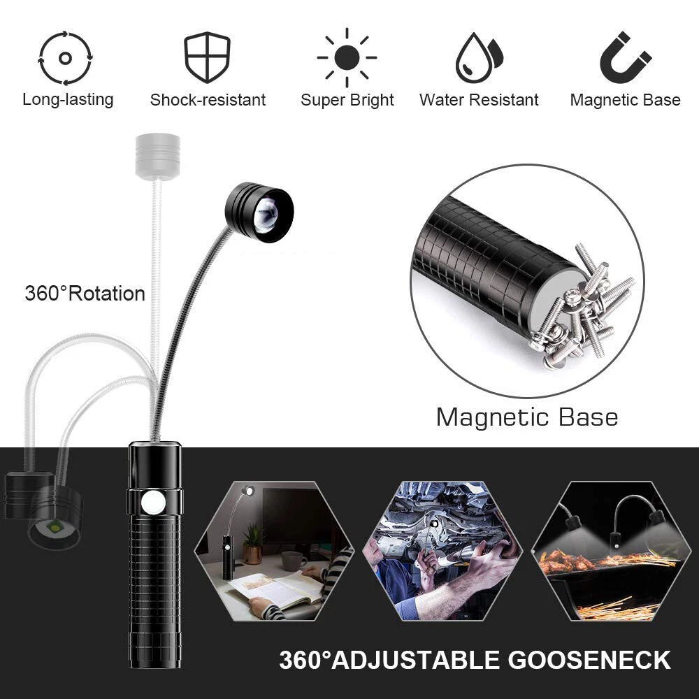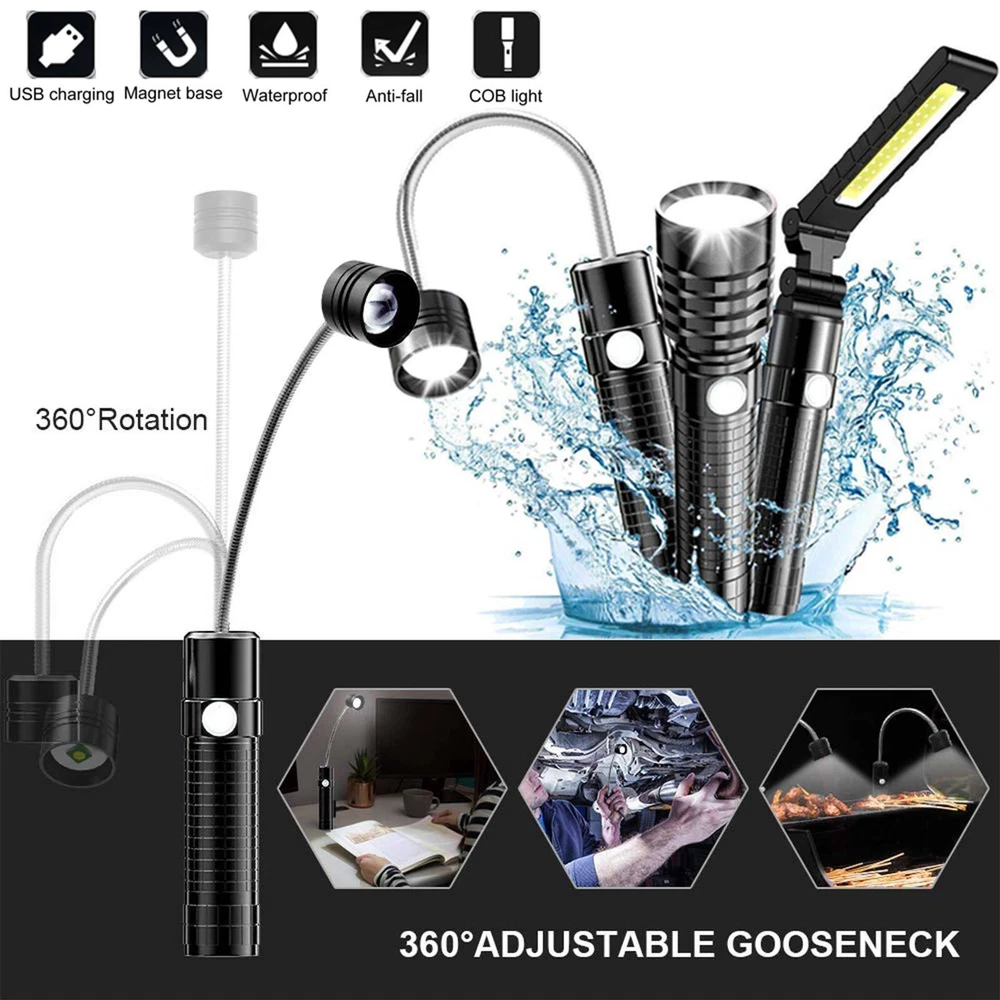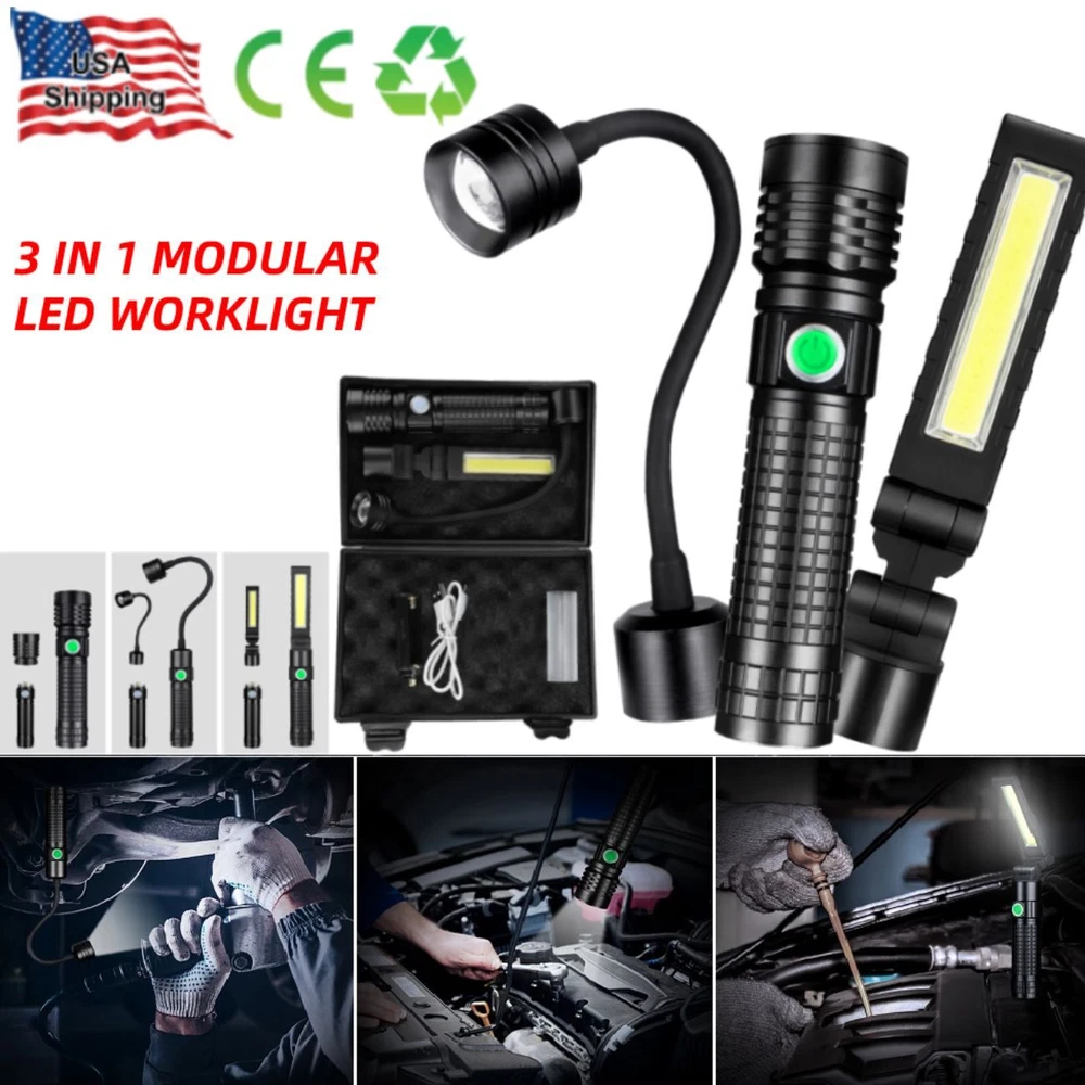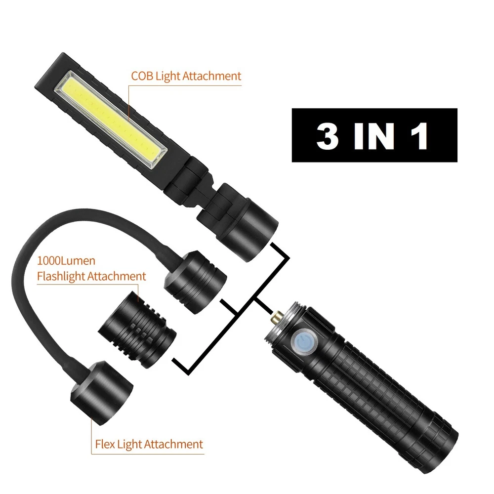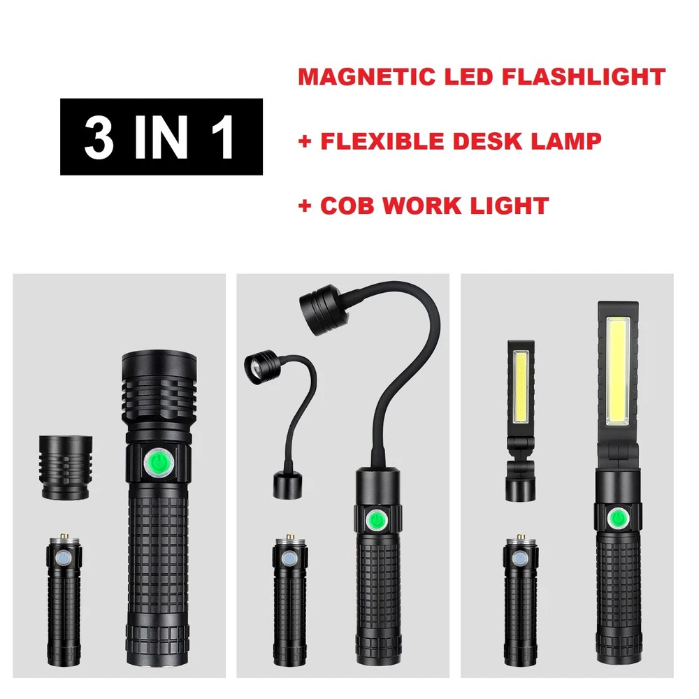 Magnetic COB LED Flashlight Work Light 3 in 1 Folding LED Torch Working Lamp ‼️‼️【Note】 Batteries not included, please feel free to contact us if any need. ⭐⭐⭐PERFECT FOR INDOOR AND OUTDOOR ACTIVITIES: The perfect flashlight to get the job done! The LED flashlight kit includes 3 interchangeable heads - a flashlight head, work light head, and flex-light head. Maneuver through narrrow spaces, light up your garage, or camp under the stars, all with the convenience of a single flashlight. Features: Magnetic LED COB Rechargeable Flashlight Torch 1. It uses class-leading LED chips that has the maximum brightness of 1000 lumens, provides up to 600ft, lights up an entire road or on the darkest of nights, perfect for most outdoor activities. 2. 【3 Modes & Zoomable】 Simply zooming this flashlight in or out for a spot light or as flood light; It features only 3 light modes (High / Low / Strobe) which effectively reduces the trouble of switching 5 modes. All for the best using experience! 3. 【Water Resistant & Virtually Indestructible】 Built for rough handling, this flashlight can survive a 10-foot drop or being temporarily submerged under water. You can even freeze it, and it will still work! Suitable for use in rain, snow, or emergency situations. 4. 【Ajustable Focus & Widely Application】 Come with zoomable function, you can adjustable focus range by rotating the head of the flashlight for different usage. This is the best flashlight tool for working, fishing, camping and outdoor activity etc. Come with Strobe Light, suitable for emergencies, power failure, circuit maintenance car breakdowns. COB Wok Light: 1. 【Multi-angle Adjustment】 The rechargeable work light has unique 360 degree rotate design, and upgraded a 180° rotatable LED lamp head. provide multi-angle illumination, work perfectly well in tight spots. 2. 【USB-C Rechargeable & Super Long Working Time】 The work light is USB-C rechargeable. The Built-in rechargeable battery(2200 mAh), has a good battery life, It only took about 2.5-3 hours to fully charge it from zero battery. This led work light up to 3.5-4 hours at 100% High light mode, 8.5-9 hours at 50% Low light mode after a full charge. 4 battery power indicator, clearly shows 25%, 50%, 75% and 100% power, so you can tell how much power left at any time. 3. 【Upgrade Super Strong Magnet Base & Metal Hook】 The magnetic bottom has a strong hold and the magnetic lights could be stuck to any metal steel and it is also not easy to fall off If be hit, they will hold in place when working in tight spaces. the hook is very convenient for you to put this magnetic work light in any place and make your hand free to finish the job. 4. 【Durable Material & Portable】 This led work lights is made of ABS+Aluminum alloy, anti-sweat and anti-slip, the head is aluminum which dissipates the heat effectively, prolongs the life of the lamp. Thanks to the foldable design, the mechanic light is easy to carry and it is small when folded and can be placed in a shirt or pants pocket, perfect for Handyman, welder, plumber, and professional mechanic. 5. 【Stand on its Own & Widely Used】 The magnetic light has a wider and stronger base. it will not tip over even if sit on a non-magnetic surface, so It can also stand on your table or desk. the work lights is perfect for car repairing, emergency, camping, traveling, hiking, Fishing, CNC lathes, maintenance, workshop, garage, power outages, home lighting, work at night and working under the hood. Multifunctional Gooseneck Flexible Flashlight Magnetic: 1. 【Flexible Shaft】 Powered by 3*AAA batteries(not included), portable LED flashlight is portable to take with you wherever you need to go. Also featuring a flexible gooseneck design, this handled light is fully adjustable to your lighting needs and allows you to focus the light exactly where you want. 2. 【Strong Magnetic Base】 Magnetic LED Flexible Light has strong magnetic base, which makes this work light to be stably attached to the metal surface. Except for taking up as little space as possible, magnet light release your hands, which makes your work operation convenient. 3. 【Zoomable】 High Brightness Lamp flashlight with telescoping design is adjustable from floodlight to spotlight. Zoomable lens easy to focus light exactly just as you expected. 4. 【Wide Application】 Portable lamp light can be used for camping, auto repair, workshop; drill light for BBQ and other outdoor activities; reading light, desk lamp, bedside light in sewing machine, workshop, labs light, desk lamp and other indoor activities. 5. 【High Quality Material】 Bendable inspection light features 360°flexible silicone-coating gooseneck hose and high-quality aluminum alloy makes this LED gooseneck work light durable. No rust, corrosion resistance, high temperature resistance, impact resistance and suitable for most of weather. Specification: 1. Type: LED Flashlight Rechargeable COB 2. Charging: Micro USB Cable 3. Material: Aluminum Alloy 4. 3 light modes: Strong-Weak-Flash 5. Battery types: 1*3.7v Li-ion Rechargeable Battery (not include) /1*26650 (not include) /3*AAA batteries (not include) Package Includes: (without Battery) 1x 3 in 1 Magnetic LED COB Rechargeable Flashlight 1x Flexible Desk Lamp 1x Cob Work Light 1x Usb Cable 1x Battery Sleeve 1x Battery Holder 1x Plastic Box On Jan 26, 2025 at 19:31:32 PST, seller added the following information: