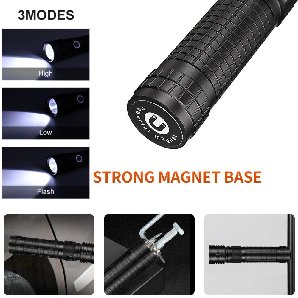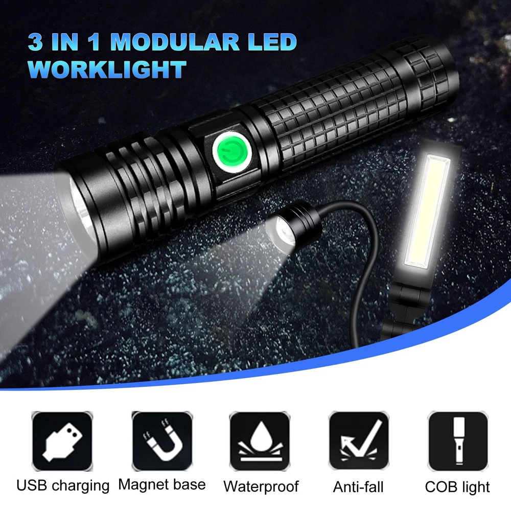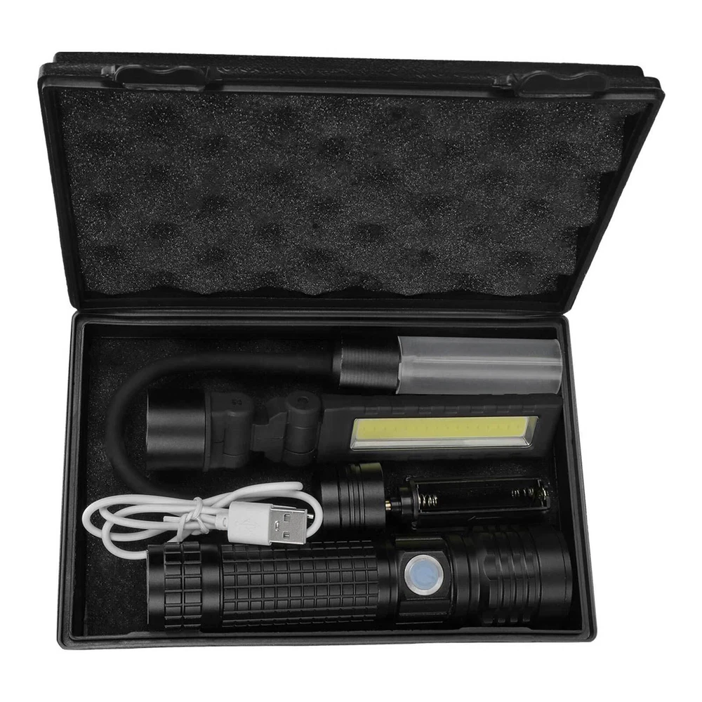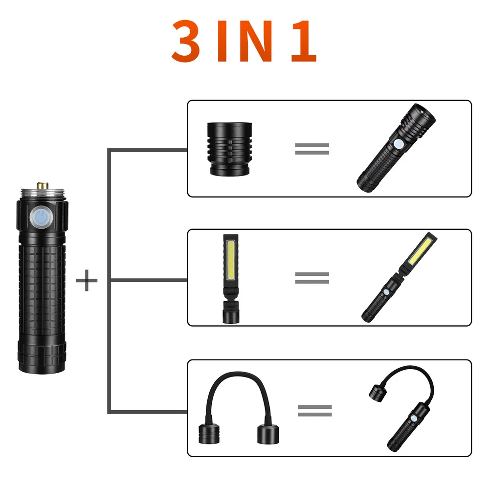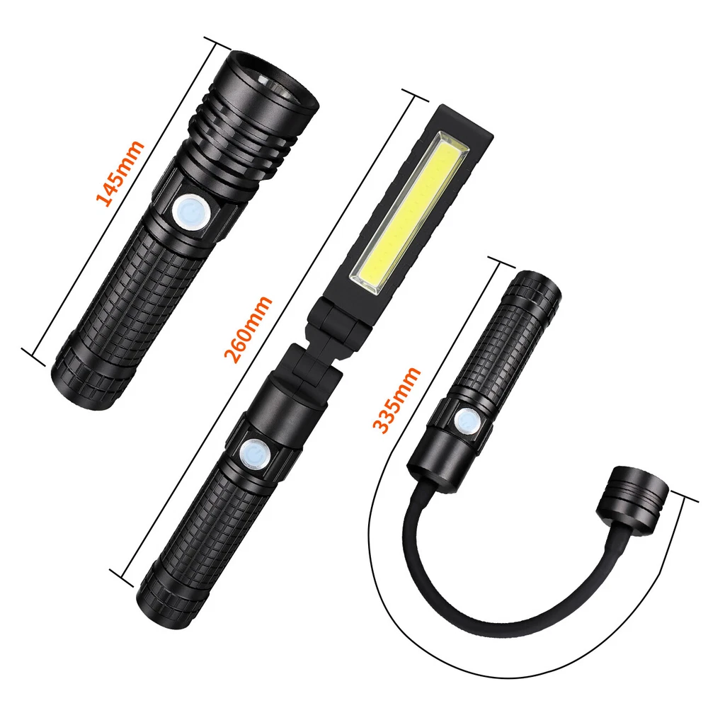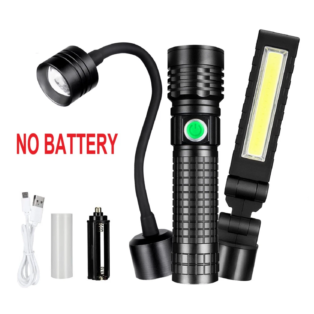 Magnetic COB LED Flashlight Work Light 3 in 1 Folding LED Torch Working Lamp ‼️‼️【Note】 Batteries not included, please feel free to contact us if any need. ⭐⭐⭐PERFECT FOR INDOOR AND OUTDOOR ACTIVITIES: The perfect flashlight to get the job done! The LED flashlight kit includes 3 interchangeable heads - a flashlight head, work light head, and flex-light head. Maneuver through narrrow spaces, light up your garage, or camp under the stars, all with the convenience of a single flashlight. Features: Magnetic LED COB Rechargeable Flashlight Torch 1. It uses class-leading LED chips that has the maximum brightness of 1000 lumens, provides up to 600ft, lights up an entire road or on the darkest of nights, perfect for most outdoor activities. 2. 【3 Modes & Zoomable】 Simply zooming this flashlight in or out for a spot light or as flood light; It features only 3 light modes (High / Low / Strobe) which effectively reduces the trouble of switching 5 modes. All for the best using experience! 3. 【Water Resistant & Virtually Indestructible】 Built for rough handling, this flashlight can survive a 10-foot drop or being temporarily submerged under water. You can even freeze it, and it will still work! Suitable for use in rain, snow, or emergency situations. 4. 【Ajustable Focus & Widely Application】 Come with zoomable function, you can adjustable focus range by rotating the head of the flashlight for different usage. This is the best flashlight tool for working, fishing, camping and outdoor activity etc. Come with Strobe Light, suitable for emergencies, power failure, circuit maintenance car breakdowns. COB Wok Light: 1. 【Multi-angle Adjustment】 The rechargeable work light has unique 360 degree rotate design, and upgraded a 180° rotatable LED lamp head. provide multi-angle illumination, work perfectly well in tight spots. 2. 【USB-C Rechargeable & Super Long Working Time】 The work light is USB-C rechargeable. The Built-in rechargeable battery(2200 mAh), has a good battery life, It only took about 2.5-3 hours to fully charge it from zero battery. This led work light up to 3.5-4 hours at 100% High light mode, 8.5-9 hours at 50% Low light mode after a full charge. 4 battery power indicator, clearly shows 25%, 50%, 75% and 100% power, so you can tell how much power left at any time. 3. 【Upgrade Super Strong Magnet Base & Metal Hook】 The magnetic bottom has a strong hold and the magnetic lights could be stuck to any metal steel and it is also not easy to fall off If be hit, they will hold in place when working in tight spaces. the hook is very convenient for you to put this magnetic work light in any place and make your hand free to finish the job. 4. 【Durable Material & Portable】 This led work lights is made of ABS+Aluminum alloy, anti-sweat and anti-slip, the head is aluminum which dissipates the heat effectively, prolongs the life of the lamp. Thanks to the foldable design, the mechanic light is easy to carry and it is small when folded and can be placed in a shirt or pants pocket, perfect for Handyman, welder, plumber, and professional mechanic. 5. 【Stand on its Own & Widely Used】 The magnetic light has a wider and stronger base. it will not tip over even if sit on a non-magnetic surface, so It can also stand on your table or desk. the work lights is perfect for car repairing, emergency, camping, traveling, hiking, Fishing, CNC lathes, maintenance, workshop, garage, power outages, home lighting, work at night and working under the hood. Multifunctional Gooseneck Flexible Flashlight Magnetic: 1. 【Flexible Shaft】 Powered by 3*AAA batteries(not included), portable LED flashlight is portable to take with you wherever you need to go. Also featuring a flexible gooseneck design, this handled light is fully adjustable to your lighting needs and allows you to focus the light exactly where you want. 2. 【Strong Magnetic Base】 Magnetic LED Flexible Light has strong magnetic base, which makes this work light to be stably attached to the metal surface. Except for taking up as little space as possible, magnet light release your hands, which makes your work operation convenient. 3. 【Zoomable】 High Brightness Lamp flashlight with telescoping design is adjustable from floodlight to spotlight. Zoomable lens easy to focus light exactly just as you expected. 4. 【Wide Application】 Portable lamp light can be used for camping, auto repair, workshop; drill light for BBQ and other outdoor activities; reading light, desk lamp, bedside light in sewing machine, workshop, labs light, desk lamp and other indoor activities. 5. 【High Quality Material】 Bendable inspection light features 360°flexible silicone-coating gooseneck hose and high-quality aluminum alloy makes this LED gooseneck work light durable. No rust, corrosion resistance, high temperature resistance, impact resistance and suitable for most of weather. Specification: 1. Type: LED Flashlight Rechargeable COB 2. Charging: Micro USB Cable 3. Material: Aluminum Alloy 4. 3 light modes: Strong-Weak-Flash 5. Battery types: 1*3.7v Li-ion Rechargeable Battery (not include) /1*26650 (not include) /3*AAA batteries (not include) Package Includes: (without Battery) 1x 3 in 1 Magnetic LED COB Rechargeable Flashlight 1x Flexible Desk Lamp 1x Cob Work Light 1x Usb Cable 1x Battery Sleeve 1x Battery Holder 1x Plastic Box On Jan 26, 2025 at 19:31:32 PST, seller added the following information: