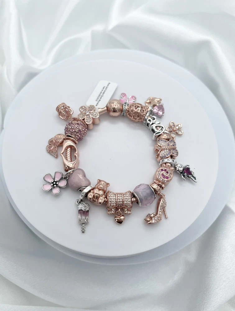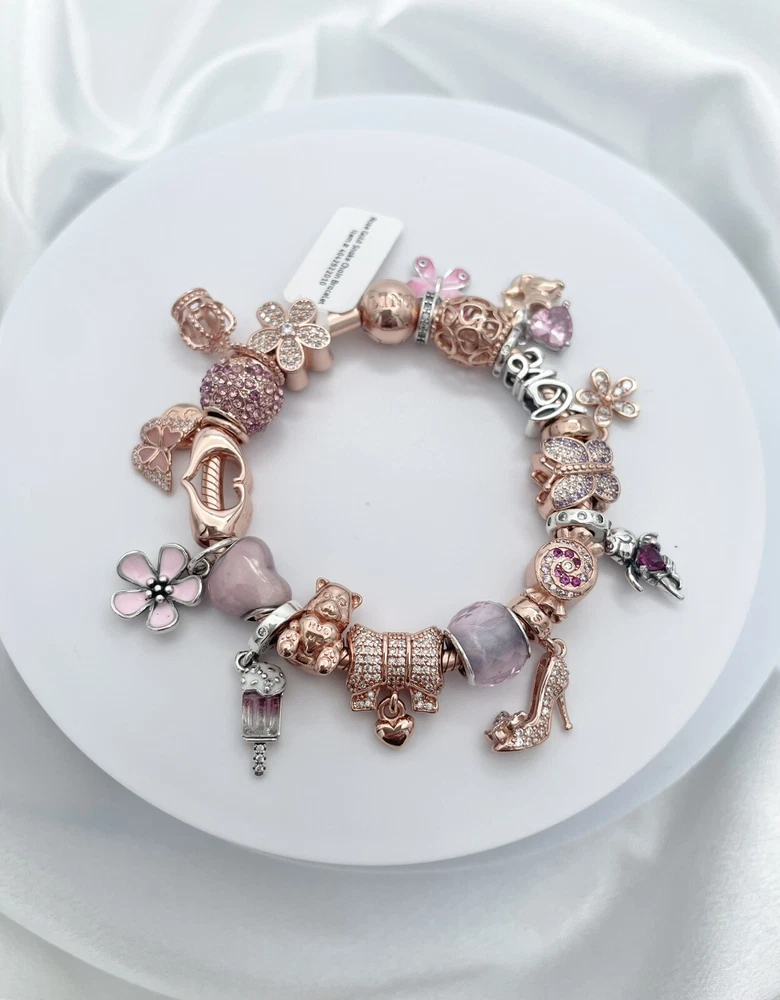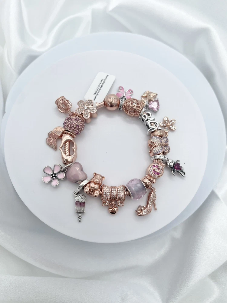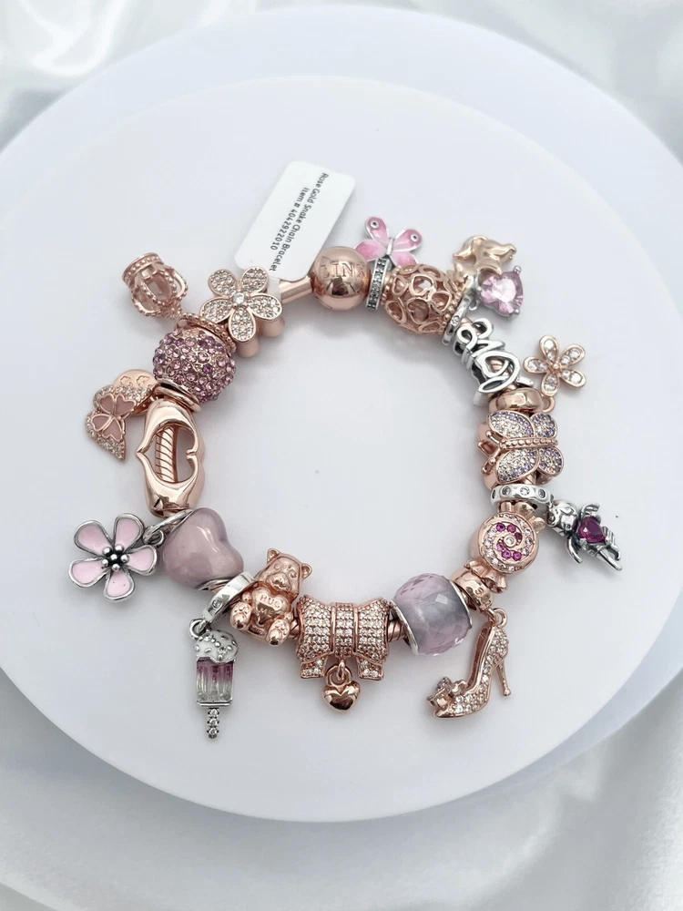 Linx rose gold snake chain style charm bracelet in 18 K rose gold over 925 sterling silver, with a ball clasp, featuring the signature Linx logo. This bracelet is sure to become a cherished part of your jewelry collection. Size 7.5. Sizes 6.3, 6.7, 7.1, 7.9, and 8.3 are also available. Should you require one of these sizes, please message us and we can create a custom listing for you in your requested size. Bracelet comes with 1 Pandora and 19 Linx charms and 18 K rose gold over 925 Sterling silver and 925 sterling silver. Linx pieces are excellent quality! All items are new and ship directly from Linx Jewelry Company The bracelet will Include a Luxury, velvet, anti tarnish jewelry pouch and Linx Sterling silver polishing cloth.