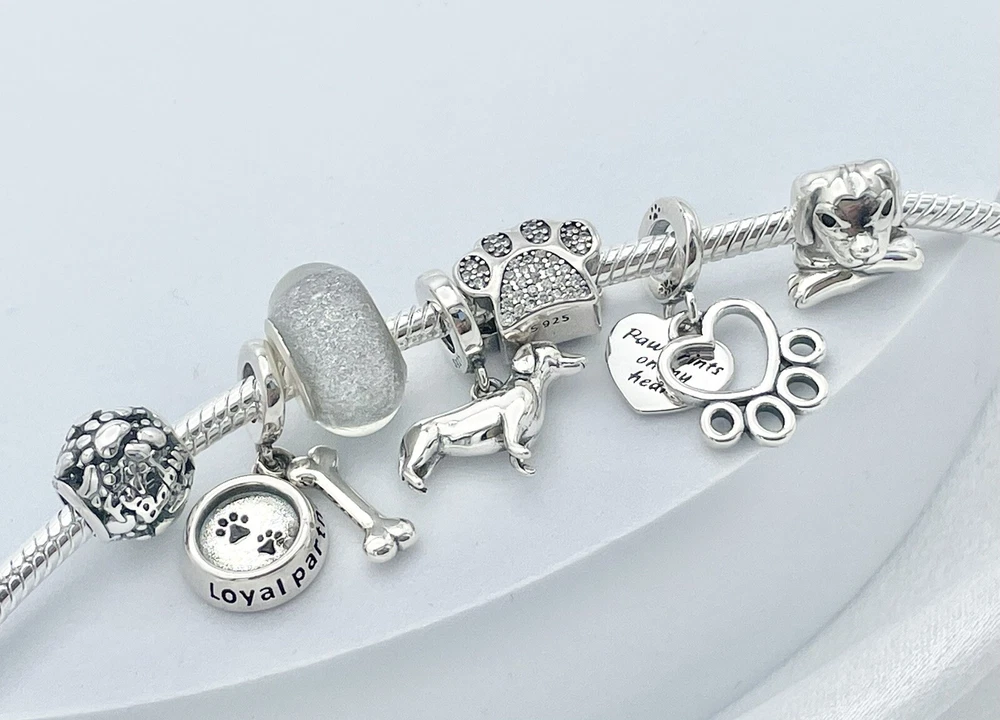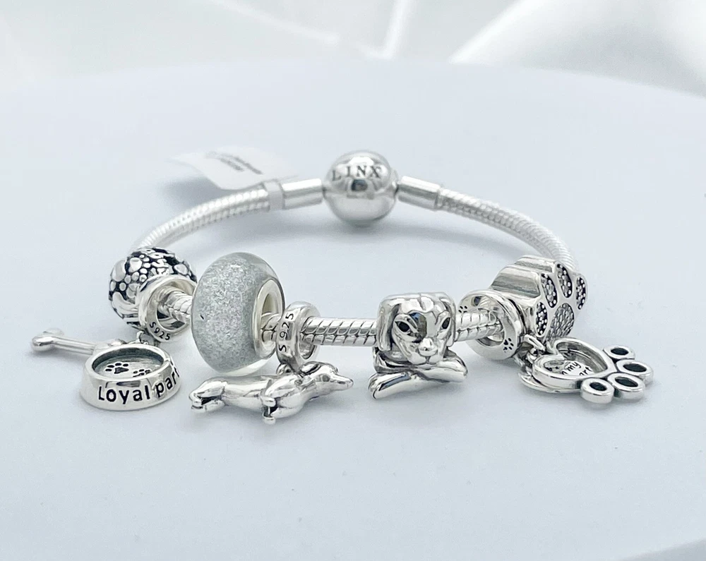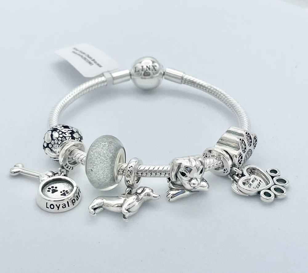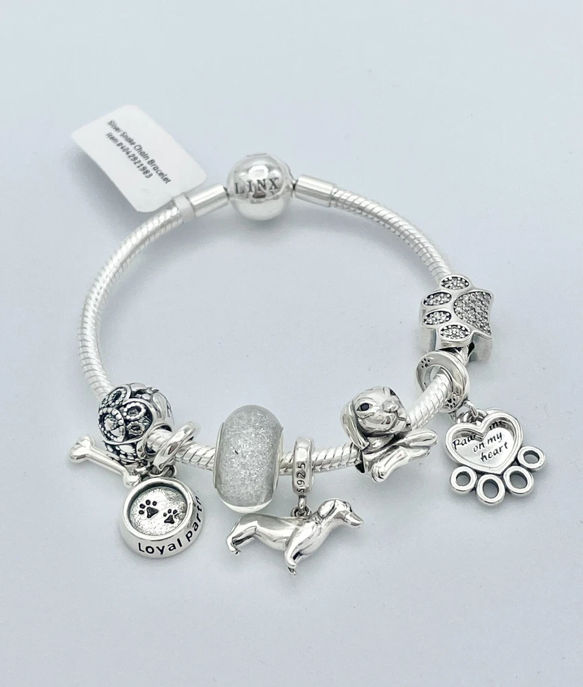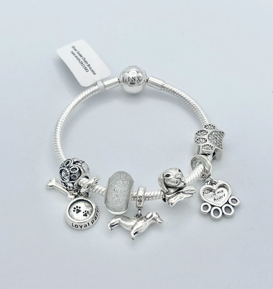 Linx snake chain style charm bracelet in 925 sterling silver, with a ball clasp, featuring the signature Linx logo. This beautiful bracelet features 7 Linx charms also in 925 Sterling silver. Size 7.5 Bracelet is also available in sizes 6.3 (toddler size), 6.7, 7.1, 7.9, and 8.3. Should you require one of these sizes, please message us prior to purchasing and we will create a listing for you in your requested size. Please remember to add an additional inch to the measurement of your wrist in order to allow room for your charms, as the charms will cause the bracelet to fit a bit tighter. Bracelet is new with tags and will also come with the original Linx velvet jewelry pouch, and Linx sterling silver polishing cloth.