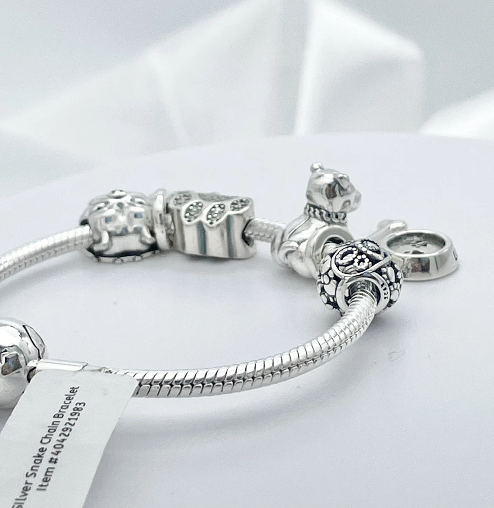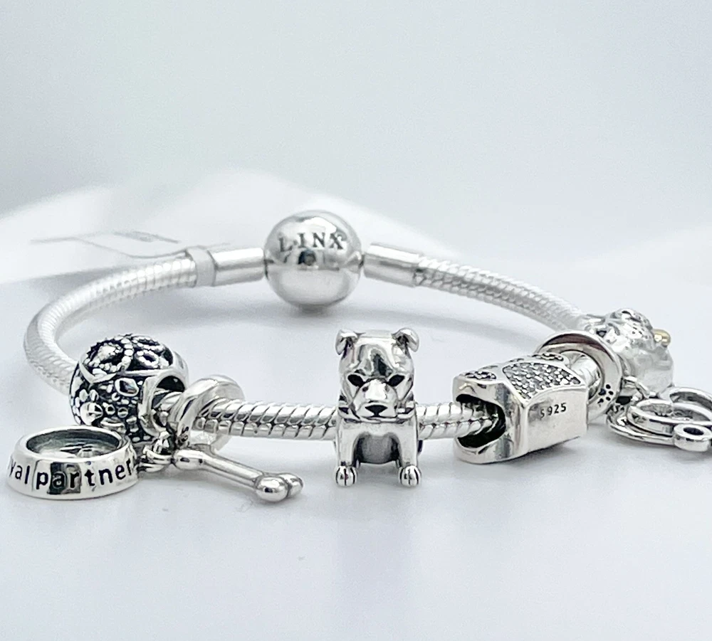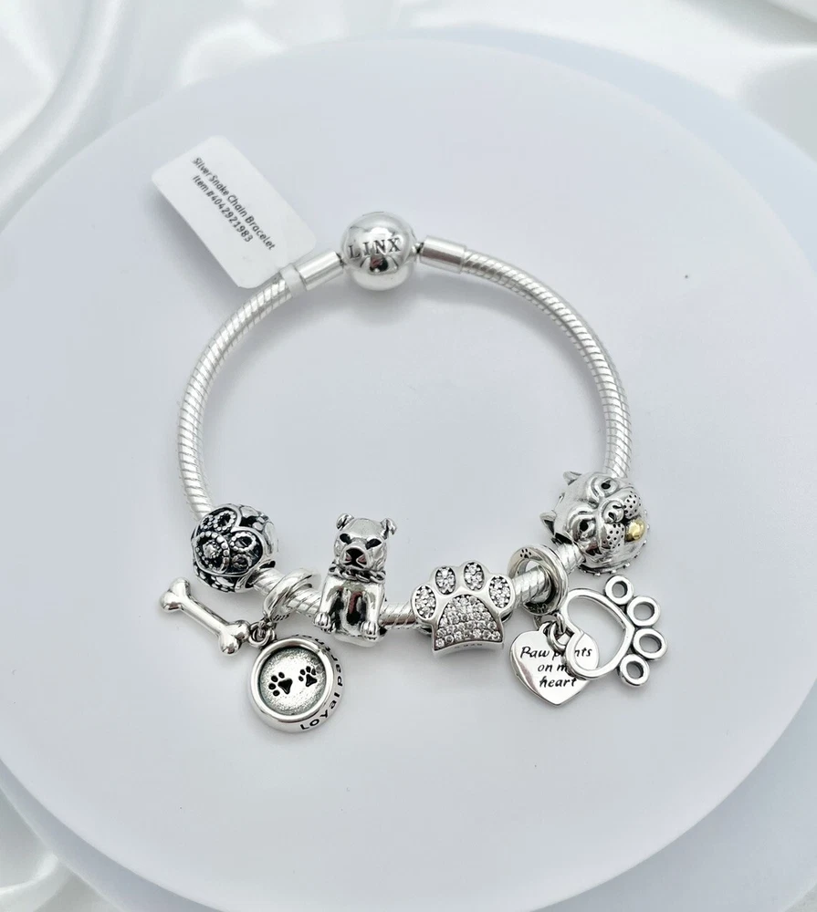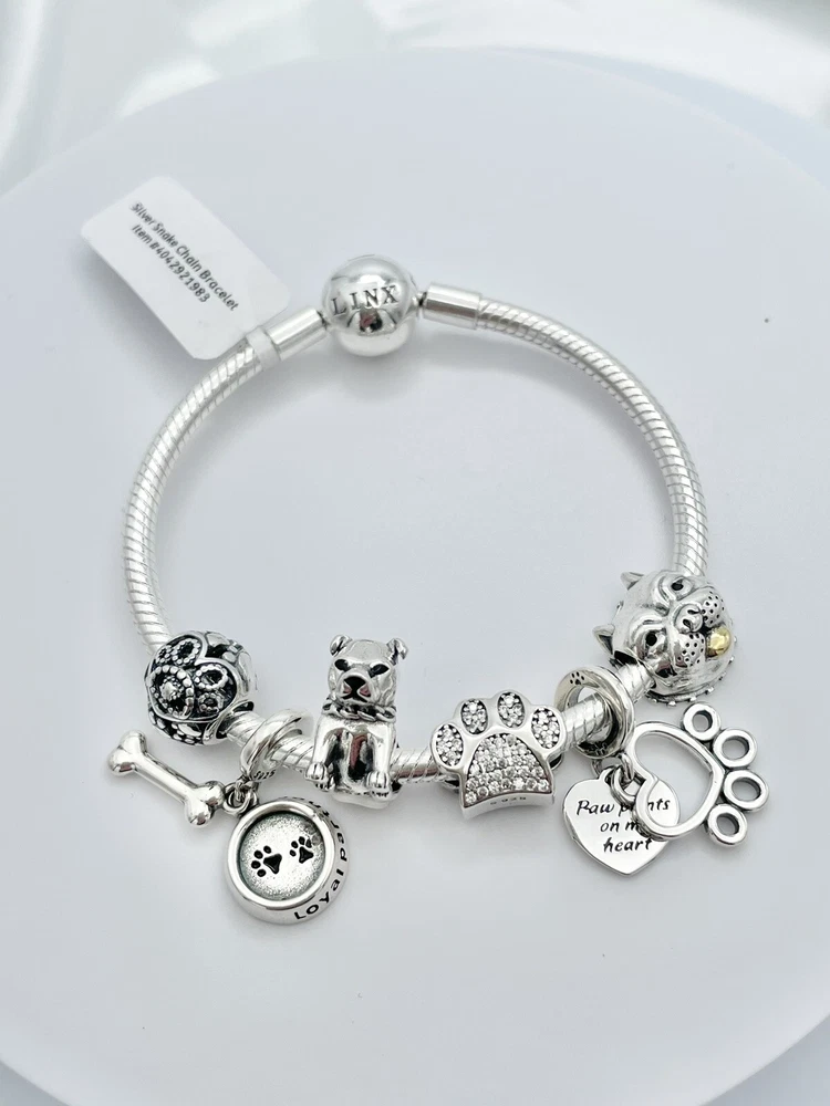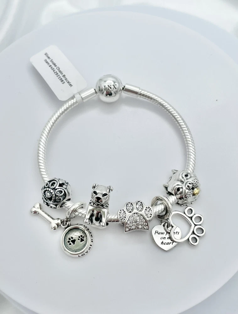 Linx Silver Snake Chain Bracelet with Pitbull Themed Charms 925 Sterling Silver