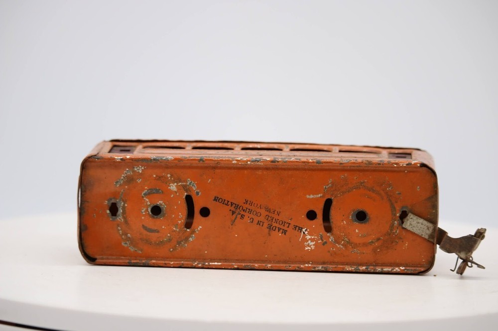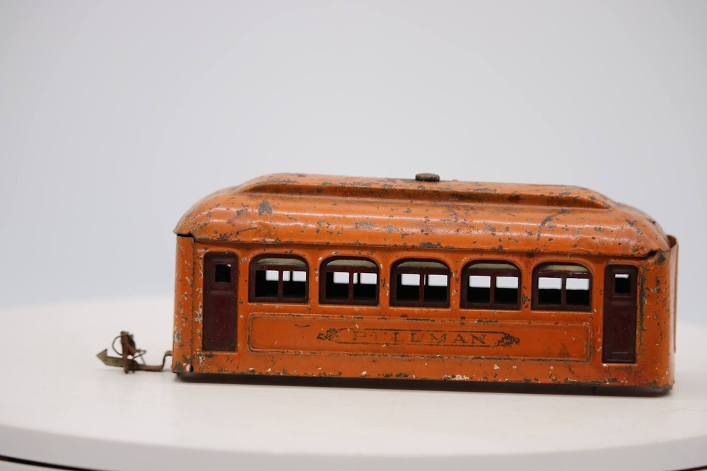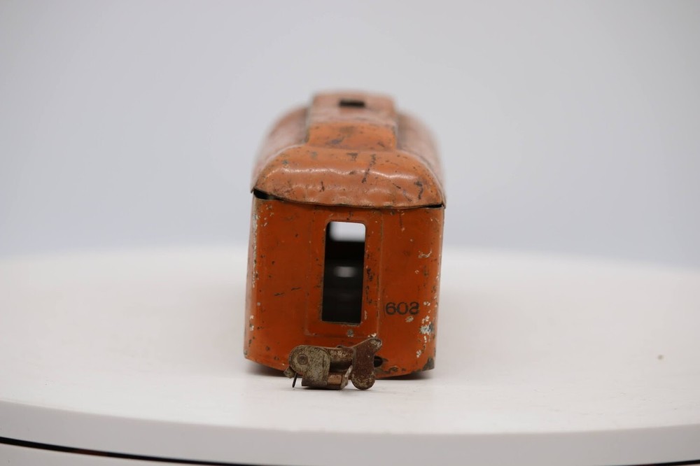 Material: Metal Year Manufactured: 1943 Vintage: Yes Control System: Analog Gauge: O Theme: Transportation Grade: C-2 Restoration Required Replica of: Pullman Rail System: Three-Rail System Power Type: AC SKU: 001931 Features: Painted Age Level: 17 Years & Up Time Period Manufactured: 1930-1939 MPN: 608 Corporate Roadname: Lionel Brand: Lionel Scale: 1:48 Assembly Status: Unassembled Kit Type: Passenger Car Color: Orange Country/Region of Manufacture: United States