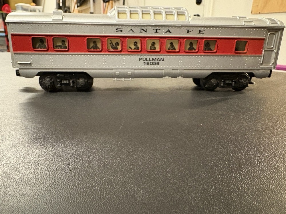 This Lionel Santa Fe Pullman passenger car is a fantastic addition to any O gauge layout! The detailing is impressive, from the crisp Santa Fe lettering to the realistic window frames. It rolls smoothly on the tracks and couples securely with other cars. The classic red and silver paint job looks sharp under layout lighting. Perfect for collectors or anyone wanting to add vintage charm to their train set. Highly recommended for its quality and nostalgic appeal!