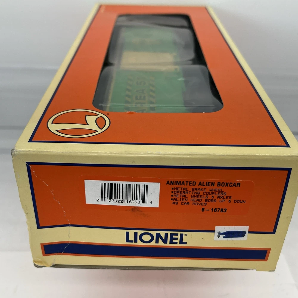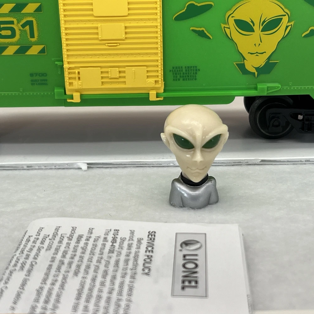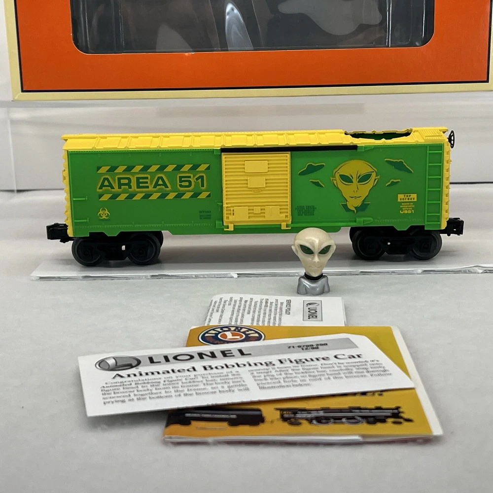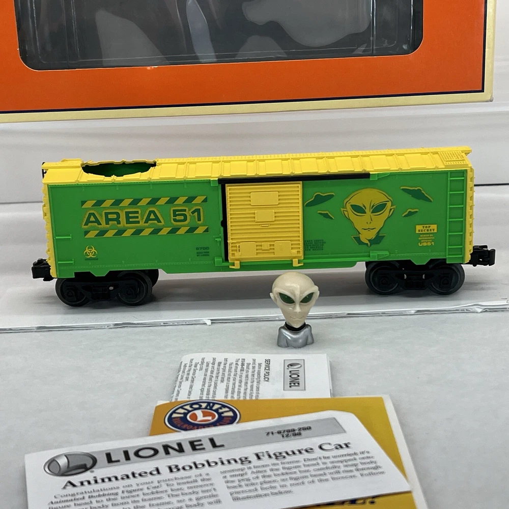LIONEL AREA 51 ANIMATED ALIEN BOBBING HEAD BOX CAR O GAUGE 3 RAIL 6-16793 USED!! ORIGINAL BOX. WILL BE PACKED TO ENSURE SAFE DELIVERY! Winning US bidder receives FREE SHIPPING USPS Priority UPS !! Canada Priority shipping is available . All other countries please email for a mailing quote. Thanks for looking! I ship everyday!!!!