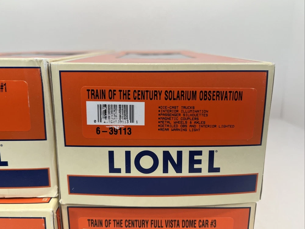 LIONEL TRAIN SPIRIT OF THE CENTURY 15" ALUMINUM 4 CAR PASSENGER SET O GAUGE THREE RAIL 6-39109 INCLUDES 6-39110 "SPIRIT" VISTA DOME CAR 6-39111 "OF THE" VISTA DOME CAR 6-39112 "CENTURY" VISTA DOME CAR 6-39113 "LIONEL" SOLARIUM OBSERVATION CAR NEW!!. ORIGINAL BOXES. BEAUTIFUL ALUMINUM. UNTESTED. STILL FACTORY WRAPPED. Passenger Car Features: O-Gauge, O-Scale Extruded aluminum bodies Die-cast trucks Stamped metal frame Interior illumination Exterior blinking end of train light on observation car Die-cast operating knuckle couplers Detailed interiors including molded figures Metal wheels & axles Each car length: 15" Minimum curve: O-31 WILL BE PACKED TO ENSURE SAFE DELIVERY ! Winning US bidder receives FREE SHIPPING USPS Priority UPS !! Canada Priority shipping is available . All other countries please email for a mailing quote. Thanks for looking! I ship everyday!!!!