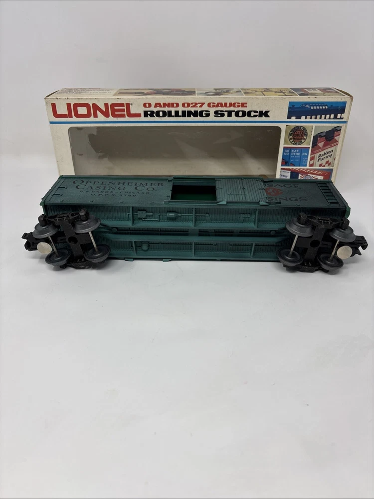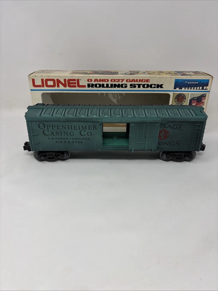 The product is a Lionel Box Car in green color, specifically the Lionel 6-5700 Train Box Car Oppenheimer Casing Company Reefer Car. It is designed for O-27 gauge model railroads and features the branding of Lionel. Please refer to photos for condition very clean and well taken care of.