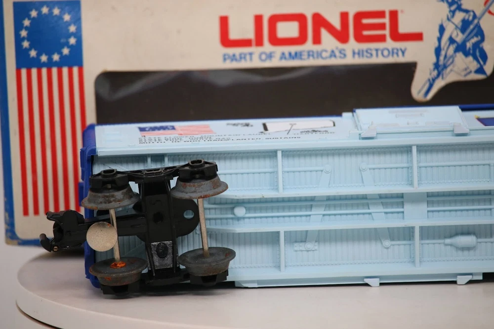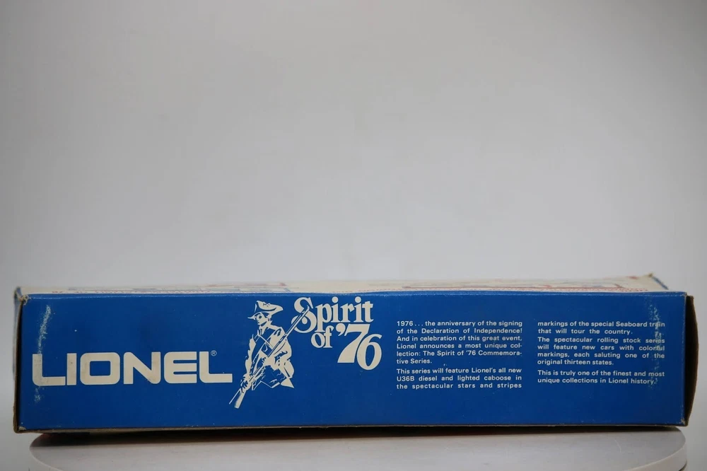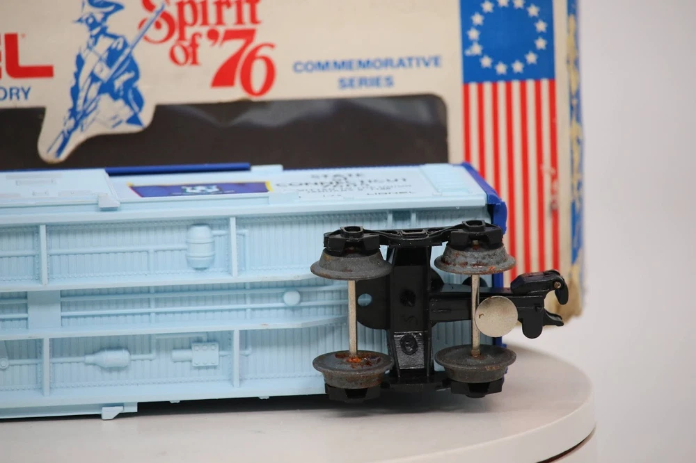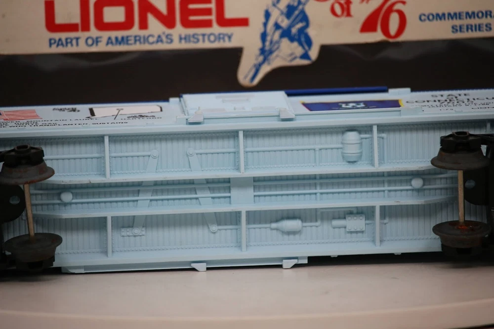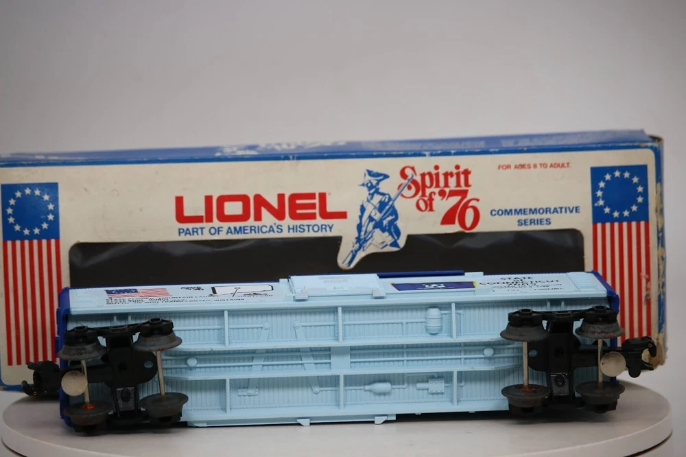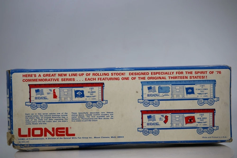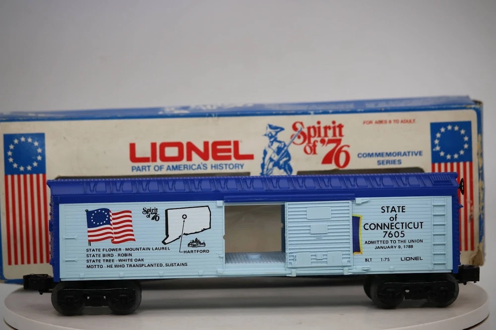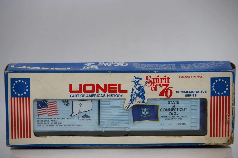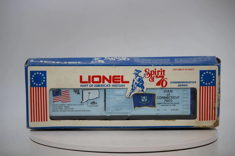 Here is a Lionel 6-7605 O Gauge Spirit of 76 State of Connecticut Boxcar #7605. This car is the from the famous Lionel Bicentennial Set from 1974-76. The complete set includes the 1776 U36B Diesel, 13 boxcars numbered 7601 through 7613, each one commemorating one of the original 13 states in order of their admission to the Union, and the 7600 Caboose. This is a very sharp set and the decorations are attractive and well done. This car features a very durable plastic construction with sliding doors, molded details, plastic trucks, metal wheels and axles, operating knuckle couplers, and attractive decoration. This item has been graded per TCA standards C-7: Excellent based on visual appearance. The wheels and trucks show signs of wear. The overall appearance of this item may be improved with a gentle and thorough cleaning. The instruction manual is not included. The original box is included. Please see my pictures for additional features. Overall condition is Excellent. Condition: Excellent ( C-7 ) Operational Status: Not Applicable Original Box: Yes ( P-7 ) Manufacturer: Lionel Model Number: 6-7605 Years Manufactured: 1974 - 1976 Road Name: Spirit of 76 Scale/Era: O MPC Model Type: Freight Cars PLEASE READ BEFORE PURCHASING Condition: Please review all photos carefully for details on the item?s condition. Photos are part of the description, and any notable flaws will be highlighted. Combined Shipping: If purchasing multiple items, request a revised invoice before paying to ensure accurate combined shipping costs. eBay?s system may not calculate this correctly, leading to overcharges. Lighting Disclaimer: Photos are taken under bright lighting to highlight details, which may cause slight variations in color or hue depending on your lighting. If you need additional photos (e.g., in natural light) or more details, please ask before purchasing. As-Is Items: Items marked ?AS-IS? are untested and sold at a discount. These items may work but could also be better suited for parts. Refunds will cover only the item price, not shipping. What?s Included: Only the items shown in the photos and described in the listing are included in the purchase. Try it out: Before you try to operate your new purchase, we strongly recommend that you have the checked and serviced (lube, oil, batteries if required) We strive to describe items thoroughly and provide clear photos. If you have any questions or concerns not addressed in the listing, feel free to ask before purchasing. Thank you for shopping with us!