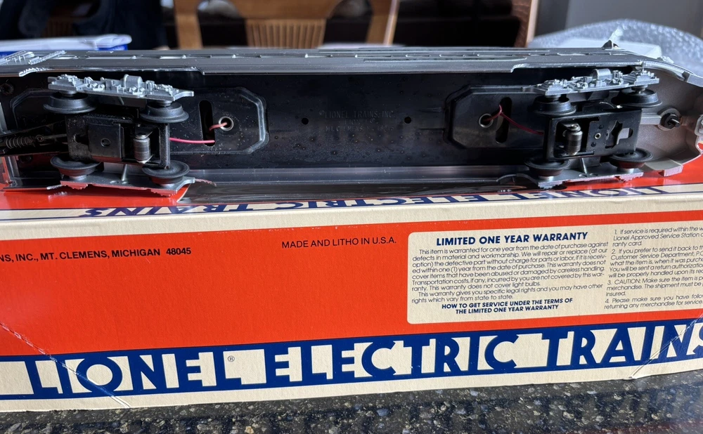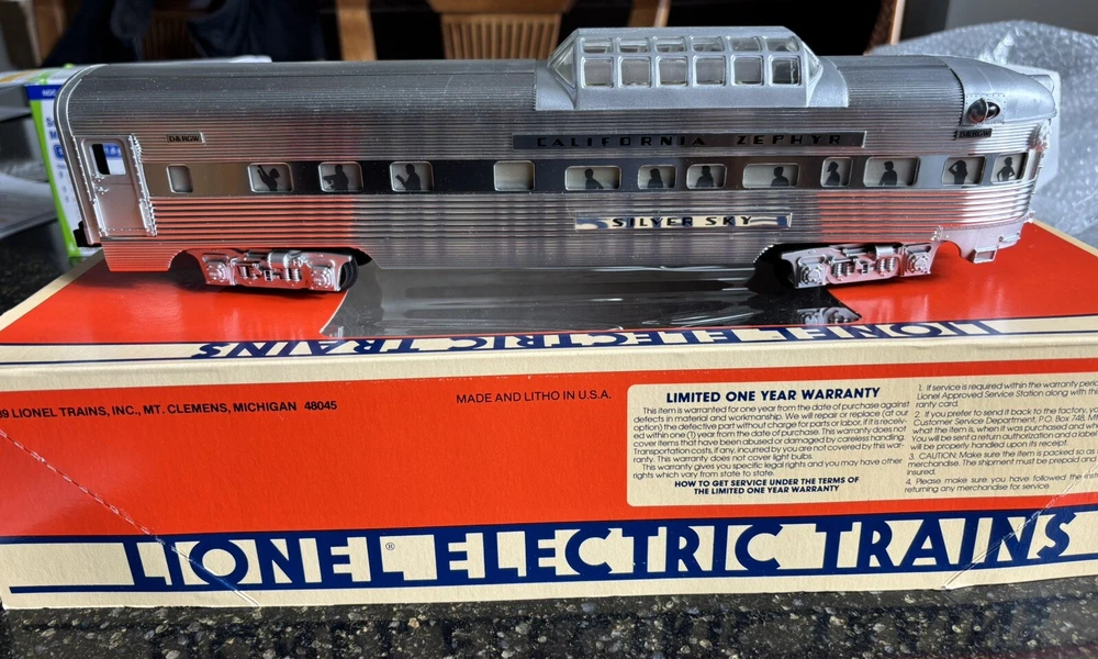 The Lionel Electric Train California Zephyr Silver Sky Vista Observation Car 6-19127 is a vintage O gauge passenger car manufactured in 1993 as part of the Lionel Electric Trains franchise. This aluminum car features a silver color scheme, measures 18 inches in length at a 1:48 scale, and is designed to operate on a three-rail system. The car replicates the Denver & Rio Grande Western's California Zephyr train, with light function and a theme centered around the railroad.