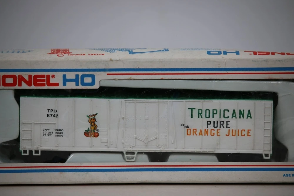 Lionel HO Scale #5-8742 Tropicana Box Car Look closely at the pictures to see further details. We ships USPS PLEASE see photos for detailed condition!! AC PLEASE LOOK AT THE PHOTOS CAREFULLY BEFORE PURCHASING!! If you are purchasing more than one item from us and would like combined shipping, PLEASE request an adjusted invoice from us while still in the cart and BEFORE paying. eBay does not usually calculate combined shipping accurately and you might get overcharged. Please be aware that when we photograph items, we use lighting that will show the details well. Although we try to present the product as accurately as possible, the lighting may affect the overall look of the item by appearing lighter/darker or possibly a different hue than the actual item. Depending on the type of lighting you have in your home, there may be some differences between the photos and the actual item. If this is a concern of yours, please feel free to request additional photos made in natural lighting or ask for a more detailed description of the item PRIOR TO PURCHASE! PLEASE NOTE: We greatly appreciate your interest in our item for sale. We look forward to a pleasant, quick and satisfying transaction for everybody, so please note the following information before bidding. Thank you! ITEM DESCRIPTIONS: * We will try to describe items well and provide plenty of photos. Please review these carefully before bidding or purchasing. * Only the items pictured and described are what you will receive when purchased. * We will occasionally offer an item clearly marked "AS-IS". This means that we are not sure if it works because we are unable to test it for whatever reason. We will offer these at a discounted price then a similar "working" item. It is possible that these items will work fine, but it also is possible that these items are more useful for their parts. Please only bid on or purchase these items if you are well aware of this, as we will only provide refunds of actual item price (no shipping cost refunds) for these items. * If you have any questions that aren't addressed by the descriptions or photos, please feel free to ask before you bid. * May need detailed cleaning SHIPPING: * We usually do not offer shipping to international addresses, but ARE WILLING TO TAKE CONSIDERATIONS. * We try to pack items as carefully as possible, but damage may occur during shipping. If you receive an item that was damaged in shipping, please contact us and we will work with you to resolve the problem. * We will combine shipping costs for all items the same buyer purchases from us within 2 days. Please wait to pay for items until you're done shopping with us. Please contact us if you're expecting to buy more items from us, or to have us adjust the shipping costs. * We will usually ship items out within 24 hours of payment being received Sunday through Friday at noon. We will notify the buyer if there will be a delay in shipping for some reason. Please allow additional time for holidays and weekends when the post office is closed. If payment is received after noon (EST) on Friday, the item might not be shipped until the following Monday. * We do try to recycle shipping materials as much as possible. RETURNS: We abide by eBay's Money Back Guarantee. We definitely want our customers to be happy with their purchase! You may return an item within 30 days of receiving it with the following guidelines: * If the item is defective or damaged (unless we clearly marked the listing "AS-IS"), the buyer will receive a full refund after the buyer returns it and it is received by us. Customers who falsely claim their item is defective, damaged, or not as described in order to receive a full refund and free return shipping will be permanently blocked from making future purchases from us. * If the item is as described (including "AS-IS" items) and the buyer decides for any other reason than defective/damaged to return it, only the actual price of the item will be refunded once it has been returned and it is received by us. The buyer will be asked to pay all original and return shipping charges. This includes all reasons other than defective/damaged, including wrong size, wrong type, changed mind, etc. All "AS-IS" items will fall into this category of return. Please make sure the item is what you want before purchasing it. * Please contact us before initiating a refund request. FEEDBACK: We always leave feedback at the end of transaction. We consider the transaction to be over when we receive feedback from the buyer confirming the item arrived satisfactorily. If you are unsatisfied with your purchase please contact us before leaving neutral or negative feedback. WE APPRECIATE POSITIVE FEEDBACK IF YOU ARE SATISFIED WITH YOUR PURCHASE! THANK YOU FOR YOUR INTEREST IN THIS ITEM!