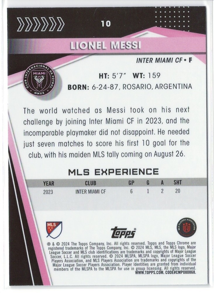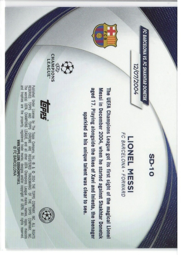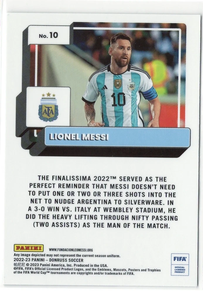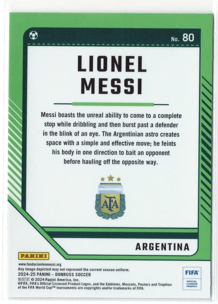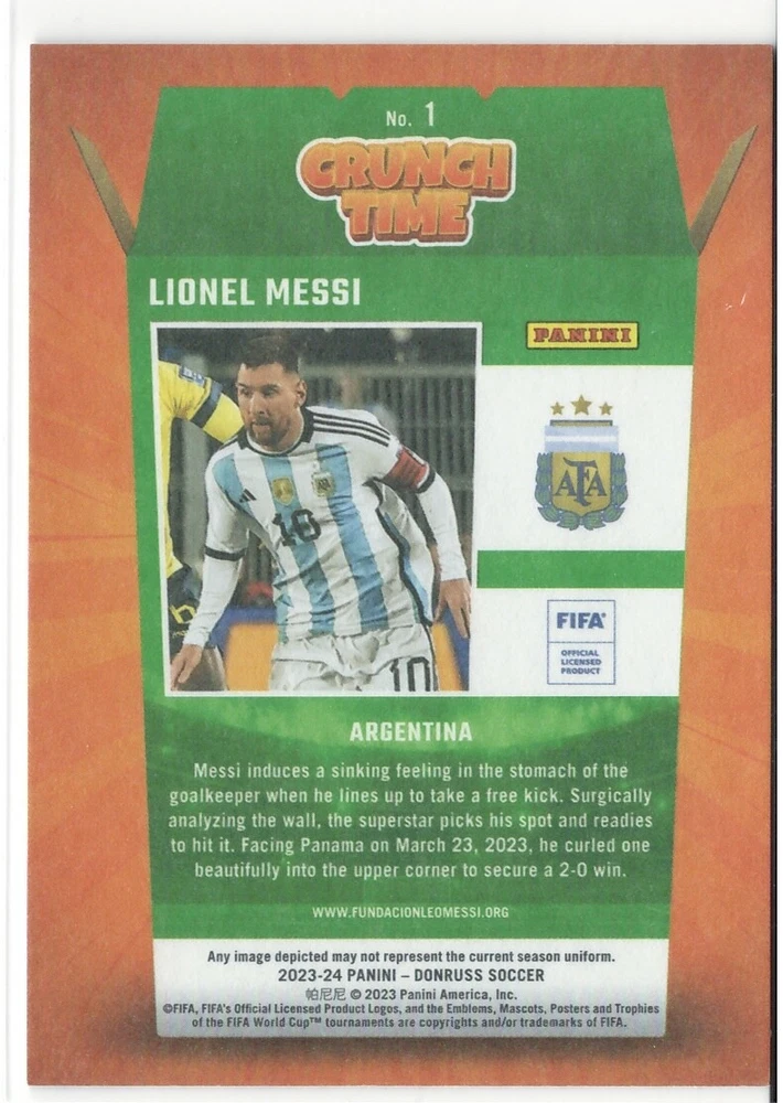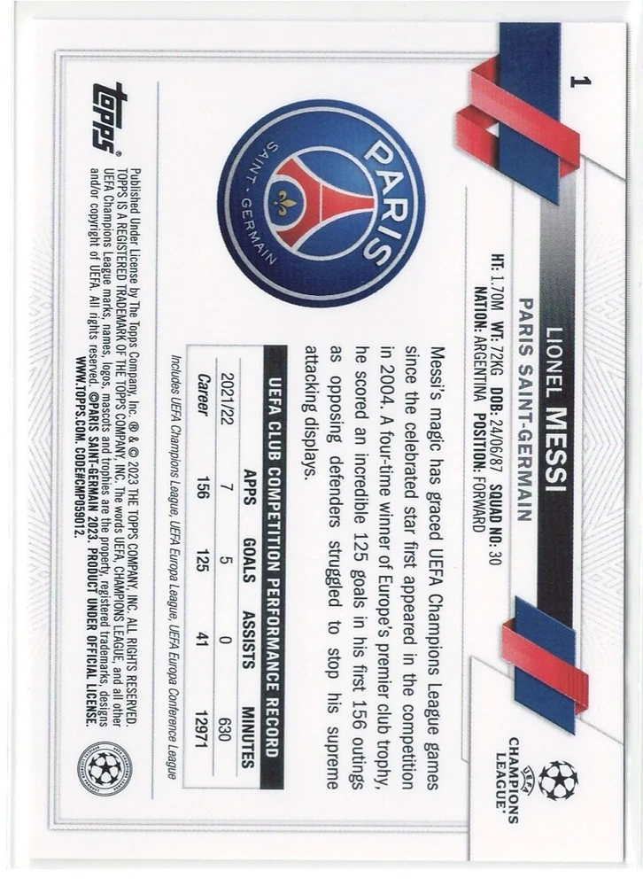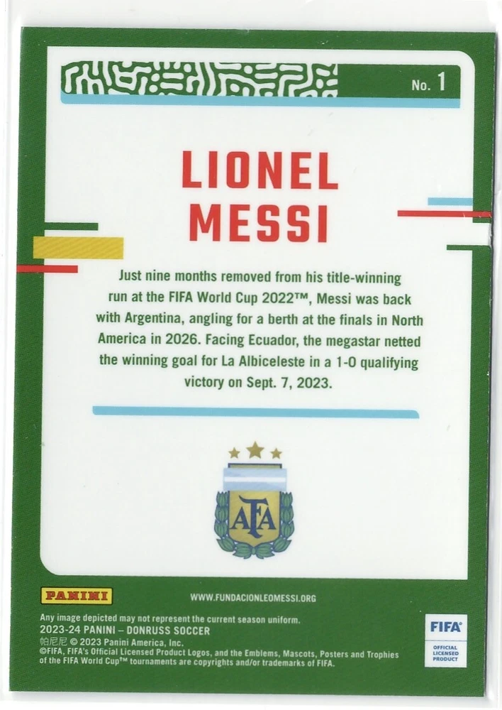 Event/Tournament:FIFA World CupPlayer/Athlete:Lionel MessiSet:2024-25 Panini Donruss Soccer, 2023-24 Panini Donruss Soccer, 2022-23 Panini Donruss Soccer, 2022-23 Topps UEFA CC 1st Edition, 2024 Topps Chrome MLS, 2023-24 Topps Chrome UEFA CCVintage:NoOriginal/Licensed Reprint:OriginalFeatures:Base Set, InsertAutographed:NoLanguage:EnglishLeague:UEFA Champions LeagueNumber of Cards:7Country/Region of Manufacture:ArgentinaSport:SoccerType:Sports Trading CardMaterial:Card StockManufacturer:ToppsTeam:Argentina, FC Barcelona, Inter Miami CF, Paris Saint-Germain