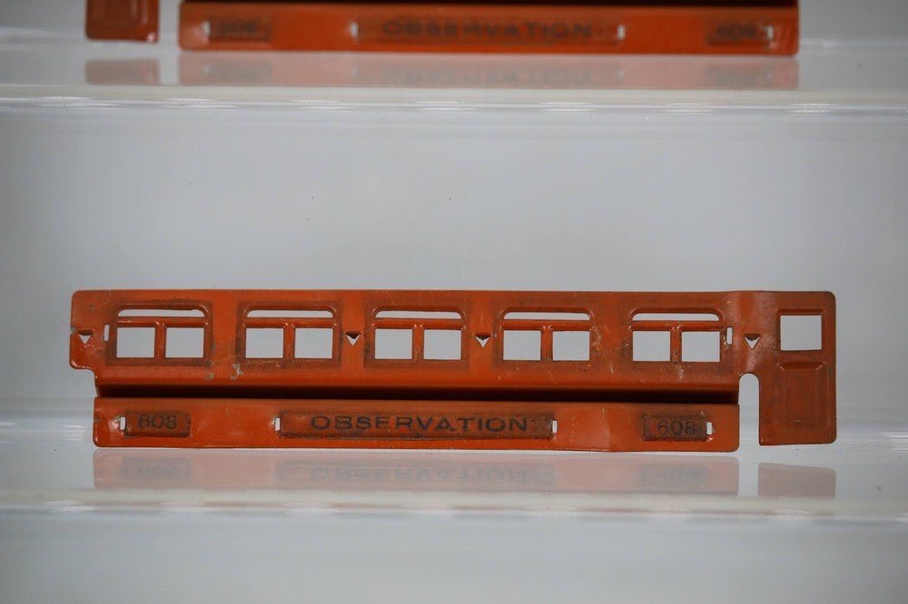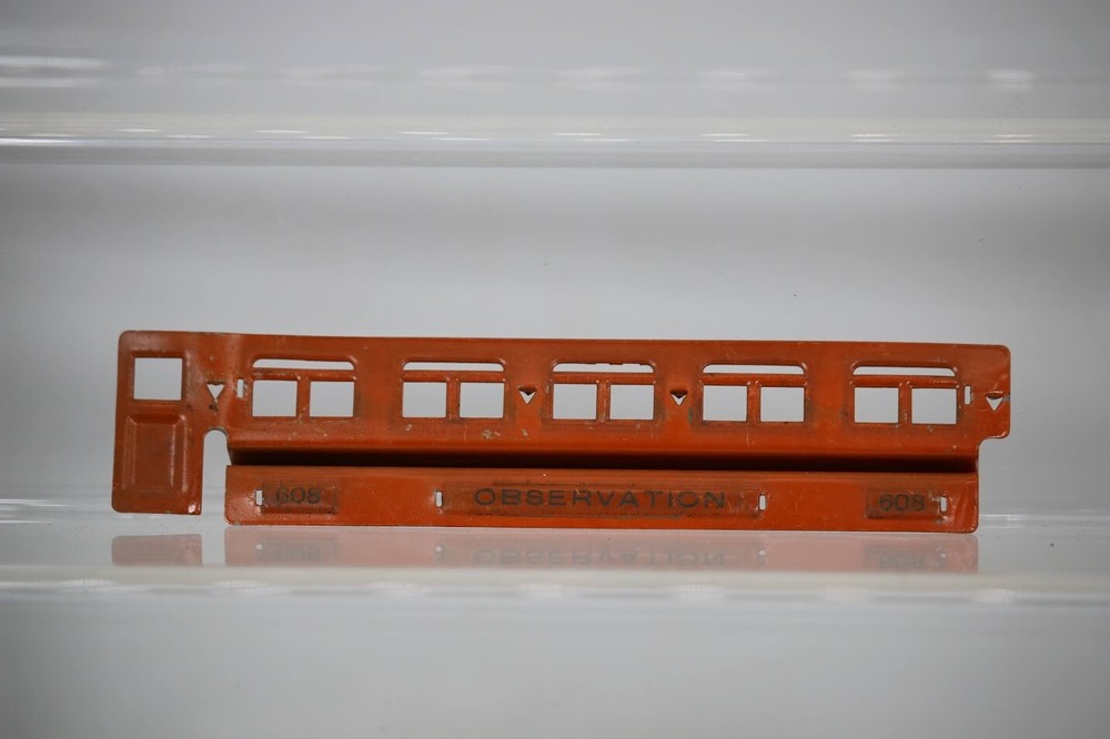 Lionel Pre-war O Gauge #608 Observation Passenger Car Window Insert SKU#007141 Look closely at the pictures to see further details. We ships USPS PLEASE see photos for detailed condition!! PLEASE LOOK AT THE PHOTOS CAREFULLY BEFORE PURCHASING!! If you are purchasing more than one item from us and would like combined shipping, PLEASE request an adjusted invoice from us while still in the cart and BEFORE paying. eBay does not usually calculate combined shipping accurately and you might get overcharged. Please be aware that when we photograph items, we use lighting that will show the details well. Although we try to present the product as accurately as possible, the lighting may affect the overall look of the item by appearing lighter/darker or possibly a different hue than the actual item. Depending on the type of lighting you have in your home, there may be some differences between the photos and the actual item. If this is a concern of yours, please feel free to request additional photos made in natural lighting or ask for a more detailed description of the item PRIOR TO PURCHASE! PLEASE NOTE: We greatly appreciate your interest in our item for sale. We look forward to a pleasant, quick and satisfying transaction for everybody, so please note the following information before bidding. Thank you! ITEM DESCRIPTIONS: * We will try to describe items well and provide plenty of photos. Please review these carefully before bidding or purchasing. * Only the items pictured and described are what you will receive when purchased. * We will occasionally offer an item clearly marked "AS-IS". This means that we are not sure if it works because we are unable to test it for whatever reason. We will offer these at a discounted price then a similar "working" item. It is possible that these items will work fine, but it also is possible that these items are more useful for their parts. Please only bid on or purchase these items if you are well aware of this, as we will only provide refunds of actual item price (no shipping cost refunds) for these items. * If you have any questions that aren't addressed by the descriptions or photos, please feel free to ask before you bid. * There may be pieces that are missing or broken including, but not limited to, couplers, brake wheels, steps, ladders, railings, minor rust spots or cracks, etc. May need detailed cleaning SHIPPING: * We usually do not offer shipping to international addresses, but ARE WILLING TO TAKE CONSIDERATIONS. * We try to pack items as carefully as possible, but damage may occur during shipping. If you receive an item that was damaged in shipping, please contact us and we will work with you to resolve the problem. * We will combine shipping costs for all items the same buyer purchases from us within 2 days. Please wait to pay for items until you're done shopping with us. Please contact us if you're expecting to buy more items from us, or to have us adjust the shipping costs. * We will usually ship items out within 24 hours of payment being received Sunday through Friday at noon. We will notify the buyer if there will be a delay in shipping for some reason. Please allow additional time for holidays and weekends when the post office is closed. If payment is received after noon (EST) on Friday, the item might not be shipped until the following Monday. * We do try to recycle shipping materials as much as possible. RETURNS: We abide by eBay's Money Back Guarantee. We definitely want our customers to be happy with their purchase! You may return an item within 30 days of receiving it with the following guidelines: * If the item is defective or damaged (unless we clearly marked the listing "AS-IS"), the buyer will receive a full refund after the buyer returns it and it is received by us. Customers who falsely claim their item is defective, damaged, or not as described in order to receive a full refund and free return shipping will be permanently blocked from making future purchases from us. * If the item is as described (including "AS-IS" items) and the buyer decides for any other reason than defective/damaged to return it, only the actual price of the item will be refunded once it has been returned and it is received by us. The buyer will be asked to pay all original and return shipping charges. This includes all reasons other than defective/damaged, including wrong size, wrong type, changed mind, etc. All "AS-IS" items will fall into this category of return. Please make sure the item is what you want before purchasing it. * Please contact us before initiating a refund request. FEEDBACK: We always leave feedback at the end of transaction. We consider the transaction to be over when we receive feedback from the buyer confirming the item arrived satisfactorily. If you are unsatisfied with your purchase please contact us before leaving neutral or negative feedback. WE APPRECIATE POSITIVE FEEDBACK IF YOU ARE SATISFIED WITH YOUR PURCHASE! THANK YOU FOR YOUR INTEREST IN THIS ITEM!