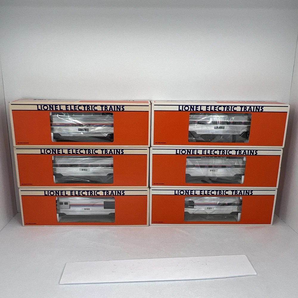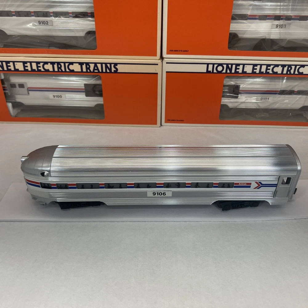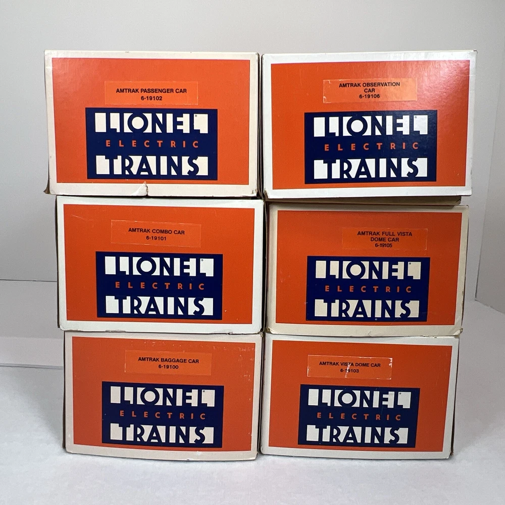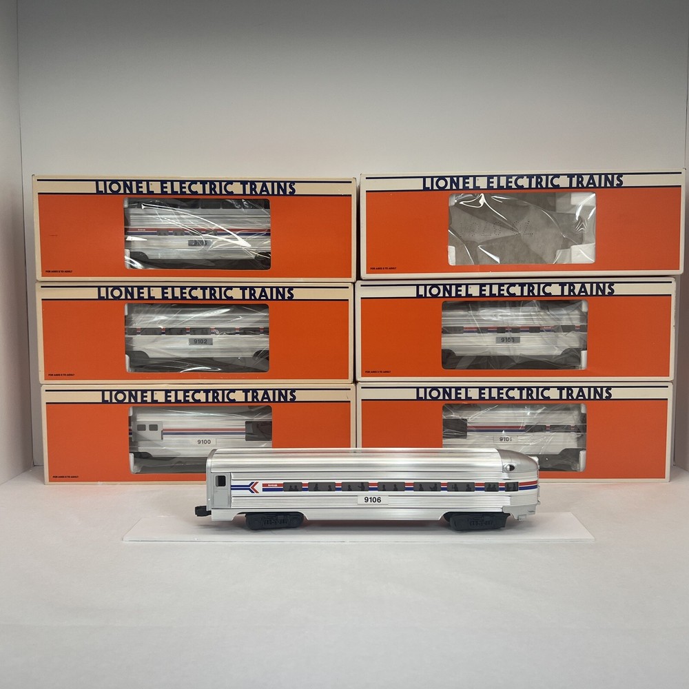 LIONEL AMTRAK ALUMINUM 15" 6 CAR PASSENGER SET O GAUGE THREE RAIL INCLUDES 6-19100 BAGGAGE CAR 6-19101 COMBO CAR 6-19102 PASSENGER CAR 6-19103 VISTA DOME CAR 6-19105 FULL VISTA DOME CAR 6-19106 OBSERVATION CAR NEW!!. ORIGINAL BOXES. BEAUTIFUL 15" ALUMINUM SET.. NO TRACK TIME. CARS WERE DISPLAYED. FEATURES Aluminum bodies Die-cast trucks with magnetic couplers. Passenger Silhouettes Length: 15" each WILL BE PACKED TO ENSURE SAFE DELIVERY! Winning US bidder receives FREE SHIPPING USPS Priority UPS!! Canada Priority shipping is available . All other countries please email for a mailing quote. Thanks for looking! I ship everyday!!!!