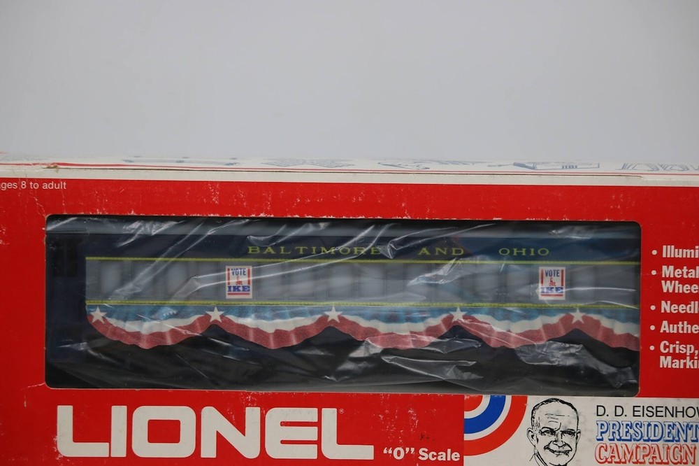 Lionel O 6-9529, B&O DD Eisenhower Presidential Campaign Passenger Car Look closely at the pictures to see further details. We ships USPS PLEASE see photos for detailed condition!! PLEASE LOOK AT THE PHOTOS CAREFULLY BEFORE PURCHASING!! If you are purchasing more than one item from us and would like combined shipping, PLEASE request an adjusted invoice from us while still in the cart and BEFORE paying. eBay does not usually calculate combined shipping accurately and you might get overcharged. Please be aware that when we photograph items, we use lighting that will show the details well. Although we try to present the product as accurately as possible, the lighting may affect the overall look of the item by appearing lighter/darker or possibly a different hue than the actual item. Depending on the type of lighting you have in your home, there may be some differences between the photos and the actual item. If this is a concern of yours, please feel free to request additional photos made in natural lighting or ask for a more detailed description of the item PRIOR TO PURCHASE! PLEASE NOTE: We greatly appreciate your interest in our item for sale. We look forward to a pleasant, quick and satisfying transaction for everybody, so please note the following information before bidding. Thank you! ITEM DESCRIPTIONS: * We will try to describe items well and provide plenty of photos. Please review these carefully before bidding or purchasing. * Only the items pictured and described are what you will receive when purchased. * We will occasionally offer an item clearly marked "AS-IS". This means that we are not sure if it works because we are unable to test it for whatever reason. We will offer these at a discounted price then a similar "working" item. It is possible that these items will work fine, but it also is possible that these items are more useful for their parts. Please only bid on or purchase these items if you are well aware of this, as we will only provide refunds of actual item price (no shipping cost refunds) for these items. * If you have any questions that aren't addressed by the descriptions or photos, please feel free to ask before you bid. * There may be pieces that are missing or broken including, but not limited to, couplers, brake wheels, steps, ladders, railings, minor rust spots or cracks, etc. May need detailed cleaning SHIPPING: * We usually do not offer shipping to international addresses, but ARE WILLING TO TAKE CONSIDERATIONS. * We try to pack items as carefully as possible, but damage may occur during shipping. If you receive an item that was damaged in shipping, please contact us and we will work with you to resolve the problem. * We will combine shipping costs for all items the same buyer purchases from us within 2 days. Please wait to pay for items until you're done shopping with us. Please contact us if you're expecting to buy more items from us, or to have us adjust the shipping costs. * We will usually ship items out within 24 hours of payment being received Sunday through Friday at noon. We will notify the buyer if there will be a delay in shipping for some reason. Please allow additional time for holidays and weekends when the post office is closed. If payment is received after noon (EST) on Friday, the item might not be shipped until the following Monday. * We do try to recycle shipping materials as much as possible. RETURNS: We abide by eBay's Money Back Guarantee. We definitely want our customers to be happy with their purchase! You may return an item within 30 days of receiving it with the following guidelines: * If the item is defective or damaged (unless we clearly marked the listing "AS-IS"), the buyer will receive a full refund after the buyer returns it and it is received by us. Customers who falsely claim their item is defective, damaged, or not as described in order to receive a full refund and free return shipping will be permanently blocked from making future purchases from us. * If the item is as described (including "AS-IS" items) and the buyer decides for any other reason than defective/damaged to return it, only the actual price of the item will be refunded once it has been returned and it is received by us. The buyer will be asked to pay all original and return shipping charges. This includes all reasons other than defective/damaged, including wrong size, wrong type, changed mind, etc. All "AS-IS" items will fall into this category of return. Please make sure the item is what you want before purchasing it. * Please contact us before initiating a refund request. FEEDBACK: We always leave feedback at the end of transaction. We consider the transaction to be over when we receive feedback from the buyer confirming the item arrived satisfactorily. If you are unsatisfied with your purchase please contact us before leaving neutral or negative feedback. WE APPRECIATE POSITIVE FEEDBACK IF YOU ARE SATISFIED WITH YOUR PURCHASE! THANK YOU FOR YOUR INTEREST IN THIS ITEM! Look closely at the pictures to see further details. PLEASE see photos for detailed condition!! PLEASE LOOK AT THE PHOTOS CAREFULLY BEFORE PURCHASING!! If you are purchasing more than one item from us and would like combined shipping, PLEASE request an adjusted invoice from us while still in the cart and BEFORE paying. eBay does not usually calculate combined shipping accurately and you might get overcharged. Please be aware that when we photograph items, we use lighting that will show the details well. Although we try to present the product as accurately as possible, the lighting may affect the overall look of the item by appearing lighter/darker or possibly a different hue than the actual item. Depending on the type of lighting you have in your home, there may be some differences between the photos and the actual item. If this is a concern of yours, please feel free to request additional photos made in natural lighting or ask for a more detailed description of the item PRIOR TO PURCHASE! The