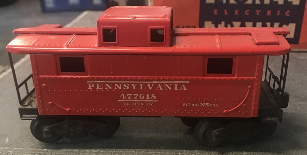 The Lionel 2472 O/27 Gauge Pennsylvanian PRR 477618 Red Tinplate Caboose Car is a classic model train accessory designed for O gauge model railroads. This caboose car features a vibrant red color and is made of durable tinplate material, perfect for collectors and hobbyists alike. It is a detailed replica of the Pennsylvanian caboose car, with authentic markings and design elements that add to the authenticity of any train layout. Perfect for enhancing your collection or adding a touch of nostalgia to your display, this caboose car is a must-have for any model railroad enthusiast.