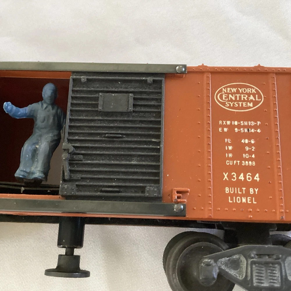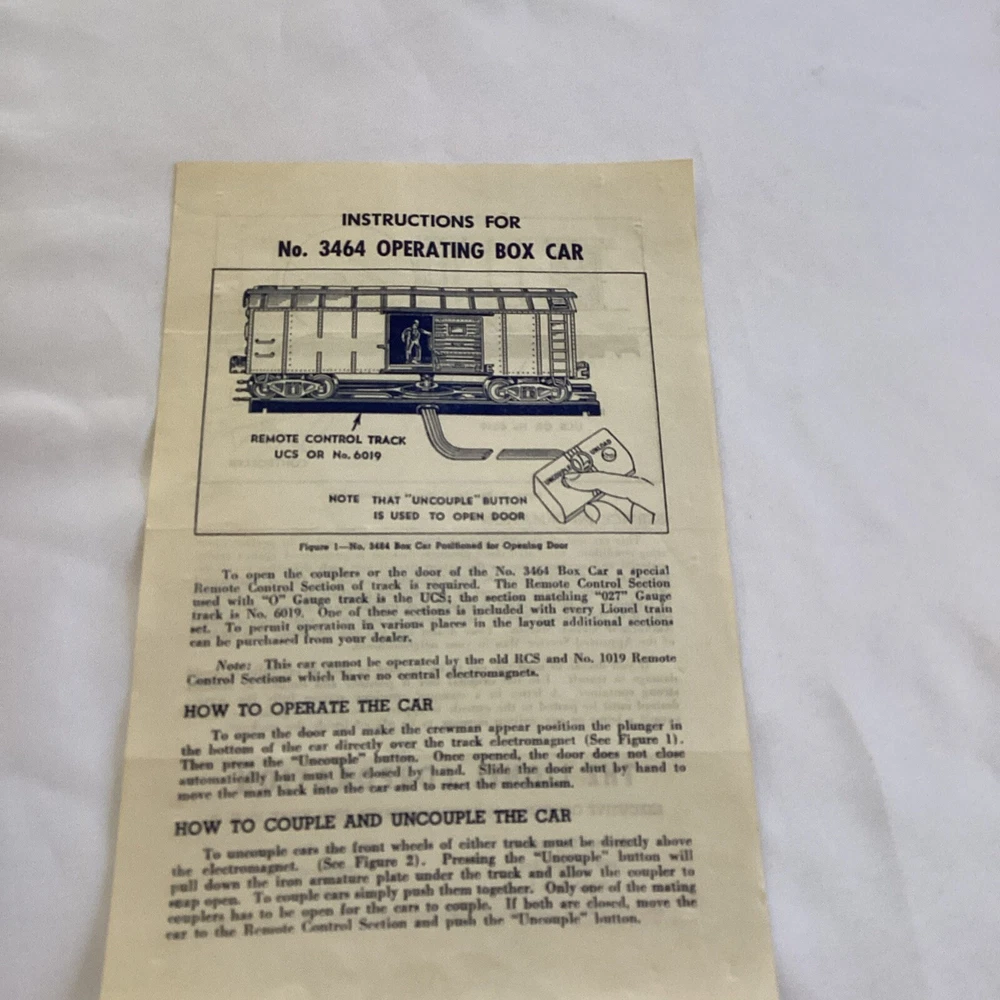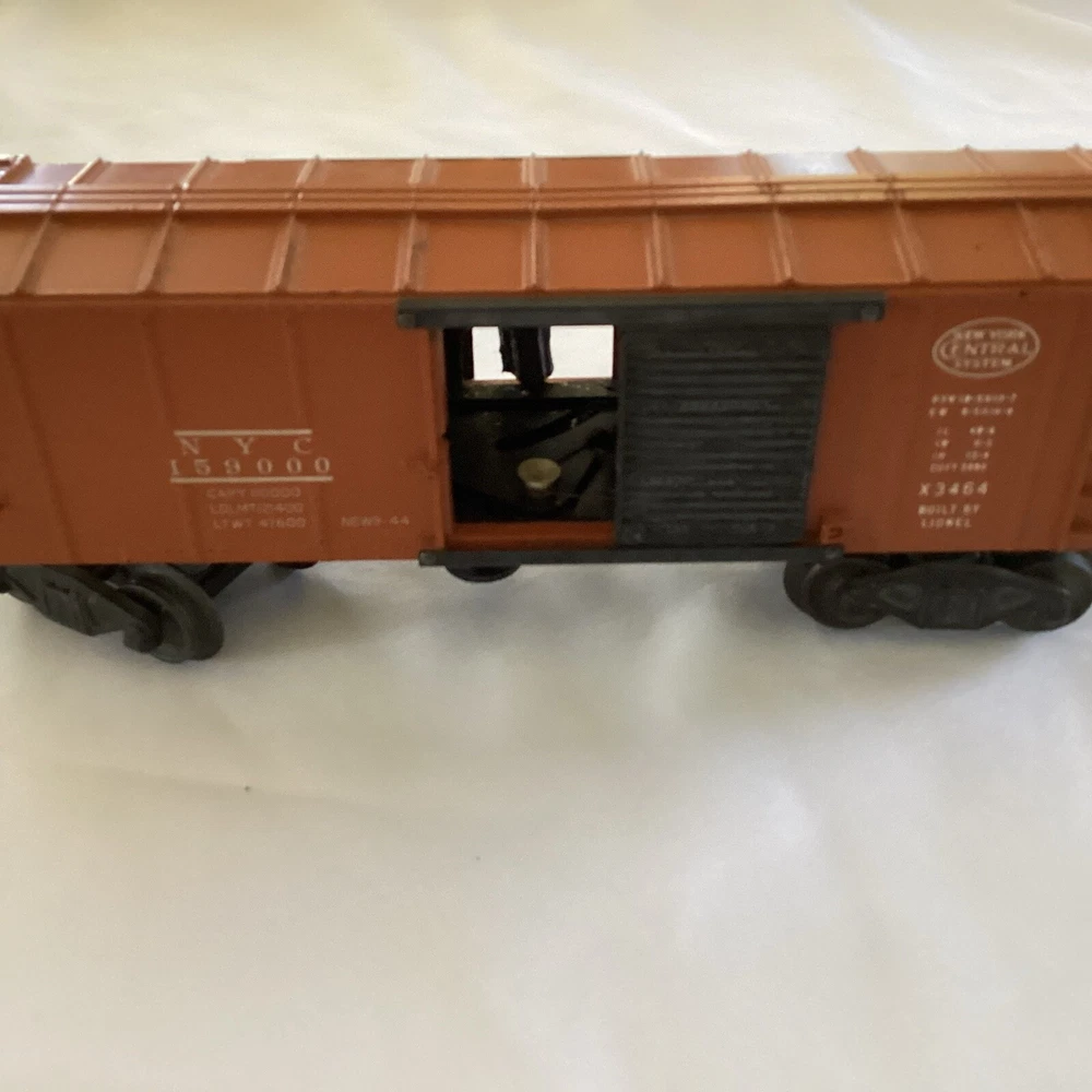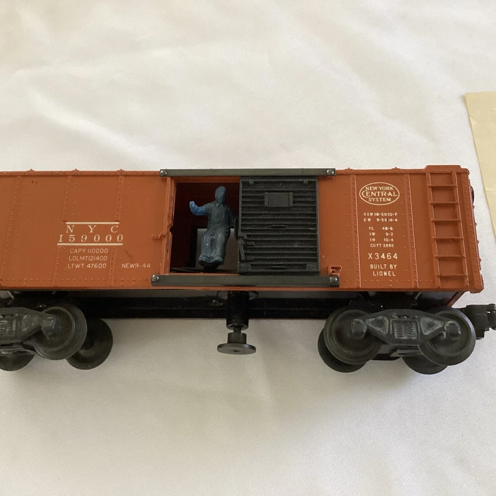 This auction is for Lionel number 3464 operating box car. It is brown and marked New York Central system. It has sliding doors with a man that comes out. It comes with its original instructions. It is used, but in nice condition. Please look at the pictures over carefully And email questions or for more pictures. The San Luis Obispo Railroad Museum, SLORRM, located in San Luis Obispo California is housed in the original 1894 Southern Pacific Railroad Freighthouse. We are currently raising money for new projects and appreciate your looking and bidding. If you are in the California Central Coast area, please stop by the museum or visit on-line.