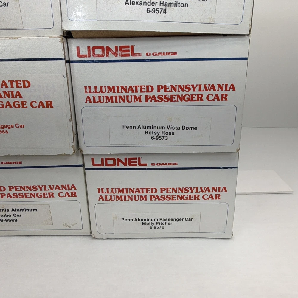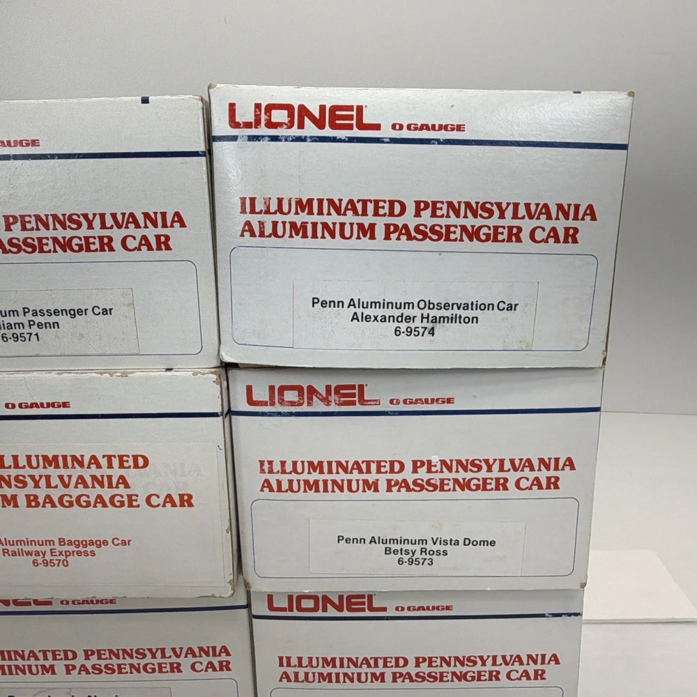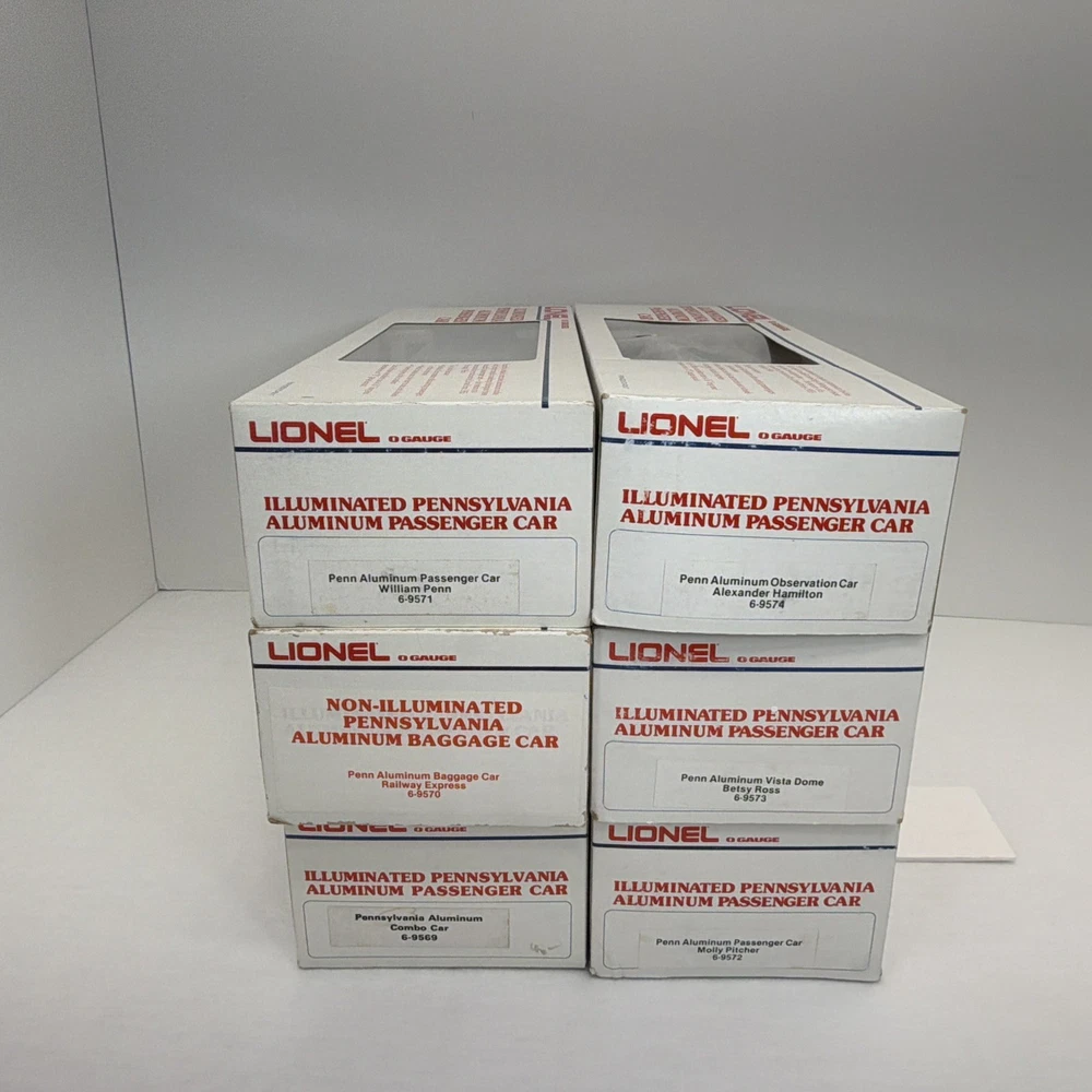 LIONEL PENNSYLVANIA ALUMINUM 15" 8 CAR PASSENGER SET O GAUGE THREE RAIL INCLUDES 6-9569 PAUL REVERE COMBO CAR 6-9570 REA BAGGAGE CAR 6-9571 WILLIAM PENN PASSENGER CAR 6-9572 MOLLY PITCHER PASSENGER CAR 6-9573 BETSY ROSS VISTA DOME CAR 6-9574 ALEXANDER HAMILTON OBSERVATION CAR NEW!!. ORIGINAL BOXES. 15" ALUMINUM SET.. POPULAR SET. NO TRACK TIME. BOXES IN PRETTY GOOD SHAPE FOR THE ERA. FEATURES Aluminum bodies Die-cast trucks with magnetic couplers. Passenger Silhouettes Length: 15" each WILL BE PACKED TO ENSURE SAFE DELIVERY! Winning US bidder receives FREE SHIPPING USPS Priority UPS !! Canada Priority shipping is available . All other countries please email for a mailing quote. Thanks for looking! I ship everyday!!!!