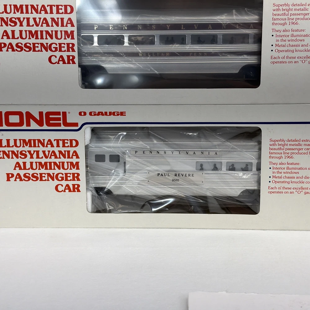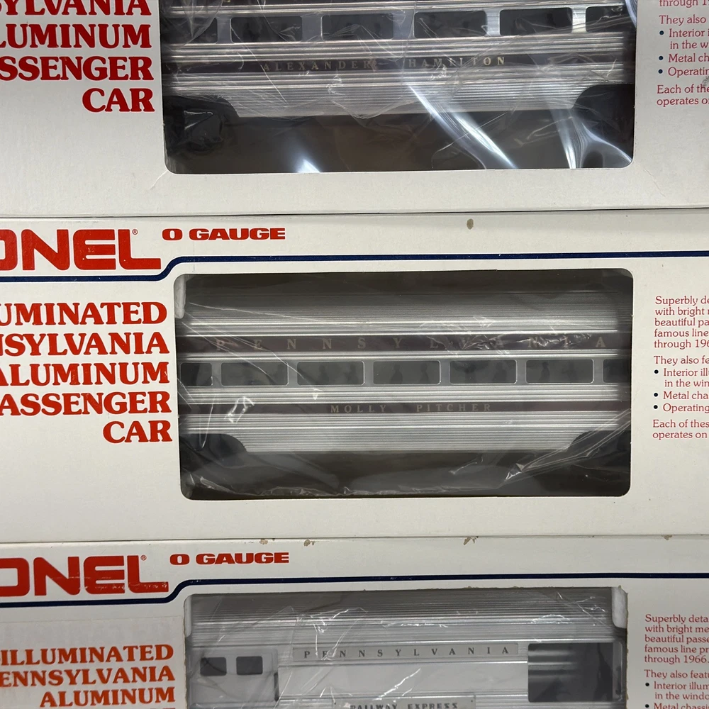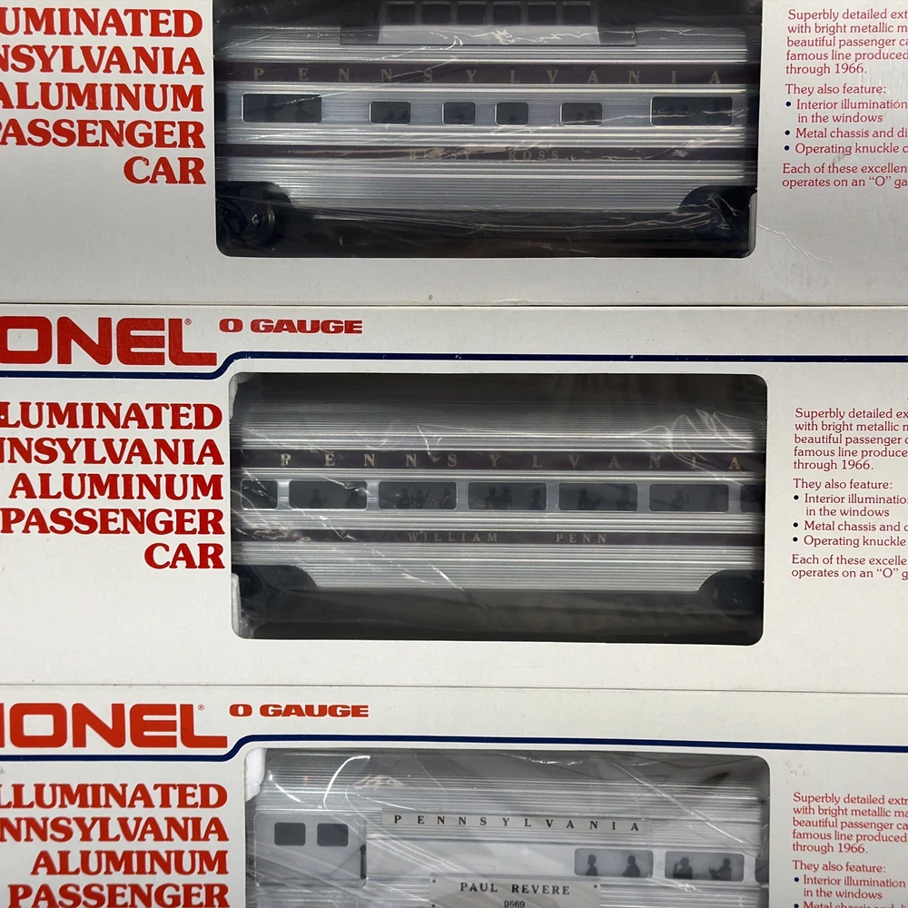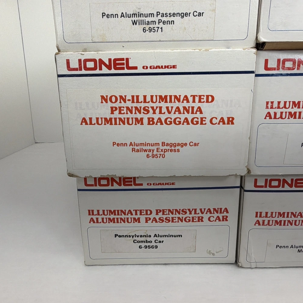 LIONEL PENNSYLVANIA ALUMINUM 15" 8 CAR PASSENGER SET O GAUGE THREE RAIL INCLUDES 6-9569 PAUL REVERE COMBO CAR 6-9570 REA BAGGAGE CAR 6-9571 WILLIAM PENN PASSENGER CAR 6-9572 MOLLY PITCHER PASSENGER CAR 6-9573 BETSY ROSS VISTA DOME CAR 6-9574 ALEXANDER HAMILTON OBSERVATION CAR NEW!!. ORIGINAL BOXES. 15" ALUMINUM SET.. POPULAR SET. NO TRACK TIME. BOXES IN PRETTY GOOD SHAPE FOR THE ERA. FEATURES Aluminum bodies Die-cast trucks with magnetic couplers. Passenger Silhouettes Length: 15" each WILL BE PACKED TO ENSURE SAFE DELIVERY! Winning US bidder receives FREE SHIPPING USPS Priority UPS !! Canada Priority shipping is available . All other countries please email for a mailing quote. Thanks for looking! I ship everyday!!!!