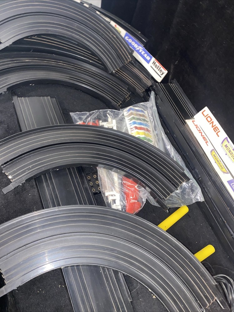 Get ready to race with this Lionel Power Passers Slot Car set! With 14 pieces of track and lots of accessories,The set comes with two power controllers, so you can control the speed of your car as you navigate through the curves and straightaways. A power supply 2 pieces of high back track 5 straight pieces. Five curves and 2 station pieces. Also has a bag of parts and pieces. NO CARS. This set is perfect for someone with an existing track that wishes to expand. . The accessories included allow you to customize your track and add some extra excitement to your races. Whether you're a fan of slot cars or just looking for a new hobby, this Lionel Power Passers set is sure to provide hours of entertainment. Pieces have light dust and tracks have rust in areas. Untested. Unsure if it works. Sold as is.
