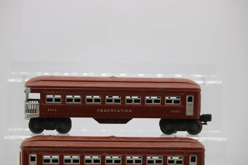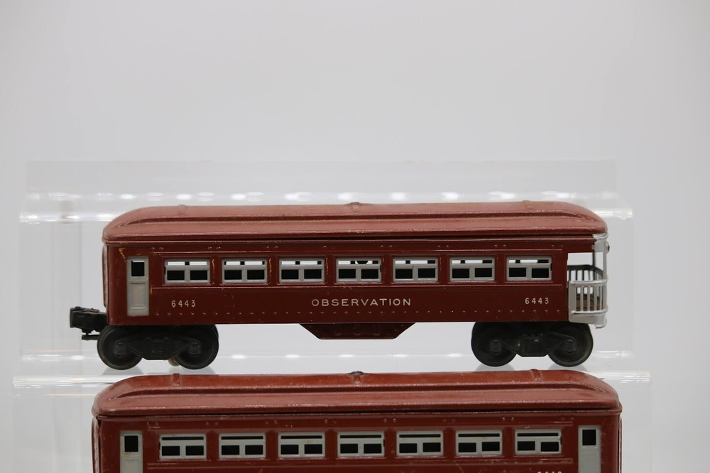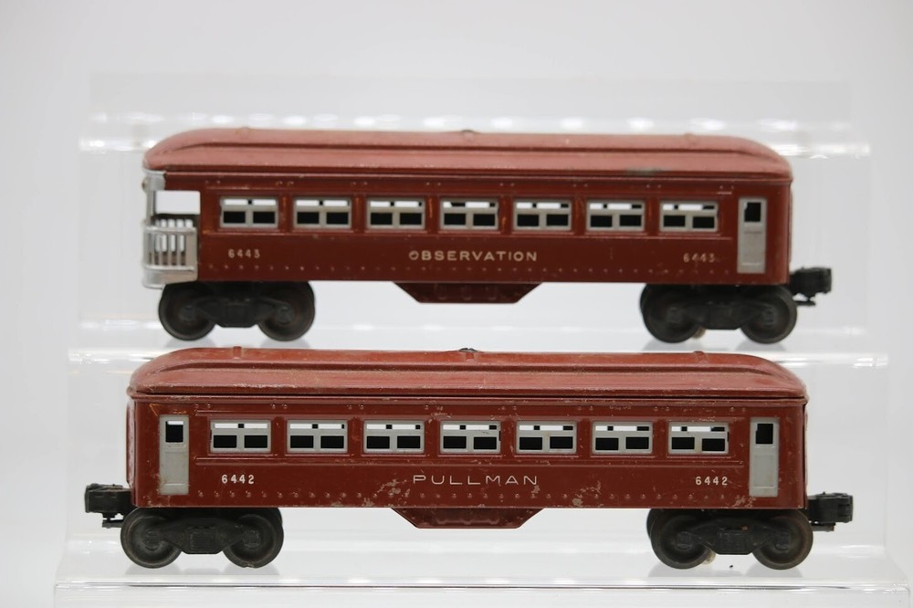 Lionel Post-War Tin Litho Pullman Passenger Car 6442 & Observation Car 6443 PLEASE see photos for detailed condition!! PLEASE LOOK AT THE PHOTOS CAREFULLY BEFORE PURCHASING!! If you are purchasing more than one item from us and would like combined shipping, PLEASE request an adjusted invoice from us while still in the cart and BEFORE paying. eBay does not usually calculate combined shipping accurately and you might get overcharged. Please be aware that when we photograph items, we use lighting that will show the details well. Although we try to present the product as accurately as possible, the lighting may affect the overall look of the item by appearing lighter/darker or possibly a different hue than the actual item. Depending on the type of lighting you have in your home, there may be some differences between the photos and the actual item. If this is a concern of yours, please feel free to request additional photos made in natural lighting or ask for a more detailed description of the item PRIOR TO PURCHASE! PLEASE NOTE: We greatly appreciate your interest in our item for sale. We look forward to a pleasant, quick and satisfying transaction for everybody, so please note the following information before bidding. Thank you! ITEM DESCRIPTIONS: * We will try to describe items well and provide plenty of photos. Please review these carefully before bidding or purchasing. * Only the items pictured and described are what you will receive when purchased. * We will occasionally offer an item clearly marked "AS-IS". This means that we are not sure if it works because we are unable to test it for whatever reason. We will offer these at a discounted price than a similar "working" item. It is possible that these items will work fine, but it also is possible that these items are more useful for their parts. Please only bid on or purchase these items if you are well aware of this, as we will only provide refunds of actual item price (no shipping cost refunds) for these items. * If you have any questions that aren't addressed by the descriptions or photos, please feel free to ask before you bid. SHIPPING: * We usually do not offer shipping to international addresses, but ARE WILLING TO TAKE CONSIDERATIONS. * We try to pack items as carefully as possible, but damage may occur during shipping. If you receive an item that was damaged in shipping, please contact us and we will work with you to resolve the problem. * We will combine shipping costs for all items the same buyer purchases from us within 2 days. Please wait to pay for items until you're done shopping with us. Please contact us if you're expecting to buy more items from us, or to have us adjust the shipping costs. * We will usually ship items out within 24 hours of payment being received Sunday through Friday at noon. We will notify the buyer if there will be a delay in shipping for some reason. Please allow additional time for holidays and weekends when the post office is closed. If payment is received after noon (EST) on Friday, the item might not be shipped until the following Monday. * We do try to recycle shipping materials as much as possible. RETURNS: We abide by eBay's Money Back Guarantee. We definitely want our customers to be happy with their purchase! You may return an item within 30 days of receiving it with the following guidelines: * If the item is defective or damaged (unless we clearly marked the listing "AS-IS"), the buyer will receive a full refund after the buyer returns it and it is received by us. Customers who falsely claim their item is defective, damaged, or not as described in order to receive a full refund and free return shipping will be permanently blocked from making future purchases from us. * If the item is as described (including "AS-IS" items) and the buyer decides for any other reason than defective/damaged to return it, only the actual price of the item will be refunded once it has been returned and it is received by us. The buyer will be asked to pay all original and return shipping charges. This includes all reasons other than defective/damaged, including wrong size, wrong type, changed mind, etc. All "AS-IS" items will fall into this category of return. Please make sure the item is what you want before purchasing it. * Please contact us before initiating a refund request. FEEDBACK: We always leave feedback at the end of transaction. We consider the transaction to be over when we receive feedback from the buyer confirming the item arrived satisfactorily. If you are unsatisfied with your purchase please contact us before leaving neutral or negative feedback. WE APPRECIATE POSITIVE FEEDBACK IF YOU ARE SATISFIED WITH YOUR PURCHASE! THANK YOU FOR YOUR INTEREST IN THIS ITEM!