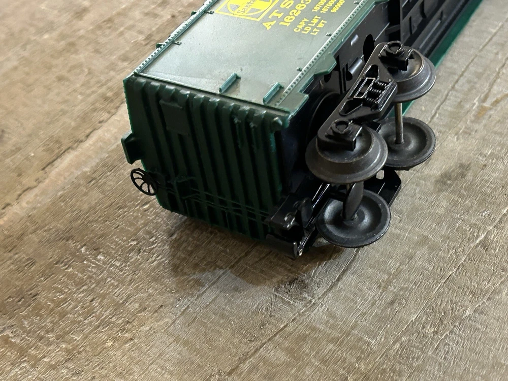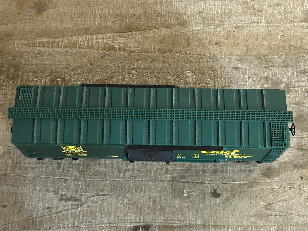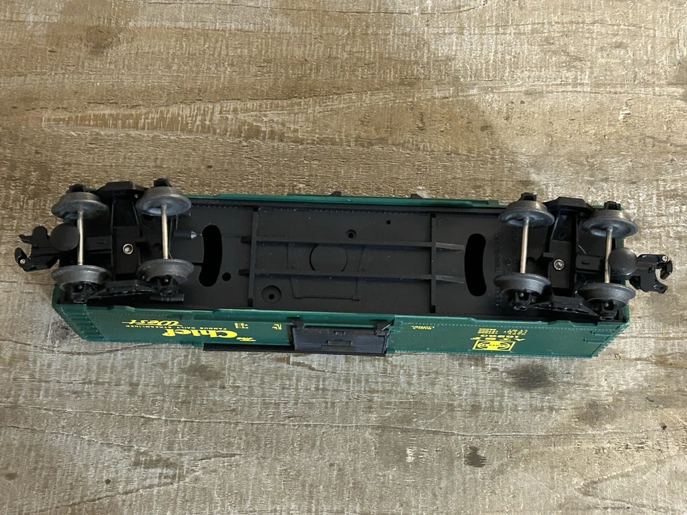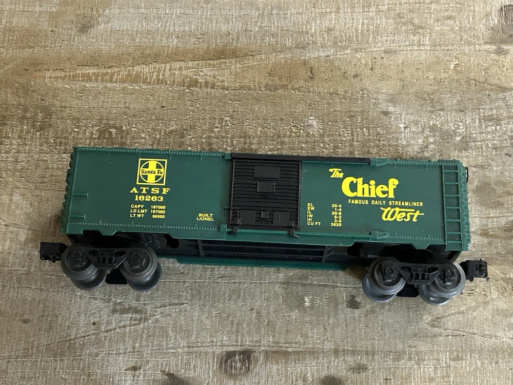 This Lionel Santa Fe The Chief Box Car #16263 is a great addition to any model railroad collection. With its three-rail system and green color, it accurately represents the Santa Fe corporate roadname. The box car is made of plastic and features the transportation theme of the Santa Fe replica. It is compatible with O gauge tracks and will make a great display piece for any railroad enthusiast.